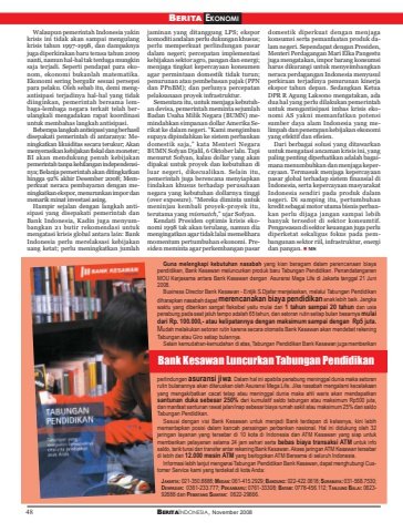 48 BERITAINDONESIA, November 2008BERITA EKONOMIGuna melengkapi kebutuhan nasabah yang kian beragam dalam perencanaan biayapendidikan, Bank Kesawan meluncurkan produk baru Tabungan Pendidikan. PenandatangananMOU Kerjasama antara Bank Kesawan dengan Asuransi Mega Life di Jakarta tanggal 21 Juni2008.Business Director Bank Kesawan - Entjik S.Djafar menjelaskan, melalui Tabungan Pendidikandiharapkan nasabah dapat merencanakan biaya pendidikan anak lebih baik. Jangkawaktu yang diberikan sangat fleksibel yaitu mulai dari 1 tahun sampai 20 tahun dan usiapenabung pada saat jatuh tempo adalah 65 tahun, dan setoran rutin setiap bulan besarnya mulaidari Rp. 100.000,- atau kelipatannya dengan maksimum sampai dengan Rp5 juta.Mudah melakukan setoran rutin karena secara otomatis Bank Kesawan akan mendebet rekeningTabungan atau Giro setiap bulannya.Selain kemudahan-kemudahan di atas, Tabungan Pendidikan Bank Kesawan juga memberikanJAKARTA: 021-350.8888; MEDAN: 061-415.2929; BANDUNG: 022-422.0618; SURABAYA: 031-568.7530;DENPASAR: 0361-233.777; PEKANBARU: 0761-33308; BATAM: 0778-456.112; TANJUNG BALAI: 0623-92688 dan PEMATANG SIANTAR: 0622-29666.perlindungan asuransi jiwa. Dalam hal ini apabila penabung meninggal dunia maka setoranrutin bulanannya akan diteruskan oleh Asuransi Mega Life. Jika nasabah mengalami kecelakaanyang mengakibatkan cacat tetap atau meninggal dunia maka ahli waris akan mendapatkansantunan duka sebesar 250% dari kumulatif saldo tabungan atau maksimum Rp500 juta,dan manfaat santunan rawat jalan/inap sebesar biaya rumah sakit atau maksimum 25% dari saldoTabungan Pendidikan.Sesuai dengan visi Bank Kesawan untuk menjadi Bank terdepan di kelasnya, kini lebihmemantapkan posisi dalam kancah persaingan perbankan nasional. Hal ini didukung oleh 32jaringan layanan yang tersebar di 10 kota di Indonesia dan ATM Kesawan yang siap untukmemberikan pelayanan selama 24 jam sehari serta bebas biaya transaksi ATM untuk infosaldo, tarik tunai dan transfer antar rekening Bank Kesawan. Akses jaringan ATM Kesawan tersebardi lebih dari 12.000 mesin ATM yang berlogokan ATM Bersama di seluruh Indonesia.Informasi lebih lanjut mengenai Tabungan Pendidikan Bank Kesawan, dapat menghubungi Customer Service kami yang terdekat di kota Anda:Bank Kesawan Luncurkan Tabungan PendidikanWalaupun pemerintah Indonesia yakinkrisis ini tidak akan sampai mengulangkrisis tahun 1997-1998, dan dampaknyajuga diperkirakan baru terasa tahun 2009nanti, namun hal-hal tak terduga mungkinsaja terjadi. Seperti pendapat para ekonom, ekonomi bukanlah matematika.Ekonomi sering bergulir sesuai persepsipara pelaku. Oleh sebab itu, demi mengantisipasi terjadinya hal-hal yang tidakdiinginkan, pemerintah bersama lembaga-lembaga negara terkait telah berulangkali mengadakan rapat koordinasiuntuk membahas langkah antisipasi.Beberapa langkah antisipasi yang berhasildisepakati pemerintah di antaranya: Meningkatkan likuiditas secara terukur; Akanmenyerasikan kebijakan fiskal dan moneter;BI akan mendukung penuh kebijakanpemerintah tanpa kehilangan independensinya; Belanja pemerintah akan ditingkatkanhingga 92% akhir Desember 2008; Memperkuat neraca pembayaran dengan meningkatkan ekspor, menurunkan impor danmenarik minat investasi asing.Hampir sejalan dengan langkah antisipasi yang disepakati pemerintah danBank Indonesia, Kadin juga menyumbangkan 21 butir rekomendasi untukmengatasi krisis global antara lain: BankIndonesia perlu merelaksasi kebijakanuang ketat; perlu meningkatkan jumlahjaminan yang ditanggung LPS; eksporkomoditi andalan perlu dukungan khusus;perlu memperkuat perlindungan pasardalam negeri; percepatan implementasikebijakan sektor agro, pangan dan energi;menjaga tingkat kepercayaan konsumenagar permintaan domestik tidak turun;penurunan atau pembebasan pajak (PPNdan PPnBM); dan perlunya percepatanpelaksanaan proyek infrastruktur.Sementara itu, untuk menjaga kebutuhan devisa, pemerintah meminta sejumlahBadan Usaha Milik Negara (BUMN) memindahkan simpanan dollar Amerika Serikat ke dalam negeri. “Kami mengimbausupaya dipindahkan ke sistem perbankandomestik saja,” kata Menteri NegaraBUMN Sofyan Djalil, 6 Oktober lalu. Tapimenurut Sofyan, kalau dollar yang akandipakai untuk proyek dan kebutuhan diluar negeri, dikecualikan. Selain itu,pemerintah juga berencana menyiapkantindakan khusus terhadap perusahaannegara yang kebutuhan dollarnya tinggi(over exposure). “Mereka diminta untukmeninjau kembali proyek-proyek itu,terutama yang mismatch,” ujar Sofyan.Kendati Presiden optimis krisis ekonomi 1998 tak akan terulang, namun diamengingatkan agar tidak lalai memeliharamomentum pertumbuhan ekonomi. Presiden meminta agar perkembangan pasardomestik diperkuat dengan menjagakonsumsi serta pemanfaatan produk dalam negeri. Sependapat dengan Presiden,Menteri Perdagangan Mari Elka Pangestujuga mengatakan, impor barang konsumsiharus dikurangi untuk menyeimbangkanneraca perdagangan Indonesia menyusulperkiraan terjadinya penurunan kinerjaekspor tahun depan. Sedangkan KetuaDPR R Agung Laksono mengatakan, adadua hal yang perlu dilakukan pemerintahuntuk mengantisipasi imbas krisis ekonomi AS yakni memanfatkan potensisumber daya alam Indonesia yang melimpah dan penerapan kebijakan ekonomiyang efektif dan efisien.Dari berbagai solusi yang ditawarkanuntuk mengatasi ancaman krisis ini, yangpaling penting diperhatikan adalah bagaimana menumbuhkan dan menjaga kepercayaan. Termasuk menjaga kepercayaanpasar global terhadap sistem finansial diIndonesia, serta kepercayaan masyarakatIndonesia sendiri pada produk dalamnegeri. Di samping itu, pertumbuhankredit sebagai motor utama bisnis perbankan perlu dijaga jangan sampai lebihbanyak tersedot di sektor konsumtif.Pengawasan di sektor keuangan juga perludiperketat sekaligus fokus pada pembangunan sektor riil, infrastruktur, energidan pangan. MS