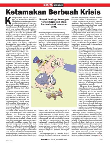 BERITAINDONESIA, November 2008 49BERITA EKONOMIKetamakan Berbuah KrisisBanyak lembaga keuanganterjerembab oleh krisiskarena tamak memutaruang.eterpurukan sistem keuangansaat ini berawal dari kebijakanThe Fed menerapkan suku bungarendah pada era awal 2001-an,ditambah maraknya inovasi produk dipasar keuangan. Kebijakan bunga rendahini di satu sisi mendorong terjadinyabooming kredit yang luar biasa, sehinggamenjadikan belanja masyarakat meningkat, sedangkan tabungan berkurang.Kenyataan ini membuat gaya hidupmasyarakat Amerika sangat konsumtifberbelanja di luar kemampuan.Pada bagian lain, bunga rendah inidimanfaatkan masyarakat Amerika yangmemiliki uang lebih sebagai kesempatanberinvestasi dengan membeli rumahsebanyak-banyaknya, dan instrumen investasi lainnya. Sektor properti menjelma menjadibisnis menggiurkan untuk berinvestasi. Sayangnya modalinvestasi ini, sebagian besarberasal dari pinjaman lembagakeuangan. Pada saat yang sama,bank pun siap mengguyurkanberbagai kredit, termasuk kredit perumahan yang pada saatitu permintaannya cukup bagus. Dan untuk memperolehsumber dana murah, bank punberlomba menerbitkan apayang dinamakan surat utangkredit perumahan kualitas rendah yang dikenal secondarymortgage facility (SMF). Aspekkehati-hatian dalam pengucuran kredit dibuang oleh pihakbank.SMF ini seperti bundel suratsurat rumah (seperti sertifikatrumah) yang diagunkan/dijaminkan debitor ke bank. Lalubank membuatnya menjadi surat utang (paper). Surat utangini kemudian ditawarkan kepada investor untuk dibeli olehperusahaan Fannie Mae, yangmemang fungsinya menyediakan dana untuk penyediaan rumah dengan menerima gadai surat-surat rumahtersebut, alias membeli hipotik bank.Uang dari penjualan surat utang ini olehbank diputarkan kembali sebagai kredityang diberikan kepada nasabah, termasukjuga kredit pemilikan rumah. Dari pembayaran bunga dan pokok kredit tadi,sebagian oleh bank dibayarkan ke FannieMae untuk menebus gadai hipotiknya.Surat itu pun diperdagangkan oleh FannieMae. Produk ini ternyata memberikan return yang bagus, bukan saja kepada investor yang membeli apertemen/rumah, jugainvestor yang membeli surat utang.Bank pun merasa memperoleh returnyang besar dari bunga kredit, mengingatkemampuan kreditnya pun bertambahdengan adanya dana tambahan dari suratberharga (SMF) yang dibeli oleh FannieMae. Kenyataan ini menjadi salah satu penyebab ekonomi Amerika sangat bubble.Karena return yang menggiurkan,vestment Bank seperti Lehman Brothersdan merembet ke mana-mana, PNBParibas, Bearstern dan lain-lain. Menurutperkiraan, dana yang bergulir dari suratutang perumahan (subprime) saja sudahmencapai triliunan dollar AS.Seperti mimpi buruk. Dalam waktusingkat, kondisi pasar finansial AS sepertidijungkirbalikkan dan tersapu habis.Lehman Brothers, yang merupakan perusahaan sekuritas keempat terbesar diAS dan salah satu tertua di Wall Streetharus mengaku bangkrut. Merrill Lynchharus merelakan diri diakusisi olehperusahaan yang menjadi rivalnya selamaini, Bank of America.Untuk mengatasi krisis, DepartemenKeuangan Amerika Serikat mengeluarkan paket penyelamatansenilai US$ 700 milyar. Pemerintah juga dipaksa untuk menalangi dan Federal Reserve harusmenjadi lender of resort (penjamin likuiditas terakhir perbankan) sejumlah raksasa bank investasi, lembaga sekuritas atauperusahaan asuransi, dan penjamin kredit yang rontok satuper satu mulai dari Bear Stearns,Fannie Mae dan Freddie Mac,IndyMac, hingga American International Group (AIG), karenaalasan risiko sistemik. UBS,bank tabungan, dan bank kreditterbesar Washington Mutualjuga di ujung tanduk.Mengapa krisis likuiditas diAmerika merembet ke berbagainegara? Karena aliran likuiditasdana yang masuk ke sistemperbankan kapitalis seperti diAmerika adalah semu. Maklum,mayoritas likuiditas dunia perbankan, bukan dari uang sepertiyang kita kenal uang kertas danuang logam, tetapi dari uangbank yang dihasilkan melaluisuatu proses penciptaan uang(money creation) nan canggihdalam sebuah sistem perbankan.Misalnya, banyak surat utang yang dipaketkan dalam bentuk instrumen canggih yang dinamakan derivatif dan diperdagangkan oleh bank-bank Amerika yangtersebar di berbagai belahan dunia kepadabank-bank lain. Akibatnya sebagianindustri sektor keuangan di hampir semuanegara menjadi bubble. Ketika satu bankmengalami kesulitan likuiditas, akanmerembet dan menghantam bank-banklain. Itulah sebabnya, pakar keuanganWarren Buffet menyebut derivatif sebagaisenjata pembunuh massal keuangan. CIDKratusan ribu bahkan mungkin jutaan orang membeli rumah untuk investasi aliasdijual kembali. Namun kondisi perekonomian yang melambat membuat pasokan rumah banyak, pembeli berkurang,yang akhirnya menekan harga dan membuat rumah-rumah itu sulit dijual. Banyakorang terpaksa menjual rumah denganharga rugi agar bisa membayar utang kebank. Bayangkan bila banyak orangmenjual tanpa ada pembeli, kredit punmacet.Inilah yang terjadi di Amerika, diawalidari perusahaan Fannie Mae, disusul Inkarikatur: dendy