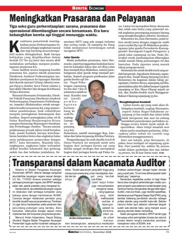 BERITAINDONESIA, November 2008 51Meningkatkan Prasarana dan PelayananBERITA EKONOMITiga soko guru perkeretaapian: sarana, prasarana danoperasional dikembangkan secara bersamaan. Era barukebangkitan kereta api tinggal menunggu waktu.omitmen pemerintah meningkatkan peran Perkeretaapian Indonesia sebagai angkutan massaldan siap bersaing secara kompetitif makin ditingkatkan. Baik berupakebijakan yang diaplikasikan dalambentuk UU No 23/2007 dan secara aktifmelakukan perbaikan maupun pembangunan prasarana KA.Guna melihat secara langsung kondisiprasarana KA, jajaran teknik prasaranaDirektorat Jenderal Perkeretaapian melakukan peninjauan ke lapangan dimulaidari daerah operasi I (Daop Jakarta) sampai Daop 9 Jember Jawa Timur selama 5hari akhir Oktober lalu dengan KA khususWijaya Kusuma.Menurut Hermanto Dwiatmoko, Direktur Teknik Prasarana Direktorat JenderalPerkeretaapian Departemen Perhubungan, inspeksi dilaksanakan untuk mengetahui kondisi prasarana KA yang memerlukan pembenahan, baik rehabilitasimaupun peningkatan kemampuan dankualitas. Seperti peningkatan jalan rel dilintas Bandung-Banjarnegara-Kroyamaupun Semarang-Bojonegoro-Surabayadan Probolinggo-Jember. “Secara umumpelaksanaan proyek tahun 2008 berjalanbaik, meski kendala berupa keterlambatan bantalan beton dan angkutan balasserta pelaksanaan pemecokan denganMTT,” kata Hermanto. Masalah lain,ungkapnya, angkutan balas terlambatakibat kondisi lokomotif dan gerbongsudah tua dan terbatas jumlahnya. Sementara MTT yang ada sangat terbatasdan sering rusak. Di samping itu Daoptidak mempunyai kewenangan untukmengatur MTT.Jalur GandaMeski perbaikan prasarana, tutur Hermanto, seperti penggantian bantalan kayu/besi ke bantalan beton dan rel (R)33 atauR42 menjadi R54 dilakukan, namun pembangunan jalur ganda tetap menjadi perhatian. Seperti program pembuatan jalanganda kereta api lintas Tegal-Pekalongan sepanjang62 km dan 7 km diantaranya sudah selesai. Kondisi saatini (2008)pembangunanberkembang kearah PemalangLarangan sepanjang22,5 km.Sementara, sambil menunggu R54, bantalan dan balas terpasang di lintas Pantura.Pengembangan ke arah double track dilintas Pantura ini menjadi salah satubagian dari jaringan kereta api yangdinilai sangat strategis dan merupakanbagian dari jaringan kereta api Pulau Jawa. Lintas ini merupakan lintas ekonomisdan salah-satu lintas yang potensial untuk angkutan penumpang maupun barangyang menghubungkan Jakarta- Surabaya.Sementara itu, kata Harmanto, pada tahun 2008/2009 dengan anggaran multiyears senilai Rp 250 M dilakukan pembangunan jalur ganda Purwokerto-Karanggandul–Karangsari-Legok-Patuguran 4petak jalan sepanjang 25 km. Pada Desember 2008, pembangunan diharapkansudah masuk tahap pemasangan rel danbantalan. Pada Agustus 2009 masuktahap pengoperasian.Sementara itu untuk double track yang sudah beroperasi: Jogyakarta-Kutoarjo, sepanjang 61 Km, Tanah Abang-Serpong (23 km).Sementara itu kegiatan dalam tahap pengerjaan, Cirebon-Kroya, sepanjang 156 Km,pemindahan jalur KA akibat lumpur Lapindosepanjang 21 Km, Maos-Cilacap sejauh 20km, dan double-double track ManggaraiBekasi-Cikarang sepanjang 35 km.Menghidupkan KembaliLintas kereta api yang mati akan dihidupkan kembali, ungkap Hermanto,seperti lintas Bogor-Sukabumi sepanjang 57 km sudah dua tahun lebihtidak beroperasi dan saat ini sedangmendekati penyelesaian perbaikan sehingga secara teknis layak untuk dioperasikan. Akan tetapi masalah nonteknis perlu mendapat perhatian. Diharapkan akhir tahun ini (2008) siapdiresmikan penggunaannya.Dari sisi teknik, jelas Hermanto, dipulau Jawa terdapat rel sepanjang 4500Km. Dari jumlah itu, sekitar 85 persensudah dalam perbaikan dan sisa sekitar15 persen, itu di luar lintas mati. RIKTransparansi dalam Kacamata AuditorSelama ini Badan Pengawas KeuanganPemerintah (BPKP) dikenal sebagai pengawalakuntabilitas keuangan negara sesuai denganUU No. 17/2003 dimana presiden sebagaipemegang keuangan negara, dan BPKP sebagaisalah satu aparat presiden yang mengawal itu.Secara teknis, akuntabilitas keuangan negaraini dilakukan oleh lembaga kompeten yangbekerja sama dengan kementerian BUMN.Caranya dengan melakukan penilaian yangbersifat obyektif sesuai parameternya. Penilaianini juga harus berdasarkan pada peraturan danperundang-undangan yang berlaku. Barukemudian, dilanjutkan dengan sejauh manaimplementasi dari korporasi yang bersangkutan.Menurut Ardan Adiperdana, Deputi BidangAkutansi Negara Badan Pengawas KeuanganPemerintah tugas auditor bukanlah sebagai penentu. “Sudah ada aturan yang lebih tinggi yangmempunyai wewenang untuk menetapkan standar dan tar- get yang hendakdituju,” urai Ardan.Lebih lanjut Ardanjuga menyampaikanmengenai wewenang tugasnyayang lebihmelihat padarealitas dilapangan,setelah itudiinformasikan pada pihakmanajemen bersangkutan, selanjutnya melakukantindakan perbandingan dengan kajian standaryang sudah ada. “Di sini bisa dilihat apakah telahterjadi gap,” paparnya.Sementara, kapabilitas auditor ini bagi Ardanharus bisa mengikuti perkembangan melalui program-program yang selama ini sudah berjalan yangnantinya mampu menganalisa dengan lebih tajam.Auditor, menurut Ardan, juga memiliki spesifikasi,diantaranya soal Pegawai Negeri Sipil (PNS) yangberlatar belakang pendidikan akuntan sebagaiprofesi standar yang memiliki kode etik. Bahkanmenurut Ardan jauh sebelum reformasi bergulirsudah ada standar baku yang menjadi acuanseorang akuntan dalam memeriksa.Selain penugasan tersebut, BPKP sendiri jugaberupaya untuk peningkatan kinerja dan seluruhproses dalam rangka melakukan penilaianmanajemen risiko di BUMN. RIHermanto Dwiatmokofoto: dok.Ardan Adiperdana