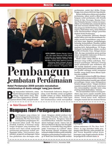 52 BERITAINDONESIA, November 2008BERITA MANCANEGARAperdamaian, mulai dari Afrika, Eropa,hingga Asia selama lebih dari tiga dekade.Berkat dedikasinya dalam mewujudkanperdamaian, tahun 2008 ia diberi penghargaan nobel perdamaian oleh KomiteNobel di Oslo, Norwegia. Mantan Presiden Finlandia berusia 71 tahun ini menyisihkan 197 kandidat lain, termasuk aktivishak asasi manusia (HAM) China, Hu Jia,dan pengacara HAM Chechnya, Lidiya Yusupova. Sejak tahun 2005, nama Ahtisaaritelah dinominasikan sebagai penerimaHadiah Nobel Perdamaian.Upaya perdamaian Ahtisaari dimulaisekitar tahun 1970 saat dia membantu Namibia meraih kemerdekaan yang terwujud tahun 1990. Baginya, pendampinganterhadap kemerdekaan Namibia adalahyang paling berkesan selama perjalananpanjang karir diplomatiknya. Di Eropa,Ahtisaari berkontribusi dalam resolusikonflik di Irlandia Utara. Sebagai utusanPBB, dia juga memainkan peran pentingdalam mengakhiri kekerasan di Kosovo,salah satu provinsi di Serbia.Meski sudah cukup dikenal di dunia,Ahtisaari tetap terlihat sederhana. Pandangan-pandangan Ahtisaari tentangupaya perdamaian pun sederhana sajadan mudah dipahami semua orang. Diamengakui bahwa kemiskinan adalah sumber konflik sehingga untuk mengatasikonflik, warga dunia harus dibuat sejahtera dan terdidik.Menurutnya semua konflik bisa diatasi.Dia juga yakin seorang mediator hanya perlu menyederhanakan masalah agar sebuahperundingan damai yang ditanganinyaberjalan dengan sukses. “Jangan membuatmasalah menjadi lebih rumit. Anda harusbisa menyampaikan masalah mana yangpenting untuk diselesaikan,” katanya.Dia menambahkan bahwa seorang mediator juga harus pandai memilih pintumasuk untuk memulai sebuah negosiasidamai. Untuk kasus Aceh, Ahtisaari Bmengaku masuk dari isu otonomi khususACEH DAMAI: Mantan Menteri Hukumdan Hak Asasi Manusia (HAM) HamidAwaluddin (kiri) berjabat tangan denganmantan Perdana Menteri Gerakan AcehMerdeka (GAM) Malik Mahmud (kanan)didampingi Martti Ahtisaari (tengah)setelah menandatangani perjanjiandamai di Helsinki, 15 Agustus 2005.fl Nobel Ekonomi 2008Mengupas Teori Perdagangan Bebasaul Krugman yang selama inidikenal sebagai kolumnis harianterkemuka The New York Timesmendapatkan penghargaan Nobel Ekonomi tahun 2008. The RoyalSwedish Academy of Sciences menghargai Krugman yang membuat formulasi teori baru untuk menjawabpertanyaan-pertanyaan terkait perdagangan bebas. Teori-teorinya menjelaskan pengaruh perdagangan bebasdan globalisasi dan dorongan urbanisasi. Krugman adalah profesor dariUniversitas Princeton, New Jersey, AS.Sebagai ekonom, Krugman banyakmemublikasikan makalah ilmiahnyadalam berbagai jurnal. Antara lain diHarvard Business Review dan ScientificAmerican. Ia memiliki blog yang diberijudul “Conscience of a Liberal” (KataHati Seorang Liberal). Krugman jugaterkenal sebagai kritikus pedas terhadapkebijakan pemerintahan Presiden George W Bush dan Partai Republik melaluitulisan-tulisannya di The New YorkTimes. Ia juga menekan habis pandangan John McCain, calon presiden ASdari Partai Republik terkait krisiskeuangan yang tengah melanda AS danberpengaruh ke seluruh dunia. Pfoto: daylife.comPembangunagi masyarakat Indonesia, namaMartti Ahtisaari tidak asing lagi ditelinga. Pada tahun 2005, Ahtisaari dan organisasinya, InisiatifManajemen Krisis (CMI), menjadi mediator Pemerintah Indonesia dengan Gerakan Aceh Merdeka untuk mengakhirikonflik selama 30 tahun. KeberhasilanAhtisaari sebagai mediator tidak lepasdari kesabarannya untuk mewujudkanJembatan PerdamaianNobel Perdamaian 2008 semakin menabalkaneksistensinya di dunia sebagai ‘sang juru damai’.Paul Krugmanfoto: nobelprize.org