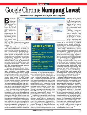 BERITAINDONESIA, November 2008 55BERITA IPTEKGoogle Chrome Numpang LewatBrowser buatan Google ini masih jauh dari sempurna.agi penggunakomputerkebanyakan, Internet Explorer (IE) yanghadir satu paketdalam sistem operasi MicrosoftWindows sudahcukup untuk dijadikan alat untukberselancar di dunia maya. Namunbagi mereka yangakrab dengan desain web atau hobi menjajal softwareterbaru, Internet Explorer cuma salah satupilihan.Selain IE, ada browser-browser lainyang memiliki kelebihan tersendiri diantaranya Firefox, Opera dan yang terbaru Chrome keluaran perusahaan raksasa pencarian online Google. Dari keempat browser ini, sang pendatang baruGoogle Chrome mendapat sorotan luas.Chrome yang dirilis awal Septemberdigadang-gadang lebih cepat dibandingbrowser lainnya. Selain itu, menurut datadari situs statistik GetClicky, hanya duahari setelah diluncurkan, Chrome “mencuri” dua persen pangsa pasar browser(mesin penjelajah Internet).Perbedaan mencolok Chrome dibandingkan browser lainnya adalah tampilanyang ‘minimalis’. Tampilannya yangsederhana dan efisien kontradiktif dengantampilan yang ramai dari Internet Explorer. Hal ini sejalan dengan penjelasanGoogle akan makna di balik istilahChrome. Menurut Erin Fors dari Google,Chrome merujuk pada user interface yangmelebur di sekeliling halaman web.“Dengan Google Chrome, kami telah mendesainnya seminimal mungkin agar pengguna secara utuh merasakan pengalamanberselancar di dunia maya,” ujarnya.Menu bar pada Google Chrome hanyaterdiri atas address bar, tab (sistemantarmuka yang mengizinkan banyakdokumen atau halaman web pada browserdibuka atau diaktifkan di satu jendela) dantombol untuk kembali, memperbarui, danbookmark. Pengguna bisa mengkustomisasi tampilan. Tab memang ditampilkanpada urutan teratas. Namun, pengguna bisa memindahkannya ke sisi lain, bahkanke jendela baru. Pada halaman awal, tersedia kolom pencarian Google dan daftarsembilan halaman situs web yang seringdikunjungi. Ini akan memudahkan pengguna berselancar di situs-situs favorit.Dalam uji kecepatan JavaScript olehCNet, Chrome meninggalkan browserlain. Chrome melaju hampir lima kalilebih cepat dibanding Firefox yang terbarusekalipun. Padahal selama ini Firefoxmerupakan browser JavaScript palingcepat. Rahasia kecepatan Chrome adalahmemakai mesin rendering WebKit sebagaimana browser Safari dari Apple.Chrome juga menggunakan JavaScriptVirtual Machine V8 yang terkenal cepat,sehingga tentu saja lebih ngebut menjelajahi situs yang sarat JavaScript.Fitur lain Chrome adalah anti-phisingalias situs palsu yang bertujuan mencuriidentitas pengguna atau pengunjung.Fitur ini dibangun berdasarkan kode opensource yang sama dengan Mozilla Firefox.Fitur unggulan lainnya adalah pengisolasicontent tab. Fitur ini akan menganalisishalaman situs di tab baru dan memeriksaapakah ada kandungan berbahaya yangmungkin akan mengganggu browser, bahkansistem. Fitur ini sesungguhnya sudah ada dibrowser terbaru Microsoft, Internet Explorer 8,dan TraceMonkey padaFirefox.Mungkin karena masih versi beta, ada beberapa bagian yangmenggangu kenyamanan berselancar. Modelbookmark-nya terasa“jadul”. SebagaimanaFirefox, sebuah tandabintang akan menambahkan situs kebookmark. Namun, tak ada pilihan menyimpan situs di bookmark atau di foldertertentu, sebagaimana pada browser lain.Kekurangan Chrome lainnya adalahlamban saat harus mengakses situs yanglebih kompleks. Ketika The Wall StreetJournal menjajal Chrome di 15 situsolahraga dan 19 situs berita, misalnya,browser ini nyatanya lebih lelet sekitar 20detik ketimbang Firefox dan Safari, meskiunggul 14 detik dibanding IE 8.Ketika mengakses situs-situs kelasberat, Chrome juga kewalahan. Browserini menyita memori komputer hingga172,5 megabita. Ini masih lebih kecilketimbang Explorer yang mencapai 189megabita, tapi masih amat boros dibanding Firefox yang hanya perlu 87 megabita. Chrome juga masih kurang kayadibanding Firefox. Si Rubah Api memiliki5.000 add-ons yang berguna untuk memudahkan penjelajahan di Internet.Sebulan setelah peluncurannya, pesonaChrome mulai pudar. IE dan Firefoxmasih mendominasi dengan pangsa pasarsekitar 60 persen dan 30 persen. Sementara Apple Safari dan Opera, seperti dilansir Vnunet (19/10/2008), berada diposisi selanjutnya dengan 5 dan 1,5 persenpangsa pasar di industri browser. JalanChrome untuk menembus dominasijajaran browser-browser di atasnya sepertinya akan masih panjang. Apalagi disejumlah negara, Google Chorome malahsengaja menutup diri karena tak bisa didownload, seperti di Kuba, Syria, KoreaSelatan, Iran dan Sudan. Hal itu lantaranperintah dari pusat kontrol ekspor Amerika Erikat (AS) sebagai sanksi ekonomikepada negara-negara tersebut. Sementara Google yang berbasis di negaraadidaya itu, mau tak mau pun harusmengikuti aturan ini. MLPBGoogle ChromeSistem operasi: Windows XP danVistaBahasa: 43 bahasa (termasukbahasa Indonesia)Keunggulan: Sederhana, cepatdalam mengakses situs JavaScript,relatif aman.Kekurangan: minim plugins, baruterpasang pada Windows.Fitur: kotak alamat pintar, antimalware/phising, tab yang bekerjadalam lingkungan sendiri.