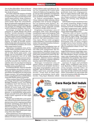 BERITAINDONESIA, November 2008 57BERITA KESEHATANdan sel akan dibersihkan. Stem sel dewasadapat diambil dari fetus, sumsum tulang,dan darah tali pusat.Sel induk embrionik maupun sel indukdewasa sangat besar potensinya untukmengobati berbagai penyakit degeneratif,seperti infrak jantung, stroke, parkinson,diabetes, berbagai macam kanker; terutama kanker darah dan osteoarthritis.Stem sel embrionik sangat plastis dan mudah dikembangkan menjadi berbagai macam jaringan sel sehingga dapat dipakaiuntuk transplantasi jaringan yang rusak.Keuntungan sel induk dari embrio diantaranya ia mudah didapat dari klinikfertilitas, bersifat pluripoten sehinggadapat berdiferensiasi menjadi segala jenissel dalam tubuh, berumur panjang karenadapat berpoliferasi beratus kali lipat padakultur, reaksi penolakan juga rendah.Namun, sel induk ini berisiko menimbulkan kanker jika terkontaminasi, berpotensi menimbulkan penolakan, dan secaraetika sangat kontroversial.Sebenarnya transplantai stem sel bukanlah teknik pengobatan baru di duniakedokteran. Lebih dari 70 tahun lalu, teknik ini telah dicoba pada pasien, yanghingga saat ini berjumlah 5 juta orang.Teknik transplantasi stem sel ini tidakselalu berhasil. Kesulitan mencari mamalia yang sehat dan tidak berpotensi menyebarkan penyakit dan kesulitan menciptakan stem sel yang dapat beradaptasidengan sistem imun penerima menjadimasalah umum pengobatan ini.Prof Michael Molnar, ilmuwan Amerikayang menciptakan stem sel dari seekor kelinci pada 1998 mengatakan mamalia seperti kelinci memiliki jenis sel yang serupadengan manusia. Tak sembarang kelinci,kelinci yang diambil selnya adalah pilihanyang telah diteliti selama 30 generasi.Dalam seminar Stem Cell Transplantation sebagai Alternatif Terapi PengobatanBerbagai Penyakit (13/10), Prof Molnarmenjelaskan hasil riset bersama tim diBio-Cellular Research Organization(BCRO) di Swiss sejak 1976 denganmenerapkan good manufacturing practice (GMP) dan pengalaman klinis transplantasi. Ia menyimpulkan setiap pasiendengan penyakit berat perlu diberi rangsangan untuk regenerasi sel dari organyang rusak.Sampai saat ini lebih dari 5.000 pasiendari seluruh dunia telah menerima transplantasi stem sel dari organisasi penelitianbioselular bimbingan Prof Molnar ini.Managing Director BCRO Indonesia dr.Suharto mengatakan stem sel yang akanditransplantasikan, dimasukkan ke dalamtubuh manusia melalui injeksi pada organyang selnya akan diganti.Kabar gembiranya, kini di Indonesia terapi transplantasi stem sel sudah dapat dilakukan di sebuah rumah sakit swasta diJakarta Selatan sejak awal tahun ini. Ketua Tim Transplantasi RS Pondok IndahJakarta Dr Mulyono S mengatakan, hingga saat ini telah melakukan transplantasistem sel kepada 18 pasien yang sebagianbesar penderita Diabetes Mellitus.Dr. Suharto menambahkan, MajelisUlama Indonesia tidak melarang sistempengobatan stem sel karena menggunakan sel binatang halal (kelinci). Keunggulan lainnya, stem sel kelinci temuanProf Molnar sangat adaptable (mudahberadaptasi) dengan tubuh manusia.Pengobatan transplantasi stem selselangkah lebih maju dibandingkantransplantasi organ secara langsung. Padatransplantasi organ perlu diperhatikanrisiko operasi pembedahan, keterbatasanpendonor, dan reaksi penolakan si penerima organ. Khusus untuk mengatasireaksi penolakan, si penerima diwajibkanmakan obat penekan imunitas/immunosupresan seumur hidup.Sedangkan pada transplantasi stem selreaksi penolakan tidak terjadi. Otomatis, pasien tidak perlu mengonsumsi obat immunosupresan. Kehadiran terapi transplantasi stem sel ini membawa harapan barupada pasien penyakit berat antara lain diabetes tipe 2 dan campuran, down syndrome,infertilitas, defisiensi hormon, penyakitautoimun, parkinson, kelainan defisiensiimunitas seperti AIDS bahkan kanker.“Walaupun transplantasi stem seladalah pilihan pengobatan terakhir.Bukan berarti stem sel adalah ‘obat dewa’yang dapat menyembuhkan semua jenispenyakit,” kata Prof Molnar. Dia mencontohkan pada kasus penyakit jantungkoroner. Terapi stem sel tidak dapatmengatasi penyumbatan darah padakoroner. Yang dapat dilakukan adalahregenerasi sel pada jaringan otot jantungyang rusak dan merangsang pembentukanpembuluh darah baru (angiogenesis).Stem sel dapat ditanam pada salah satucabang arteri koronaria yang tersumbatatau dengan pendekatan angiography kedalam otot jantung yang mengalamikerusakan.Keberhasilan terapi transplantasi stemsel sangat tergantung dengan kondisipasien. Setiap penerima donor wajibmenjalani prosedur detoksifikasi dengancara tidak mengonsumsi obat, alkohol,rokok, dan tidak tinggal di daerah yangenergi elektromagnetiknya kuat.“Penerima stem sel harus memilikilingkungan sesehat mungkin agar stem selyang ditanam dapat hidup. Mengingatstem sel itu adalah sel muda yang sangatsensitif terhadap segala jenis toksin.Penanaman stem sel harus sesegeramungkin karena hanya bertahan selamatiga hari. Penerima stem sel perlu dirawatpasca transplantasi selama 10 hari.” uraidr Suharto.Mengingat prosedurnya yang sulit dantingkat keakuratannya yang tinggi, transplantasi stem sel tentu tidak murah. Tapibila dibandingkan dengan transplantasiorgan yang mengeluarkan biaya operasipembedahan dan pembelian obat immunosupresor seumur hidup, rasanya transplantasi stem sel menjadi lebih hemat.Ironisnya di negara asal penelitianBCRO, Swiss, transplantai stem sel banyak dipalsukan. Oknum tenaga farmasisering mengaku memiliki bahan selberwujud padat buatan Jerman, yangakan mencair bila sudah berada di dalamtubuh. Penyuntikan zat yang seolah-olahstem sel ini pastinya tidak akan hidup dantidak ada manfaatnya. DGRCara Kerja Sel IndukSel teluryang telahmengalamipembuahanTahapBlastositMassa selinduk bagiandalamKultur sel indukberdiferensiasiSel-sel darahSel-sel syaraf Sel-sel otot