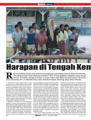 58 BERITAINDONESIA, November 2008Harapan di Tengah Kematusan bahkan ribuan anak tidak bisa mengenyam pendidikan karena didera kemiskinan.Film dengan latar Pulau Belitung era tahun 1974 ini bisa dijadikan pelajaran yang sangatberarti, terutama mengenai kisah 10 anak miskin asal Belitung yang tanpa menyerahuntuk menimba ilmu di Sekolah Dasar (SD) Muhammadiyah Gantong yang serba terbatas.Film kisah nyata adopsi dari novelpertama karya Andrea Hirata ini menjadiinspirasi banyak orang tentang pentingnya pendidikan bagi semua lapisanmasyarakat tanpa memandang status.Dengan serba ketidakberdayaan danketerbatasan tidak menyurutkan semangat para Laskar Pelangi, sebutan bagi kesepuluh anak SD Muhammadiyah Gantong itu untuk terus maju menatap masadepan dengan segudang mimpi dan anganyang terbentang luas di depan.Himpitan kemiskinan, keterbatasanfasilitas, sarana dan prasarana sekolahbukanlah menjadi kendala bagi mereka.Yang ada hanya keinginan untuk merubahdunia menjadi lebih cerah meski harusmelewati jalan cukup berliku dan tidakmudah. Lihatlah gedung sekolahnya,hanya berbentuk bangunan dari kayuyang disanggah dengan batang pohonagar tak roboh. Dinding dan atap bangunannya penuh lubang, lantainya beralaskan tanah. Tak ada pakaian seragam,tak ada sepatu, mereka bersekolah bertelanjang kaki dengan baju yang penuh dengan robekan di sana-sini. Gurunya hanyaada dua, Ibu Muslimah dan Pak Bakriditambah kepala sekolah, Bapak Harfan.Ibu Muslimah yang merupakan salah satutokoh sentral dalam novel berdasarkankisah nyata ini sering tidak menerima gaji.Tapi, ia bisa bertahan, sementara rekannya Pak Bakri harus hengkang dari sekolah itu demi mendapatkan kehidupanyang layak. Sekolah itu sempat akanditutup oleh Depdikbud Sumatra Selatan,gara-gara jumlah muridnya kurang darisepuluh orang.Riri Reza sang sutradara dan MiraLesmana sang produser merupakan duoyang sangat jeli menangkap dan memvisualisasikan buku novel best seller yangditulis Andrea Hirata tahun 2005 ini kedalam layar lebar. Awalnya, baik Ririmaupun Mira sempat mengalami degdegan bila karya film mereka tak seindahnovel yang telah dibaca ribuan orang itu.Tapi, semuanya seakan sirna denganpenampilan adegan-adegan yang sangatbagus dan menyentuh dalam filmnya.Film yang skenarionya ditulis SalmanAristo (penulis skenario ayat-ayat cinta)ini didukung oleh para pemain senior. CutMini (ibu Muslimah), Lukman Sardi (Ikaldewasa), Selamet Raharjo Djarot (Zulkarnain), Alex Komang (ayah Lintang),Ikranegara (Pak Harfan), Tora Sudiro(Pak Mahmud), Mathias Muchus (ayahIkal), Rieke Diah Pitaloka (Ibu Ikal) danBERITA HIBURANRfoto-foto: flickr.com