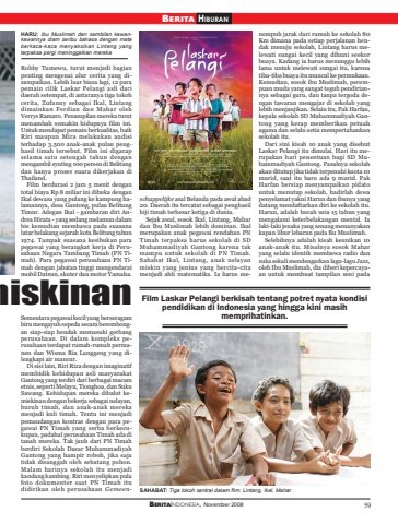 BERITAINDONESIA, November 2008 59miskinanRobby Tumewu, turut menjadi bagianpenting mengenai alur cerita yang disampaikan. Lebih luar biasa lagi, 12 parapemain cilik Laskar Pelangi asli daridaerah setempat, di antaranya tiga tokohcerita, Zufanny sebagai Ikal, Lintangdimainkan Ferdian dan Mahar olehVerrys Ramaro. Penampilan mereka turutmenambah semakin hidupnya film ini.Untuk mendapat pemain berkualitas, baikRiri maupun Mira melakukan audisiterhadap 3.500 anak-anak pulau penghasil timah tersebut. Film ini digarapselama satu setengah tahun denganmengambil syuting 100 persen di Belitungdan hanya proses suara dikerjakan diThailand.Film berdurasi 2 jam 5 menit dengantotal biaya Rp 8 miliar ini dibuka denganIkal dewasa yang pulang ke kampung halamannya, desa Gantong, pulau BelitungTimur. Adegan Ikal - gambaran diri Andrea Hirata - yang sedang melamun dalambis kemudian membawa pada suasanalatar belakang sejarah kota Belitung tahun1974. Tampak suasana kesibukan parapegawai yang berangkat kerja di Perusahaan Negara Tambang Timah (PN Timah). Para pegawai perusahaan PN Timah dengan jabatan tinggi mengendaraimobil Datsun, skuter dan motor Yamaha.schappelijke asal Belanda pada awal abad20. Daerah itu tercatat sebagai penghasilbiji timah terbesar ketiga di dunia.Sejak awal, sosok Ikal, Lintang, Mahardan Ibu Muslimah lebih dominan. Ikalmerupakan anak pegawai rendahan PNTimah terpaksa harus sekolah di SDMuhammadiyah Gantong karena takmampu untuk sekolah di PN Timah.Sahabat Ikal, Lintang, anak nelayanmiskin yang jenius yang bercita-citamenjadi ahli matematika. Ia harus menempuh jarak dari rumah ke sekolah 80Km dimana pada setiap perjalanan hendak menuju sekolah, Lintang harus melewati sungai kecil yang dihuni seekorbuaya. Kadang ia harus menunggu lebihlama untuk melewati sungai itu, karenatiba-tiba buaya itu muncul ke permukaan.Kemudian, sosok ibu Muslimah, perempuan muda yang sangat teguh pendiriannya sebagai guru, dan tanpa tergoda dengan tawaran mengajar di sekolah yanglebih menjanjikan. Selain itu, Pak Harfan,kepala sekolah SD Muhammadiyah Gantong yang kerap memberikan petuahagama dan selalu setia mempertahankansekolah itu.Dari sini kisah 10 anak yang disebutLaskar Pelangi itu dimulai. Hari itu merupakan hari penentuan bagi SD Muhammadiyah Gantong. Pasalnya sekolahakan ditutup jika tidak terpenuhi kuota 10murid, saat itu baru ada 9 murid. PakHarfan bersiap menyampaikan pidatountuk menutup sekolah, hadirlah dewapenyelamat yakni Harun dan ibunya yangdatang mendaftarkan diri ke sekolah itu.Harun, adalah bocah usia 15 tahun yangmengalami keterbelakangan mental. Ialaki-laki jenaka yang senang menanyakankapan libur lebaran pada Bu Muslimah.Selebihnya adalah kisah keunikan 10anak-anak itu. Misalnya sosok Maharyang selalu identik membawa radio dansuka sekali mendengarkan lagu-lagu Jazz,oleh Ibu Muslimah, dia diberi kepercayaan untuk membuat tampilan seni padaBERITA HIBURANFilm Laskar Pelangi berkisah tentang potret nyata kondisipendidikan di Indonesia yang hingga kini masihSementara pegawai kecil yang berseragam memprihatinkan.biru mengayuh sepeda secara berombongan siap-siap hendak memasuki gerbangperusahaan. Di dalam kompleks perusahaan terdapat rumah-rumah permanen dan Wisma Ria Langgeng yang dilengkapi air mancur.Di sisi lain, Riri Riza dengan imaginatifmembidik kehidupan asli masyarakatGantong yang terdiri dari berbagai macametnis, seperti Melayu, Tionghoa, dan SukuSawang. Kehidupan mereka dibalut kemiskinan dengan bekerja sebagai nelayan,buruh timah, dan anak-anak merekamenjadi kuli timah. Tentu ini menjadipemandangan kontras dengan para pegawai PN Timah yang serba berkecukupan, padahal perusahaan Timah ada ditanah mereka. Tak jauh dari PN Timahberdiri Sekolah Dasar MuhammadiyahGantong yang hampir roboh, jika sajatidak disanggah oleh sebatang pohon.Malam harinya sekolah itu menjadikandang kambing. Riri menyelipkan pulafoto dokumenter saat PN Timah itudidirikan oleh perusahaan Gemeen- SAHABAT: Tiga tokoh sentral dalam film: Lintang, Ikal, MaharHARU: Ibu Muslimah dan sembilan kawankawannya diam seribu bahasa dengan mataberkaca-kaca menyaksikan Lintang yangterpaksa pergi meninggalkan mereka