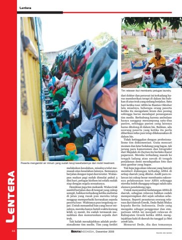 44 BERITAINDONESIA, Desember 2008LenteraLENTERA44melakukan kesalahan, misalnya telat memasak atau kesalahan lainnya. Semuanyaberjalan dengan tepat dan teratur. Walaupun makan pagi sudah dimulai pukul 3dini hari, petugas kicthen ini selalu sudahsiap dengan segala sesuatunya.Demikian juga tim mekanik. Walau truksambil berjalan dan di tempat yang cukupsempit, bahkan terkadang ketika melintasdi jalan yang rusak pun mereka tetapsanggup memperbaiki kerusakan sepedapeserta tour. Waktunya pun tergolong cepat. Untuk menambal ban yang bocor misalnya, mereka hanya butuh waktu kuranglebih 15 menit, itu sudah termasuk menaikkan dan menurunkan sepeda daritruk.Tak kalah menakjubkan adalah profesionalisme tim medis. Tim yang terdiridari dokter dan perawat ini terkadang harus memberikan terapi di dalam bis bahkan di atas truk yang sedang berjalan. Satuhari ketika tour ASSA ke Banten Oktoberlalu misalnya, beberapa orang pesertaketika itu mengalami kram dan peningsehingga harus mendapat penanganantim medis. Berhubung karena ambulanshanya sanggup menampung satu-duapasien, sehingga pasien yang lainnyaharus ditolong di dalam bis. Bahkan, adaseorang peserta yang ketika itu perludiberikan infus pun tetap dilaksanakan didalam bis.Tidak ketinggalan dengan profesionalisme tim dokumentasi. Guna mencarimomen dan latar belakang yang bagus, takjarang para kameramen dan fotograferdari Majalah Al-Zaytun itu berlaku ibaratpaparazzi. Mereka terkadang masuk ketengah ladang atau sawah di tengahperjalanan demi mendapatkan foto danatau gambar yang bagus.Tak lupa juga akan relawan yang banyakmemberi dukungan terhadap ASSA disetiap daerah yang dilalui. Andil para relawan ini cukup besar membantu suksesnya pelaksanaan tour ASSA sehinggamereka boleh dianggap sebagai salah satuelemen pendukung juga.Untuk menyambut kedatangan ASSA didaerah, sebagian relawan bahkan sudahmempersiapkan diri sejak sebulan sebelumnya. Seperti penuturan seorang relawan dari daerah Gresik, Dede Bakti Mulyakepada Berita Indonesia. Dede yangmengaku sebagai penggemar dan simpatisan ASSA ini menjadi relawan diKabupaten Gresik ketika ASSA menginjakkan kaki di daerah itu tanggal 31 Mei2008 lalu.Menurut Dede, dia dan temannyaPeserta mengambil air minum yang sudah teruji kesehatannya dari mobil treatment.Tim relawan ikut membantu petugas laundry.foto-foto: dok. berindo