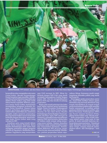 BERITAINDONESIA, April - 15 Mei 2009 25berpendirian akan mengajukan satu nama(Jusuf Kalla). Mereka berpandanganPartai Demokrat ingin mendikte. Sebaliknya Tim 9 Partai Demokrat juga tidak maudidikte Partai Golkar yang telah kalahdalam Pemilu Legislatif. Akhirnya, pengurus harian Partai Golkar memutuskanmembatalkan keinginan berkoalisi dengan Partai Demokrat. Namun bukanberarti perbedaan pandangan dalamtubuh Golkar sudah tidak ada, malah bisamungkin makin menjurus perpecahan.Bisa saja Partai Golkar secara resmi tidakberkoalisi dengan Demokrat, tetapi beberapa kader Partai Golkar akan tetapmerapat ke SBY.Demikian pula yang terjadi dalamtubuh Partai Amanat Nasional. KetuaMajelis Pertimbangan PAN Amien Raismenggelar pertemuan dengan penguruswilayah di Yogyakarta. Melahirkan Kesepakatan Yogyakarta yang menyerukanBERSITEGANG: PPP terbelah, ada faksi Ketua Umum Suryadharma Ali dan faksi Ketua Majelis Pertimbangan Partai Bachtiar Chamsyahagar PAN merapat ke SBY. Sikap ituberbeda dengan DPP PAN yang masihmenjajaki kemungkinan koalisi denganbukan SBY. Hal ini mengindikasikanbahwa PAN juga bisa berada di ambangperpecahan.Begitu pula terjadi polarisasi dua kububesar dalam internal partai berlambangKabah, Partai Persatuan Pembangunan(PPP). Ada faksi Ketua Umum Suryadharma Ali dan faksi Ketua MajelisPertimbangan Partai Bachtiar Chamsyah.Kubu Bachtiar ingin PPP merapat keDemokrat, sedangkan kubu Suryadharmaingin ke PDIP atau Gerindra. Kedua kubuini bahkan sudah sempat saling menyerang secara terbuka. Namun, kemudiankeduanya sudah sempat berjabat tangandan menyatakan berdamai. Namun,dalam Rakernas PPP 26/4/09, perpecahan itu pun mencuat kembali. Setidaknya, potensi perpecahan belum sepenuhnya hilang. Semuanya masih sangattergantung dinamika politik yang masihliar bergerak.Menanggapi gejala perpecahan partaiitu, Jusuf Kalla melihat adanya gejaladestruktif yang merusak demokrasi yangtengah dipraktikkan di tengah-tengahproses komunikasi politik untuk menjalinkoalisi antarparpol. Ia melihat setelahgejalanya dialami dua partai politik, yaituPartai Persatuan Pembangunan (PPP)dan Partai Amanat Nasional (PAN),giliran Partai Golkar yang “diacak-acak”.Kalla mengatakan, yang terjadi sekarang adalah gejala yang sama di tigapartai, di mana sejumlah kadernya melawan ketua umum partainya. “Demokrasitidak dijalankan secara benar dan baik.Akan tetapi, sengaja dipecah belah,ditakut-takuti, dan ditangkapi,” kataKalla. ANP, AYBERITAINDONESIA, April - 15 Mei 2009 25BERITA UTAMA