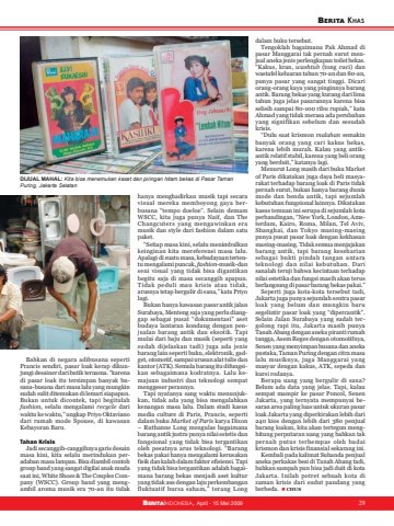 BERITAINDONESIA, 10 Agustus 2006 29BERITA KHASBERITAINDONESIA, April - 15 Mei 2009 29Bahkan di negara adibusana sepertiPrancis sendiri, pasar loak kerap dikunjungi desainer dari butik ternama. “karenadi pasar loak itu tersimpan banyak busana-busana dari masa lalu yang mungkinsudah sulit ditemukan di lemari siapapun.Bukan untuk dicontek, tapi begitulahfashion, selalu mengalami recycle dariwaktu ke waktu,” ungkap Priyo Oktavianodari rumah mode Spouse, di kawasanKebayoran Baru.Tahan KrisisJadi secanggih-canggihnya garis desainmasa kini, kita selalu merindukan peradaban masa lampau. Bisa diambil contohgroup band yang sangat digilai anak mudasaat ini, White Shoes & The Couples Company (WSCC). Group band yang mengambil aroma musik era 70-an itu tidakhanya menghadirkan musik tapi secaravisual mereka memboyong gaya berbusana “tempo doeloe”. Selain demamWSCC, kita juga punya Naif, dan TheChangcuters yang mengawinkan eramusik dan style dari fashion dalam satupaket.“Setiap masa kini, selalu menimbulkankeinginan kita mereferensi masa lalu.Apalagi di suatu masa, kebudayaan tertentu mengalami puncak, fashion-musik-danseni visual yang tidak bisa digantikanbegitu saja di masa secanggih apapun.Tidak peduli mau krisis atau tidak,arusnya tetap bergulir di sana,” kata Priyolagi.Bukan hanya kawasan pasar antik jalanSurabaya, Menteng saja yang perlu dianggap sebagai pusat “dokumentasi” asetbudaya lantaran kondang dengan penjualan barang antik dan eksotik. Tapimulai dari baju dan musik (seperti yangsudah dijelaskan tadi) juga ada jenisbarang lain seperti buku, elektronik, gadget, otomotif, sampai urusan alat tulis dankantor (ATK). Semula barang itu difungsikan sebagaimana kodratnya. Lalu kemajuan industri dan teknologi sempatmenggeser perannya.Tapi nyatanya sang waktu menunjukkan, tidak ada yang bisa mengalahkankenangan masa lalu. Dalam studi kasusmedia culture di Paris, Prancis, sepertidalam buku Market of Paris karya Dixon– Ruthanne Long mengulas bagaimanabarang antik justru punya nilai estetis danfungsional yang tidak bisa tergantikanoleh pesatnya arus teknologi. “Barangbekas pakai hanya mengalami kerusakanfisik dan kalah dalam faktor efisiensi. Tapiyang tidak bisa tergantikan adalah bagaimana barang bekas menjadi aset kulturyang tidak aus dengan laju perkembanganfluktuatif bursa saham,” terang Longdalam buku tersebut.Tengoklah bagaimana Pak Ahmad dipasar Manggarai tak pernah surut menjual aneka jenis perlengkapan toilet bekas.“Kakus, kran, washtub (tong cuci) danwastafel keluaran tahun 70-an dan 80-an,punya pasar yang sangat tinggi. Dicariorang-orang kaya yang pinginnya barangantik. Barang bekas yang kurang dari limatahun juga jelas pasarannya karena bisaselisih sampai 80-100 ribu rupiah,” kataAhmad yang tidak merasa ada perubahanyang signifikan sebelum dan sesudahkrisis.“Dulu saat krismon malahan semakinbanyak orang yang cari kakus bekas,karena lebih murah. Kalau yang antikantik relatif stabil, karena yang beli orangyang berduit,” katanya lagi.Menurut Long masih dari buku Marketof Paris dikatakan juga daya beli masyarakat terhadap barang loak di Paris tidakpernah surut, bukan hanya barang duniamode dan benda antik, tapi sejumlahkebutuhan fungsional lainnya. Dikatakankasus temuan ini serupa di sejumlah kotaperbandingan, “New York, London, Amsterdam, Kairo, Roma, Milan, Tel Aviv,Shanghai, dan Tokyo masing-masingpunya pusat pasar loak dengan kekhasanmasing-masing. Tidak semua menjajakanbarang antik, tapi barang kesehariansebagai bukti pindah tangan antarateknologi dan nilai kebutuhan. Darisanalah teruji bahwa kecintaan terhadapnilai estetika dan fungsi masih akan terusberlangsung di pasar barang bekas pakai.”Seperti juga kota-kota tersebut tadi,Jakarta juga punya sejumlah sentra pasarloak yang belum dan mungkin barusegelintir pasar loak yang “dipercantik”.Selain Jalan Surabaya yang sudah tergolong rapi itu, Jakarta masih punyaTanah Abang dengan aneka piranti rumahtangga, Asem Reges dengan otomotifnya,Senen yang menyimpan busana dan anekapustaka, Taman Puring dengan citra masalalu musiknya, juga Manggarai yangmasyur dengan kakus, ATK, sepeda dankursi rodanya.Berapa uang yang bergulir di sana?Belum ada data yang jelas. Tapi, kalausempat mampir ke pasar Poncol, SenenJakarta, yang ternyata mempunyai besaran area paling luas untuk ukuran pasarloak Jakarta yang diperkirakan lebih dari240 kios dengan lebih dari 380 penjualbarang loakan, kita akan tertegun menghitung perputaran uang yang bahkan takpernah putus terhempas oleh badaikrismon dan krisis finansial sekarang ini.Kembali pada kalimat Suhanda penjualaneka perkakas besi di Tanah Abang tadi,bahkan sampah pun bisa jadi duit di kotaJakarta. Inilah potret sebuah kota dizaman krisis dari sudut pandang yangberbeda. CHUSDIJUAL MAHAL: Kita bisa menemukan kaset dan piringan hitam bekas di Pasar TamanPuring, Jakarta Selatan