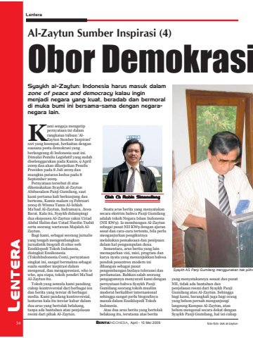 34 BERITAINDONESIA, April - 15 Mei 2009LENTERA34LenteraAl-Zaytun Sumber Inspirasi (4)Obor DemokrasiSyaykh al-Zaytun: Indonesia harus masuk dalamzone of peace and democracy kalau inginmenjadi negara yang kuat, beradab dan bermoraldi muka bumi ini bersama-sama dengan negaranegara lain.Kami sengaja mengutippernyataan ini dalamrangkaian tulisan ‘AlZaytun Sumber Inspirasi’seri yang keempat, berkaitan dengansuasana pesta demokrasi yangberlangsung di Indonesia saat ini.Dimulai Pemilu Legislatif yang sudahdiselenggarakan pada Kamis, 9 April2009 dan akan dilanjutkan PemiluPresiden pada 8 Juli 2009 danmungkin putaran kedua pada 8September 2009.Pernyataan tersebut di atasdikemukakan Syaykh al-ZaytunAbdussalam Panji Gumilang, saatkami pertama kali berkunjung danbertemu, Kamis malam 19 Februari2004 di Wisma Tamu Al-IshlahMa’had Al-Zaytun, Indramayu, JawaBarat. Kala itu, Syaykh didampingidua eksponen Al-Zaytun yakni UztadAbdul Halim dan Uztad Nurdin Tsabitserta seorang wartawan Majalah AlZaytun.Bagi kami, sebagai seorang jurnalisyang tengah mengembangkanjurnalistik biografi di situs webEnsiklopedi Tokoh Indonesia,disingkat Ensikonesia(TokohIndonesia.Com), pernyataansingkat ini, sangat bermakna sebagaisuatu sumber inspirasi dalammengenal, dan mengapresiasi, who iswho, apa siapa, tokoh pendiri Ma’hadAl-Zaytun itu.Tokoh yang semula kami pandangcukup kontroversial dari berbagai isudan berita yang tersiar di berbagaimedia. Kami pandang kontroversial,lantaran kala itu tersiar kabar dalamdua arus yang bertolak belakang,tanpa ada bantahan atau penjelasanresmi dari pihak Al-Zaytun.Suatu arus berita yang menyatakansecara ekstrim bahwa Panji Gumilangadalah tokoh Negara Islam Indonesia(NII KW9). Ia membangun Al-Zaytunsebagai pusat NII KW9 dengan ajaransesat dan cara-cara tertentu, bila perlumenganjurkan pengikutnyamelakukan pemaksaan dan penipuandalam hal pengumpulan dana.Sementara, arus berita yang lainmemaparkan visi, misi, program dankarya nyata yang menunjukkan bahwapondok pesantren modern inidibangun sebagai pusatpengembangan budaya toleransi danperdamaian. Bahkan salah seorangpengagumnya menyurati kami denganpernyataan bahwa Syaykh PanjiGumilang seorang tokoh muslimmoderat berkaliber internasionalsehingga sangat perlu biografinyamasuk dalam Ensiklopedi TokohIndonesia.Atas dua arus berita yang bertolakbelakang itu, terutama atas beritayang menyatakannya sesaat dan pusatNII, tidak ada bantahan danpenjelasan resmi dari Syaykh PanjiGumilang atau Al-Zaytun. Sehinggabagi kami, barangkali juga bagi orangyang belum pernah mengunjungilangsung Kampus Al-Zaytun, ataubelum mengenal secara dekat denganSyaykh Panji Gumilang, hal ini cukupOleh Ch Robin SimanullangSyaykh AS Panji Gumilang menggunakan hak pilihnfoto-foto: dok al-zaytun
