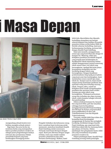 BERITAINDONESIA, April - 15 Mei 2009 35LENTERAi Masa Depanmengundang sebuah kontroversibahkan mungkin sebuah misteri.Bagi kami, dua arus berita ini,terutama berita yang memaparkanbahwa pondok pesantren modern inisebagai pusat pengembangan budayatoleransi dan perdamaian (Sebabjurnalistik biografi yang kamikembangkan memegang motto:Pengukir kebaikan dan kebesaran oranglain), membuat kami terdorong untukmenyurati, memohon kesediaan SyaykhPanji Gumilang untuk wawancara.Ternyata surat kami direspon dengancepat. Kami pun diterima dengan sangatterbuka, tentu saja setelah melaluiprosedur administrasi dan etikabertamu (berkunjung). Bahkan, kamilebih dulu dipersilakan dan dipanduberkeliling mengobservasi hampirseluruh kegiatan dan fasilitas di pondokpesantren seluas seribu hektar lebih itu.Setelah seharian berkeliling, kami punberkesempatan berdialog, pertama kali,dengan Syaykh Panji Gumilang.Kami pun menulis, mengapresiasi,sesuai apa yang kami lihat dan dengar dikampus itu. Memang, salah satukebijakan penulisan jurnalistik biografiyang tengah kami kembangkan diEnsiklopedi Tokoh Indonessia Onlineadalah mengapresiasi (narasi) seseorangtokoh sesuai (atas) visi tokoh yangbersangkutan. Apalagi bila kami punyakesempatan mengobservasi danberdialog dengan tokoh yangbersangkutan. Dengan keyakinanprofesionalisme biography journalisticyang kami anut dan kembangkan, kamimenuturkan secara naratif apa siapatokoh itu. Sampai saat ini, kami masihsangat jarang meminjam penilaian atauapresiasi orang lain terhadap seorangtokoh. Dengan yakin, sejauh inikebijakan kami masih mengedepankanpenilaian dan apresiasi kami sendiritentang apa siapa tokoh yangbersangkutan. Walaupun pernyataanorang lain terhadap apa siapa seorangtokoh, selalu berguna sebagai referensidan pembanding.Dalam sekali pertemuan itu, banyakhal yang kami lihat, gali dan tanyakan,sehingga kami berkeyakinanmengapresiasi Syaykh Panji Gumilangdan Ma’had Al-Zaytun yang kemudiankami publikasikan di situs webTokohIndonesia.Com dan MajalahTokoh Indonesia.Ternyata, setelah lebih lima tahun dankemudian kami berulangkalimengunjungi Al-Zaytun dan seringkaliberdialog, berdiskusi dengan SyaykhPanji Gumilang, apa yang kami tulislebih lima tahun lalu itu, memang itulahapa adanya Al-Zaytun. Dalampandangan dan pengalaman kami, tidakada yang tersembunyi di pondokpesantren modern ini.Dalam pandangan kami, Syaykh PanjiGumilang seorang tokoh pemangkunya dalam Pemilu 9 April 2009