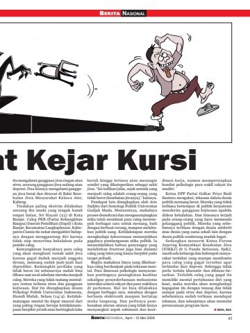 BERITAINDONESIA, April - 15 Mei 2009 43BERITA NASIONALat Kejar Kursiitu mengalami gangguan jiwa ringan ataustres, seorang gangguan jiwa sedang ataudepresi. Dua lainnya mengalami gangguan jiwa berat dan dirawat di Balai Kesehatan Jiwa Masyarakat Kalawa Atei,Kalteng.Tindakan paling ekstrim dilakukanseorang ibu muda yang tengah hamilempat bulan, Sri Hayati (23) di KotaBanjar. Caleg PKB (Partai KebangkitanBangsa) Daerah Pemilihan (Dapil) 1 KotaBanjar, Kecamatan Langkaplancar, Kabupaten Ciamis itu nekat mengakhiri hidupnya dengan menggantung diri karenatidak siap menerima kekalahan padapemilu caleg.Kemungkinan banyaknya para calegyang akan menghuni rumah sakit jiwakarena gagal duduk menjadi anggotadewan, memang sudah jauh-jauh haridiprediksi. Kemungkin perilaku yangtidak beres ini sebenarnya sudah bisadibaca saat awal sebelum mereka menjadicaleg. Mereka yang tidak matang mentalnya rentan terkena stres dan gangguankejiwaan. Hal itu diungkapkan dosenPsikologi Politik Universitas Indonesia,Hamdi Muluk, Selasa (14/4). Ketidakmatangan mental itu dapat muncul dariyang paling ringan berupa ketidakmampuan berpikir jernih atau bertingkah lakuburuk hingga tertawa atau menangissendiri yang dikategorikan sebagai sakitjiwa. “Ini indikasi jelas, sejak semula yangmenjadi caleg adalah orang-orang yangtidak beres (kesehatan jiwanya),” katanya.Pendapat lain diungkapkan oleh ArieSudjito dari Sosiologi Politik UniversitasGadjah Mada. Menurutnya, mahalnyaproses demokrasi dan mengesampingkanetika telah membuat para caleg menempuh berbagai cara untuk menang, baikdengan berbuat curang, maupun melakukan politik uang. Ketidaksiapan merekamenghadapi kekecewaan menunjukkangagalnya pembangunan etika politik. Iamenambahkan bahwa guncangan yangmelahirkan frustrasi juga bisa dialamicaleg yang lolos yang hanya berpikir padatarget pribadi.Begitu mahalnya biaya yang dikeluarkan caleg berdampak pada tekanan mental. Para ilmuwan psikologis menyarankan pentingnya peningkatan kualitassekaligus penyederhanaan mekanismeinteraksi antara rakyat dan para wakilnyadi parlemen. Hal ini bisa dilakukandengan berbagai cara, misalnya denganberbasis elektronik maupun bertatapmuka langsung. Dan perlunya pembenahan aturan-aturan yang tidak hanyamenyangkut aspek substansi dan koordinasi kerja, namun mempersiapkankondisi psikologis para wakil rakyat itusendiri.Ketua DPP Partai Golkar Priyo BudiSantoso mengakui, tekanan dalam duniapolitik memang berat. Mereka yang tidakterbiasa bertempur di politik berpotensimenderita gangguan kejiwaan apabiladidera kekalahan. Dan biasanya terjadipada orang-orang yang baru memasukigelanggang politik. Mereka yang sebelumnya terbiasa dengan dunia selebritiatau dunia yang sama sekali lain dengandunia politik cenderung mudah kaget.Sedangkan menurut Ketua ForumJejaring Komunikasi Kesehatan Jiwa(FJKKJ) dr G Pandu Setiawan, SpKJ,masih ada keluarga dan kelompok masyarakat terdekat yang mampu membantupara caleg yang gagal tersebut agarterhindar dari depresi. Sehingga tidakperlu terlalu khawatir dan dibesar-besarkan. Terlebih caleg yang gagal itumemiliki mental pertahanan diri yangkuat, maka mereka akan menghadapikegagalan itu dengan tenang dan tidaksampai pada stres dan depresi, karenasebelumnya sudah terbiasa mendapattekanan, dan selanjutnya akan memulaiperencanaan program baru. BHS, RIE