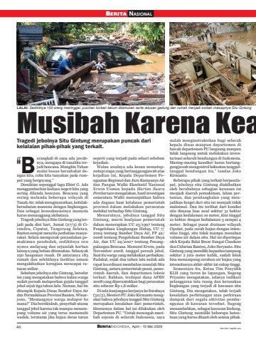 46 BERITAINDONESIA, April - 15 Mei 2009BERITA NASIONALMusibah Karena KeaTragedi jebolnya Situ Gintung merupakan puncak darikelalaian pihak-pihak yang terkait.arangkali di sana ada jawabnya, mengapa di tanahku terjadi bencana. Mungkin Tuhanmulai bosan bersahabat dengan kita, coba kita tanyakan pada rumput yang bergoyang.”Demikian sepenggal lagu Ebiet G. Ademenggambarkan kedaan negeri kita yangsering dilanda bencana. Bencana yangsering melanda beberapa wilayah diTanah Air, telah mengisyaratkan, ketidakbersabatan manusia dengan lingkungan.Dan sebagai konsukuensinya manusiaharus menanggung akibatnya.Tragedi jebolnya Situ Gintung yang terjadi pada dini hari, Jumat (27/3) di Cirendeu, Ciputat, Tangerang Selatan,Banten sempat menyita perhatian masyarakat. Selain memporak-porandakan pemukiman penduduk, sedikitnya 100nyawa melayang dan sejumlah korbanlainnya yang belum ditemukan. Sebanyak250 bangunan rusak. Di antaranya 183rumah dan selebihnya fasilitas umummengakibatkan kerugian mencapai ratusan miliar.Sebelum jebolnya situ Gintung, beredarisu yang mengatakan bahwa kalau wargasudah pernah melaporkan gejala tangguljebol sejak tiga tahun lalu. Namun, hal ituditampik Kepala Dinas Sumber Daya Airdan Permukiman Provinsi Banten, Winarjono, “Memangnya warga melapor kemana?” Dia bersikukuh, penyebab utamatanggul jebol karena tak mampu menampung volume air yang terus memenuhiwaduk, terutama jika hujan deras turunseperti yang terjadi pada sehari sebelumkejadian.Walau awalnya ada kesan menutupnutupi siapa yang bertanggungjawab ataskejadian ini, Kepala Departemen Penguatan Regional dan Juru Kampanye Airdan Pangan Walhi Eksekutif NasionalErwin Usman kepada Harian SuaraPembaruan mengatakan, hasil investigasisementara Walhi menunjukkan bahwaada dugaan kuat kelalaian pemerintahprovinsi dalam melakukan perawatanmelekat terhadap Situ Gintung.Menurutnya, jebolnya tanggul SituGintung, murni kealpaan pemerintahdalam menerapkan UU 23/1997 tentangPengelolaan Lingkungan Hidup, UU 7/2004 tentang Sumber Daya Air, PP 42/2008 tentang Pengelolaan Sumber DayaAir, dan UU 24/2007 tentang Penanggulangan Bencana. Menurut Erwin, padaNovember 2008, tanggul pernah jebol.Saat itu warga yang melakukan perbaikan.Padahal, sejak dua tahun lalu sudah adarapat koordinasi membahas masalah SituGintung, antara pemerintah pusat, pemerintah daerah, dan departemen teknisterkait. Bahkan, terdapat dana APBN2008 yang diperuntukkan bagi perawatansitu sebesar Rp 1,8 miliar.Di sela kunjungan kerjanya ke Surabaya(30/3), Menteri PU Joko Kirmanto mengakui bahwa jebolnya tanggul Situ Gintungmerupakan kesalahan dari pemerintah,khususnya dalam hal ini dilakukan olehDepartemen PU. “Untuk mencegah musibah sejenis di seluruh Indonesia, sayasudah menginstruksikan bagi seluruhkepala dinas maupun departemen dibawah departemen PU langsung maupuntidak langsung untuk melakukan inventarisasi seluruh bendungan di Indonesia.Masing-masing kasatker harus bertanggungjawab mengontrol kekuatan tanggultanggul bendungan itu,” tandas JokoKirmanto.Beberapa pihak yang terkait berpendapat, jebolnya situ Gintung diakibatkanoleh berubahnya sebagian kawasan inimenjadi daerah pemukiman, lahan pertanian, dan pendangkalan yang menjadikan fungsi dari situ ini menjadi tidakmaksimal. Dan itu terlihat dari kondisisitu dimana luas awal sekitar 31 hektardengan kedalaman 10 meter, kini tinggal21 hektar dengan kedalaman 3 sampai 4meter. Sebagai pusat drainase wilayahCiputat, pada curah hujan dengan intensitas tinggi, situ tidak mampu menahanvolume air dalam situ. Hal ini dipertegasoleh Kepala Balai Besar Sungai Cisadanedan Cidurian Banten, Joko Suryanto. SituGintung yang memiliki kapasitas tampungsekitar 2 juta meter kubik, sudah tidakbisa menampung curahan air hujan yangintensitasnya akhir-akhir ini cukup tinggi.Sementara itu, Ketua Tim PenyidikKLH yang turun ke lapangan, SugengPriyanto mengatakan, adanya indikasipelanggaran tata ruang dan kerusakanlingkungan yang terjadi di kawasan situGintung. Dia mengatakan, telah terjadikesalahan perhitungan atau perkiraandampak dari segala aktivitas pembangunan di kawasan tersebut. Sugengmenambahkan, sebagai kawasan lindung,Situ Gintung memiliki beberapa ketentuan yang harus ditaati oleh semua pihak.“BLALAI: Sedikitnya 100 orang meninggal, puluhan korban belum ditemukan serta ratusan gedung dan rumah menjadi korban meluapnya Situ Gintungfoto-foto: daylife.com