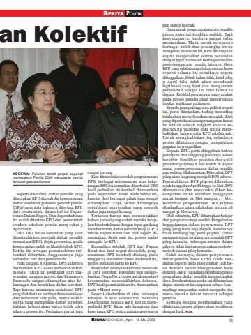 BERITAINDONESIA, April - 15 Mei 2009 51BERITA POLITIKan KolektifSeperti diketahui, daftar pemilih yangditetapkan KPU diawali dari penyusunandaftar penduduk potensial pemilih pemilu(DP4) yang data bakunya diterima KPUdari pemerintah, dalam hal ini Departemen Dalam Negeri. Data kependudukanitu sudah diterima KPU dari pemerintahsetahun sebelum pemilu 2009 yakni 5April 2008.Data DP4 inilah kemudian yang akandimutakhirkan menjadi daftar pemilihsementara (DPS). Sejak proses ini, gejalakesemrautan sudah terlihat di tubuh KPU.Ketika itu petugas pemutakhiran terlambat dibentuk. Anggarannya jugaterlambat cair dari pemerintah.Pada tanggal 8 Agustus, DPS akhirnyadiumumkan KPU. Guna perbaikan daftar,melalui tahap ini pendapat dari masyarakat maupun parpol, dan khususnyaPanwaslu sangat diharapkan atas kekurangan dan kesalahan daftar tersebut.Tapi karena minimnya sosialisasi KPUyang diakibatkan kecilnya dana sosialisasidan terlambat cair pula, hanya sedikitwarga yang memeriksa daftar tersebut,bahkan kebanyakan warga tidak tahuadanya proses itu. Perhatian partai jugasangat kurang.Kira-kira sebulan setelah pengumumanDPS, berbagai rekomendasi atas kekurangan DPS itu kemudian diperbaiki. DPShasil perbaikan itu kembali diumumkanpada September 2008. Pada tahap ini,koreksi dari berbagai pihak juga sangatdiharapkan. Tapi, akibat kurangnyasosialisasi, masyarakat yang mencekdaftar juga sangat kurang.Terkesan hanya mau menunjukkanbahwa jadwal yang sudah mereka tetapkan bisa terlaksana dengan tepat, pada 24Oktober 2008, daftar pemilih tetap (DPT)minus Papua Barat dan luar negeri diumumkan. Sejak saat itu, protes mulaimengalir ke KPU.Kemudian setelah DPT dari PapuaBarat dan luar negeri diperoleh, pengumuman DPT kembali diulang padatanggal 24 November 2008. Pada saat itu,protes semakin deras ke KPU.Menyadari adanya kekeliruan mencolokdi DPT tersebut, Presiden pun mengeluarkan Perpu No. 1/2009 untuk memberikesempatan memutakhirkan datanya.DPT hasil pemutakhiran itu diumumkanpada 7 Maret 2009.Seperti disebutkan di atas, beberapatahapan di atas sebenarnya memberikesempatan kepada KPU untuk memperbaiki DPT. Kalau ada keinginan dankeseriusan KPU, waktu untuk merevisinyapun cukup banyak.Dana untuk pengumpulan data pemilihtahun 2009 ini tidaklah sedikit. Tapikenyataannya, hasilnya sangat tidakmemuaskan. Maka untuk menjawabberbagai kritik dan prasangka burukmengenai persoalan ini, KPU diharapkansegera menjelaskan semua persoalandengan jujur, termasuk berbagai masalahpenyelenggaraan pemilu lainnya. GayaKPU yang selalu menyatakan semua beresseperti selama ini sebaiknya segeraditinggalkan. Sebab kalau tidak, hasil pileg9 April lalu tidak akan mendapatlegitimasi yang kuat dan mengancamperjalanan bangsa ini lima tahun kedepan. Ketidakpercayaan masyarakatpada proses pemilu akan menurunkantingkat legitimasi parlemen.Kepada para petinggi dan politisi negeriini, perlu diingatkan, tuding menudingtidak akan menyelesaikan masalah. Kiniyang diperlukan dalam penanganan kasusini adalah sebuah langkah konkrit semacam uji validitas data untuk membuktikan bahwa data KPU adalah sah.Untuk menghadirkan itu, sebaiknyaprotes dilakukan dengan mengajukangugatan ke pengadilan.Kepada KPU, perlu diingatkan bahwapekerjaan dan tanggung jawabnya belumberakhir. Pemilihan presiden dan wakilpresiden (pilpres) 8 Juli sudah di depanmata, proses penyusunan daftar pemilihpun sedang dilaksanakan. Diketahui, DPTpileg akan langsung menjadi DPS pilpres.Pemutakhiran DPS pilpres dilakukansejak tanggal 10 April hingga 10 Mei. DPSdiumumkan dan masyarakat diberi kesempatan untuk memberi tanggapanmulai tanggal 11 Mei sampai 17 Mei.Kemudian pengumuman DPT Pilpresdijadualkan akan dilakukan antara 28sampai 31 Mei 2009.Oleh sebab itu, KPU diharapkan belajardari pengalamannya sendiri. Pengalamankegagalannya dalam penyusunan DPTpileg yang baru saja terjadi, hendaknyatidak terulang lagi pada pilpres. Untukmengantisipasi terulangnya masalah DPTpileg kemarin, beberapa metode dalampilpres tidak lagi menggunakan metodemetode dalam pileg kemarin.Salah satunya, dalam penyusunandaftar pemilih, basis Kartu Tanda Penduduk seperti pada pileg diubah jadi basis domisili. Selain menggunakan basisdomisili, KPU juga akan membuka poskopengaduan daftar pemilih hingga tingkatdesa. Pembentukan posko ini diharapkandapat memberi kesempatan seluas-luasnya bagi masyarakat untuk mengadu jikanama mereka belum tercatat sebagaipemilih.Semoga dengan pembenahan yangdilakukan, proses pilpres akan terlaksanadengan baik. JKKECEWA: Puluhan tokoh parpol sepakatmenyatakan Pemilu 2009 merupakan pemiluterburuk pascareformasi