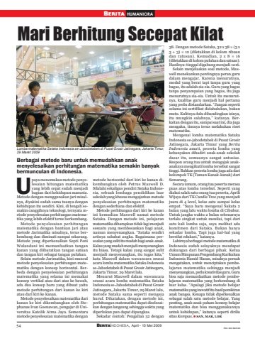 54 BERITAINDONESIA, April - 15 Mei 2009BERITA HUMANIORAMari Berhitung Secepat KilatBerbagai metode baru untuk memudahkan anakmenyelesaikan perhitungan matematika semakin banyakbermunculan di Indonesia.paya menemukan metode penyelesaian hitungan matematikayang lebih cepat sudah menjadibagian dari kehidupan manusia.Metode dengan menggunakan jari misalnya, diyakini sudah sama tuanya dengankehidupan itu sendiri. Kini, di tengah semakin canggihnya teknologi, ternyata metode penyelesaian perhitungan matematika yang lebih efektif terus berkembang.Metode penyelesaian perhitunganmatematika dengan bantuan jari ataumetode Jarimatika misalnya, terus berkembang dan diminati sampai sekarang.Metode yang diperkenalkan Septi PeniWulandani ini memanfaatkan tangankanan yang diibaratkan tangan satuandan tangan kiri sebagai tangan puluhan.Selain metode Jarimatika, kini munculmetode penyelesaian perhitungan matematika dengan konsep horizontal. Berbeda dengan penyelesaian perhitunganmatematika yang selama ini memakaikonsep vertikal atau dari atas ke bawah,ada dua konsep baru yang dibuat yaitumetode perhitungan dari kanan ke kiriatau dari kiri ke kanan.Metode penyelesaikan matematika darikanan ke kiri dikembangkan oleh Stephanus Ivan Goenawan, pengajar di Universitas Katolik Atma Jaya. Sementarametode penyelesaian matematika denganmetode horizontal dari kiri ke kanan dikembangkan oleh Petrus Maxwell D.Silalahi sekaligus pendiri Sataka Indonesia, sebuah lembaga pendidikan luarsekolah yang khusus mengajarkan metodepenyelesaian perhitungan matematikadengan sederhana dan efektif.Metode perhitungan dari kiri ke kananini kemudian Maxwell namai metodeSataka. Dengan metode ini, pelajaranmatematika diharapkan tidak lagi menjadisesuatu yang membosankan bagi anak,namun menyenangkan. “Sataka sendiriartinya sahabat angka. Bagaimana persoalan yang sulit itu mudah bagi anak-anak.Kalau yang mudah menjadi menyenangkanitu biasa. Tetapi kalau yang sangat sulitmenjadi menyenangkan, itu tugas kita,”kata Maxwell dalam wawancara seusaiacara lomba matematika Sataka Indonesiase-Jabodetabek di Pusat Grosir Jatinegara,Jakarta Timur, 29 Maret lalu.Menurut Maxwell dalam wawancaraseusai acara lomba matematika SatakaIndonesia se-Jabodetabek di Pusat GrosirJatinegara, Jakarta Timur, 29 Maret lalu,metode Sataka sama seperti mengejahuruf. Dikatakan, dengan metode ini,perhitungan matematika dapat diselesaikan dengan langsung sehingga waktu yangdiperlukan pun dapat dipangkas.Sekadar contoh: Pengalian 32 dengan38. Dengan metode Sataka, 32 x 38 = (3 x3 + 3) = 12 (diletakkan di kolom ribuandan ratusan). Kemudian, 2 x 8 = 16(diletakkan di kolom puluhan dan satuan).Hasilnya: tinggal digabung menjadi 1216.Selain menjelaskan soal metode, Maxwell menekankan pentingnya peran gurudalam mengajar. Karena menurutnya,modul yang berat tapi tanpa guru yangbagus, itu adalah sia-sia. Guru yang bagustanpa penyampaian yang bagus, itu jugamenurutnya sia-sia. Untuk itu menurutnya, kualitas guru menjadi hal pertamayang perlu distandarkan. “Jangan sepertiselama ini sertifikat didahulukan, bukanmutu. Kulitnya dulu dibandingkan isinya,itu mungkin salahnya,” katanya. Berkaitan dengan itu, sampai saat ini, dia jugamengaku, timnya terus melakukan risetmatematika.Mengenai lomba matematika SatakaIndonesia se-jabodetabek di Pusat GrosirJatinegara, Jakarta Timur yang BeritaIndonesia amati, peserta lomba yangkebanyakan dihadiri anak-anak sekolahdasar itu, semuanya sangat antusias.Respon orang tua untuk mengajak anakanaknya mengikuti lomba tersebut sangattinggi. Bahkan peserta lomba juga ada darikelompok TK (Taman Kanak-kanak) dariSemarang.Secara umum, orang tua peserta merasapuas atas lomba tersebut. Seperti yangdiakui salah satu orang tua peserta, ApriliWijaya dari TK Candle Tree yang menjadijuara di 4 level, kelas satu sampai kelasempat. “Saya baru mengenal Sakata 2bulan yang lalu waktu lomba di Cibubur.Untuk jangka waktu 2 bulan sebenarnyaterlalu singkat untuk menilai, tapi darisatu kali lomba saja, saya melihat adakomitmen dari Sataka. Bukan hanyasekadar lomba. Tapi juga hal-hal yangbersifat edukasi,” katanya.Lahirnya berbagai metode matematika diIndonesia sudah selayaknya mendapatdukungan dari berbagai pihak. KetuaUmum Himpunan Pengembang KurikulumIndonesia Hamid Hasan, misalnya pernahmengatakan, untuk menciptakan pembelajaran matematika sehingga menjadimenyenangkan, perlu kreativitas guru. Gurubisa saja memanfaatkan metode pembelajaran matematika yang berkembang diluar kelas. “Apalagi jika metode belajarmatematika yang inovatif itu hasil pemikirananak bangsa. Kenapa tidak diperkenalkansebagai salah satu metode belajar. Yangpenting, anak-anak paham konsep belajarmatematika dan bisa menggunakannyauntuk kehidupan,” katanya seperti dirilissitus Kompas. SAN, MAR, LORULomba matematika Sataka Indonesia se-Jabodetabek di Pusat Grosir Jatinegara, Jakarta Timur,29 Maret 2009foto: dok berindo
