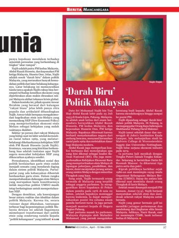 BERITAINDONESIA, April - 15 Mei 2009 57BERITA MANCANEGARA‘Darah Biru’Politik MalaysiaDato Sri Mohamad Najib bin TunHaji Abdul Razak lahir pada 23 Juli1953 di Kuala Lipis, Pahang, Malaysia.Ia adalah anak tertua dari enam bersaudara berayahkan Abdul RazakHussein, PM kedua Malaysia, dankeponakan Hussein Onn, PM ketigaMalaysia. Bapaknya dihormati karenaberhasil menyelamatkan negara dariambang bencana, menyusul kerusuhanrasial pada 1969 dan meletakkan dasarbagi Malaysia modern.Abdul Razak juga memperluas koalisi berkuasa dan menciptakan apayang kini dikenal sebagai koalisi Barisan Nasional (BN). Dia juga memperkenalkan Kebijakan Ekonomi Baruyang memprioritaskan etnis Melayu dilapangan pekerjaan, pendidikan, danbisnis, demi menipiskan jurang antaraorang miskin Melayu dengan minoritasTiongkok yang kaya.Sang anak, Najib termasuk orangtermuda di Malaysia yang terpilihsebagai anggota parlemen. Ia menggantikan kursi bapaknya di Pekandalam pemilu pada 1976 di usia 22tahun, setelah bapaknya meninggalkarena leukemia. Ia dapat mempertahankan posisi itu selama enampemilu berturut-turut. Ia juga pernahmenjadi menteri kepala di NegaraBagian Pahang.Saat pertama masuk ke parlemen,Malaysia dipimpin oleh MahathirMohamad, yang pernah mengatakanberutang budi kepada Abdul Razakkarena mendukungnya hingga sampaike posisi PM.Najib dipandang sebagai ‘darah biru’dalam politik Malaysia. Di Pahang, iamemegang gelar Orang Kaya InderapuraShahbandar Pahang Darul Makmur.Najib tamat sekolah dasar dan menengah di John’s Institution KualaLumpur, lalu melanjutkan studi keMalvern College di WorcestershireInggris dan Universitas Nottingham.Najib lulus sarjana ekonomi industripada 1974.Ia pertama kali menikah denganTengku Puteri Zainah Tengku Eskandar. Sekarang ia beristrikan Datin SriRosmah Mansor. Ia dikarunai tigaputra serta dua putri.Kiprah politiknya berkibar sejak1980-an saat memimpin sayap mudaOrganisasi Kebangsaan Melayu Bersama (UMNO). Sayap itu antara laindikenal saat meminta darah orangTiongkok di keris Melayu.Setelah resmi disumpah menjadi PMkeenam, Jumat (3/4), Najib berjanjimenyatukan seluruh etnis dan mendesak seluruh rakyat Malaysia untukbersatu.Najib yang gemar bermain golf inimemiliki jaringan pertemanan danpendukung dari lingkaran elite bisnisMalaysia. Adiknya, Nazir Razak, saatini memimpin CIMB, bank terbesarkedua di Malaysia. punya kepekaan mendalam terhadapsejumlah persoalan yang berkembang ditingkat “akar rumput”.Najib adalah putra PM kedua Malaysia,Abdul Razak Hussein, dan keponakan PMketiga Malaysia, Husein Onn. Jelas, Najibadalah sosok “darah biru” dalam politikMalaysia, yang merasakan banyak kemudahan politik dari latar belakang keluarganya. Latar belakang ini memunculkantanda tanya apakah Najib cukup bisa berempati terhadap kesulitan ekonomi yangdiperkirakan akan makin dirasakan rakyat Malaysia akibat tekanan krisis global.Dalam konteks ini, pihak oposisi AnwarIbrahim yang berasal dari kalangan“rakyat biasa” jelas lebih punya citrapopulis dan artikulatif dibandingkanNajib. Anwar telah berupaya mengakomodasi kegelisahan etnis non-Melayu yangmemandang NEP (New Economic Policy)yang memprioritaskan ekonomi etnisMelayu sebagai kebijakan yang sudahwaktunya diakhiri.Sekitar 30 persen dari rakyat Malaysiayang hidup saat ini lahir setelah kerusuhan rasial tahun 1969, yang melatarbelakangi dikeluarkannya kebijakan NEPoleh PM Razak Hussein (ayah Najib).Ironisnya, wacana yang kini kian berkembang luas adalah tuntutan agar Najibsegera mencabut kebijakan NEP yangdiluncurkan ayahnya sendiri.Persoalannya, identifikasi sosial danpolitik berdasarkan garis etnis sudahmenjadi sesuatu yang mendarah dagingdalam sistem politik Malaysia. Partaipartai yang ada kebanyakan dibentukberdasarkan garis etnis. Dalam rangkamempertahankan dukungan etnis Melayuyang merupakan basis konstituennyainilah mayoritas politisi UMNO masihtetap berkeinginan untuk mempertahankan NEP.Dengan demikian, ada kesenjanganbesar antara realitas dan idealitas dalampolitik Malaysia. Karena itu, secaravisioner dapat dikatakan, tantanganterbesar bagi kepemimpinan politik Malaysia dewasa ini adalah bagaimanamemelopori transformasi dari politiketnis yang cenderung rasialis kepada“politik kebangsaan” yang inklusif. LORuniaNajib Rajak