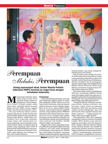 64 BERITAINDONESIA, April - 15 Mei 2009BERITA PEREMPUANPerempuan Melukis PerempuanJelang seperempat abad, Ikatan Wanita PelukisIndonesia (IWPI) meretas ke negeri jiran dengankeindahan Indonesia.usim bunga telah tiba. Kabaritulah yang tersirat lewatsejumlah lukisan dalam tajuk pameran “Exotic Indonesia in Colour” di Kuala Lumpur mediobulan silam. Sejumlah lukisan bercorakbunga, dari iris, dahlia, mawar, anggrekbulan, serta lili merona beraneka warna.Ada juga beberapa lukisan pemandangan yang eksotis. Sudah barang tentupasti ada Bali. Selain itu juga ada pemandangan bukit Baliem, sungai Musi, persawahan Ciawi, panorama pedesaan,sungai, danau, dan suasana pasar terapung. Begitulah nuansa keindahan Indonesia direkam dalam 100 lukisan dari 38pelukis yang tergabung dalam IWPI digedung Soka Gakkai Malaysia yang terselenggara atas kerjasama Kedutaan Indonesia untuk Malaysia dan lembaga nirlaba, Soka Gakkai Malaysia.ProfesionalLaiknya lini bidang seni lainnya, seni rupajuga menyimpan gejolak gender di antarapara pelakunya. Dalam sejarah awal senirupa modern Indonesia, nama perempuanpelukis Indonesia masih terbilang langka.Baru di era 30-an, nama pelukis EmiriaSunassa, yang menjadi satu dari segelintirseniman yang tergabung dalam PERSAGI(Persatuan Ahli Gambar Indonesia). Barulah di era 60-an, sejumlah nama pelukisperempuan mulai merebak di kancah senirupa Indonesia, sekadar menyebut beberapanama semacam Umi Dachlan, KartikaAffandi, Rulijati, dan Kustijah.Hingga era 80-an dan yang paling mutakhir, keberadaan perempuan dalam seni rupaterkhusus seni lukis sudah mengalamiperkembangan yang sangat pesat. Terlebihlagi sudah begitu banyaknya organisasisebagai wadah perkumpulan, juga sejumlahkantung budaya yang kerap menjadi penyaluran karya seni mereka.Satu di antara yang meretas di era 80-an adalah paguyuban yang dibesut empatorang perempuan pelukis Dewa Retno, SriYunnah, Yuriah Tanzil, dan Sri Robustina.Mereka berembuk ide di pertengahanAgustus 1985 hingga terbentuklah IkatanPelukis Wanita Indonesia (IPWI) yangakhirnya kemudian menjadi Ikatan Wanita Pelukis Indonesia (IWPI).Jika tahun-tahun pertama pendiriannyadulu baru menampung segelintir ibu-ibusasak, kini anggota sudah mencapai 200 orang lebih yang tersebar di sejumlah kota besardi Indonesia, dari yang termuda berusia 18tahun hingga yang sepuh di usia 80-an.“Dengan berdirinya IWPI para perempuan pelukis berbagi informasi, danterutama wadah untuk menampungkreativitas. Dulu kita perempuan yangmelukis sering kebingungan, mau cariinformasi ke mana, bagaimana kalau mauikutan pameran…,” ungkap Kartini Sabekti, salah satu penggiat di IWPI.Pada September 1985, IWPI langsungmengadakan pameran perdana di gedungLingkar Mitra Budaya yang acaranyalangsung diresmikan oleh Ida Sukaman(alm.) sebagai wakil dari Menteri NegaraUrusan Peranan Wanita. Dan setelah itumeretaslah puluhan pameran bersamahingga menjelang usia seperempat abad ini.Kartini mengungkapkan keberadaanIWPI bertujuan mengkalibrasi kemamMfoto: dok IWPI