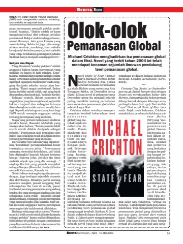 BERITAINDONESIA, April - 15 Mei 2009 65BERITA BUKUpuan perempuan menjadi pelukis profesional. Katanya, “Dalam wadah ini kamimengkondisikan diri sebagai pelukisprofesional. Belajar melukis dengan benar,sesuai ilmunya. Ada guru khusus yangmembimbing. Selain itu juga rutin mengadakan seminar, workshop, tour melukiske sejumlah kota dan punya jadwal melukisyang tetap. Setidaknya perempuan pelukisitu tidak hanya menjadi sunday painters.”Subyek dan ObyekYang dimaksud “sunday painters” adalahanggapan bahwa kaum perempuan yangmelukis itu hanya di hari minggu. Konotasinya, melukis hanya untuk mengisi waktuluang. Pertemuan saban pekan untuk sekadarngumpul-ngumpul, membunuh waktu senggang daripada sekadar arisan atau bergunjing. “Kami sangat profesional. Bukanhanya melukis untuk indah, tapi yang layakdipamerkan, dan layak jual,” tambah Kartini.Sebagai contoh, dalam pameran dinegeri jiran yang baru saja lewat, sejumlahlukisan terjual dan sebagian lainnyadisumbangkan untuk malam amal (charity). Seperti ada keinginan yang kuat bagiIWPI untuk menepis anggapan miringtentang perempuan yang melukis.Siapa yang pernah melupakan sindiranpelukis besar, Basoeki Abdullah yangmengatakan bahwa, “Perempuan itu lebihcocok untuk dilukis daripada sebagaipelukis.” Pernyataan tadi berangkat darimitos dan sekaligus telah dijadikan mitostentang perempuan yang melukis.Dari sekitar 100 lukisan yang dipamerkan, “keindahan” perempuan benar-benarterungkap secara jelas. “Perempuanmemang menyukai keindahan, jadi tidakbisa dipungkiri banyak lukisan bertemabunga. Karena jelas, pelukis itu akanmelukis obyek apa yang dia senangi…,”ungkap Kartini yang pernah menjabatsebagai Konjen (Konsulat Jendral) Indonesia di Vancouver, Kanada itu.Selain lukisan tentang bunga dan pemandangan, juga terdapat sejumlah manusiadan aktivitasnya. Misalnya potret seorangpenenun songket, penari ronggeng Bali,sekumpulan ibu tani di sawah, pasartradisonal, seorang perempuan yang sedangberdoa, ibu yang mengajari anaknya dan lainsebagainya. Gaya realis - naturalis sangatmendominasi. Sehingga sosok perempuanyang muncul begitu jelas kentara. Sulit untuk menolak anggapan bahwa perempuanmemang terlalu indah untuk dilukiskan.Bedanya sekarang mitos bahwa “Perempuan itu lebih cocok untuk dilukis daripadasebagai pelukis” harus sedikit diluruskan.Setidaknya 38 pelukis dengan 100 lukisanyang dipamerkan di dunia internasional itusudah membuktikannya. CHUSOlok-olokPemanasan GlobalMichael Crichton menghadirkan isu pemanasan globaldalam fiksi. Novel yang terbit tahun 2004 ini telahmendapat kecaman sejumlah ilmuwan pendukungteori pemanasan global.ovel State of Fear (2004)karya Michael Crichton terbithanya berjarak dua pekansebelum tsunami berkekuatan9,3 skala Richter yang menerjang AsiaTenggara-Afrika, 26 Desember 2004silam. Rilisan novel di pekan pertamaDesember 2004 itu menjadi sejarahpaling mutakhir tentang perdebatanseru antara isu pemanasan global dansebuah karya fiksi.Crichton dalam novelnya mempertanyakan kembali keberadaan teoripemanasanglobal yang merebak sejak eramilenium dimulai. Duniaakademis danpendukungteori itu menyambutnyadengan polemik. Beberapawaktu berselang hening,lantaran ceritafiksi dalam novel tentang tsunami yang melanda Floridaitu menjadi aktual saat kawasan Aceh-SriLanka-IndiaThailand, bahkan hingga Maladewa dan Somalia (Afrika)diterjang gelombang tsunami terbesar selama 24tahun terakhir. Lalu perdebatan antarapendukung teori pemanasan globalmenghangat kembali. Bahkan Al Goredalam pidato di depan Komite GedungPutih, 21 Maret 2007 sempat menyindir novel Stete of Fear. Inilah kekuatansebuah novel yang kini telah diterjemahkan ke dalam bahasa Indonesiamenjadi Kondisi Ketakutan (GPU,2009).***Century City, Senin, 27 Septemberjam 09.45. Sudah hampir dua mingguEvans tak mendapatkan kabar dariMorton. Seingatnya dia belum pernahhilang kontak dengan kliennya sampai begitu lama (hal. 130). Dari sinilah“rasa” fiksi novel State of Fear bermula. Sejak mula halaman, Crichtonmeyakinkan pembaca inilah karya science fiction(SF) yang “memeriahkan” isupemanasanglobal. Dan sejak itu pula, narasi dalam sejumlah fakta,data, asumsidan peristiwayang berkaitandengan isu paling hangat separuh abad ini.Dalam halaman 54-55, misalnya, terdapat percakapantiga tokoh yangmembincangkan tentangperubahan suhu di paruhpertama abad20 di Islandia.Tiba-tiba melentinglah kalimat salah satu tokohnya, “semua itubohong.” Lalu bergulir pada penjelasantokoh lain, “kita mengamati fenomenapemanasan global yang disebabkangas-gas yang berasal dari rumahkaca. Padahal kita mengamati polaiklim lokal yang secara khas hanyaterjadi di Islandia dan tak ada sangNKREATIF: Ikatan Wanita Pelukis Indonesia(IWPI) rutin mengadakan seminar, workshop,tour melukis ke sejumlah kota