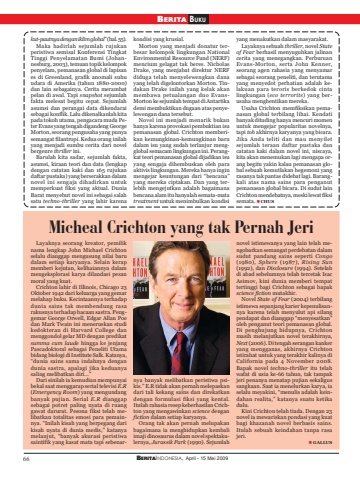 66 BERITAINDONESIA, April - 15 Mei 2009BERITA BUKUkut-pautnya dengan iklim global” (hal. 55).Maka hadirlah sejumlah rujukanperistiwa semisal Konferensi TingkatTinggi Penyelamatan Bumi (Johannesburg, 2003), temuan topik kelompokpenyelam, pemanasan global di lapisanes di Greenland, grafik anomali suhuudara di Amerika (tahun 1880-2000)dan lain sebagainya. Cerita merambatpelan di awal. Tapi snapshot sejumlahfakta melesat begitu cepat. Sejumlahasumsi dan perangai data dikendaraisebagai konflik. Lalu dikenalkanlah kitapada tokoh utama, pengacara muda Peter Evans yang tengah digandeng GeorgeMorton, seorang pengusaha yang punyasemangat filantropi. Kedua orang inilahyang menjadi sumbu cerita dari novelbergenre thriller ini.Barulah kita sadar, sejumlah fakta,asumsi, kiraan teori dan data (lengkapdengan catatan kaki dan 165 rujukandaftar pustaka) yang berserakkan dalamnovel ini sengaja dihadirkan untukmemperkuat fiksi yang aktual. DuniaBarat menyebut novel ini sebagai salahsatu techno-thriller yang lahir karenakondisi yang krusial.Morton yang menjadi donatur terbesar kelompok lingkungan NationalEnvironmental Resource Fund (NERF)mencium gelagat tak beres. NicholasDrake, yang menjabat direktur NERFdiduga telah menyelewengkan danayang telah digelontorkan Morton. Tindakan Drake inilah yang kelak akanmembawa petualangan duo EvansMorton ke sejumlah tempat di Antartikademi membuktikan dugaan atas penyelewengan dana tersebut.Novel ini menjadi menarik bukanhanya karena provokasi pembuktian isupemanasan global. Crichton memberikan kemungkinan-kemungkinan barudalam isu yang sudah terlanjur mengglobal semacam lingkungan ini. Perangkat teori pemanasan global dijadikan isuyang sengaja dihembuskan oleh paraaktivis lingkungan. Mereka hanya inginmengejar keuntungan dari “bencana”yang mereka ciptakan. Dan yang terlebih mengejutkan adalah bagaimanabencana alam itu hanyalah semata-matatreatment untuk menimbulkan kondisiyang menakutkan dalam masyarakat.Layaknya sebuah thriller, novel Stateof Fear berhasil menyuguhkan jalinancerita yang menegangkan. PerburuanEvans-Morton, serta John Kenner,seorang agen rahasia yang menyamarsebagai seorang peneliti, dan terutamayang menyedot perhatian adalah kelakuan para teroris berkedok cintalingkungan (eco terrorits) yang berusaha menghentikan mereka.Usaha Crichton memfiksikan pemanasan global terbilang lihai. Kendatibanyak dituding hanya mencuri momenuntuk mengejar popularitas novelnya,tapi toh akhirnya karyanya yang bicara.Jika Anda teliti dan mau menyiletsejumlah teraan daftar pustaka dancatatan kaki dalam novel ini, niscaya,kita akan menemukan lagi mengapa orang begitu yakin kalau pemanasan global sebuah kemutlakan hegemoni yangrasanya tak pantas didebat lagi. Barangkali atas nama sains para penganutpemanasan global bicara. Di sudut lainCrichton mendebatnya, meski lewat fiksisemata. CHUSMicheal Crichton yang tak Pernah JeriLayaknya seorang kreator, pemiliknama lengkap John Michael Crichtonselalu dianggap mengusung nilai barudalam setiap karyanya. Selain kerapmemberi kejutan, kelihaiannya dalammengeksplorasi karya dilandasi pesanmoral yang kuat.Crichton lahir di Illinois, Chicago 23Oktober 1942 dari keluarga yang gemarmelahap buku. Kecintaannya terhadapdunia sains tak membendung rasarakusnya terhadap bacaan sastra. Penggemar George Orwell, Edgar Allan Poedan Mark Twain ini meneruskan studikedokteran di Harvard College danmenggondol gelar MD dengan predikatsumma cum laude hingga ke jenjangPascadoktoral sebagai Peneliti Utamabidang biologi di Institute Salk. Katanya,“dunia sains sama indahnya dengandunia sastra, apalagi jika keduanyasaling melibatkan diri…”Dari sinilah ia kemudian mempunyaibekal saat menggarap serial televisi E.R(Emergency Room) yang mengundangbanyak pujian. Serial E.R dianggapsebagai potret paling nyata di ruanggawat darurat. Pesona fiksi telah melibatkan totalitas emosi para pemainnya. “Inilah kisah yang berpegang darikisah nyata di dunia medis,” katanyamelanjut, “banyak akurasi peristiwasaintifik yang kasat mata tapi sebenarnya banyak melibatkan peristiwa psikis.” E.R tidak akan pernah melepaskandari tali kekang sains dan direkatkandengan formulasi fiksi yang kental.Itulah rahasia resep keberhasilan Crichton yang mengawinkan science denganfiction dalam setiap karyanya.Orang tak akan pernah melupakanbagaimana ia menghidupkan kembaliimaji dinosaurus dalam novel spektakulernya, Jurassik Park (1990). Sejumlahnovel istimewanya yang lain telah mengobarkan semangat perdebatan dalamsudut pandang sains seperti Congo(1980), Sphere (1987), Rising Sun(1992), dan Disclosure (1994). Setelahdi abad sebelumnya telah tercetak IsacAsimov, kini dunia memberi tempattertinggi bagi Crichton sebagai bapakscience fiction mutakhir.Novel State of Fear (2004) terbilangistimewa sepanjang karier kepenulisannya karena telah menyulut api silangpendapat dan dianggap “menyesatkan”oleh penganut teori pemanasan global.Di penghujung hidupnya, Crichtonmasih melanjutkan novel terakhirnya,Next (2006). Di tengah serangan kankeryang mengganas, akhirnya Crichtonistirahat untuk yang terakhir kalinya diCalifornia pada 4 November 2008.Bapak novel techno-thriller itu telahwafat di usia ke-66 tahun, tak tampakjeri penanya menatap pujian sekaligussangkaan. Saat ia menelurkan karya, iaselalu meyakini, “menulis adalah keindahan realita,” katanya suatu ketikadulu.Kini Crichton telah tiada. Dengan 23novel ia mewariskan pondasi yang kuatbagi khazanah novel berbasis sains.Itulah sebuah keindahan tanpa rasajeri. GALLUS