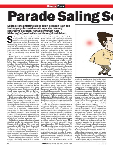 48 BERITAINDONESIA, 16 Juni - 20 Juli 2009BERITA POLITIKilustrasi: dendyParade Saling SeSaling serang antartim sukses dalam sebagian iklan danisu kampanye termasuk masih wajar dan memangseharusnya dilakukan. Namun pernyataan AndiMallarangeng awal Juli lalu sudah sangat berlebihan.aling serang antartim sukses mulaimengemuka saat SBY memilihBoediono menjadi pendampingnya untuk pemilu presiden Junimendatang. Pilihan SBY ini membuatPAN dan PKS tidak puas karena keduanyatelah memiliki cawapres untuk diajukan,yaitu Ketua MPR Hidayat Nurwahid dariPKS dan Mensesneg Hatta Rajasa dariPAN.Kedua partai itu menilai Boedionosebagai penganut paham ekonomi neoliberal yang hanya pro kepentingan pasarbebas dan bukan rakyat. Bahkan, penolakan Ketua Majelis PertimbanganPusat PAN Amin Rais memperlihatkansikap dengan tiidak menghadiri deklarasipencalonan cawapres meski tetap sepakatmendukung SBY sebagai presiden mendatang. Sedangkan PKS akhirnya menyetujui pencalonan Boediono sebagaicawapres.Saling serang kian memanas saat anggota tim sukses Rizal Mallarangeng mengadakan konferensi pers di Bravo MediaCenter, 25 Mei lalu. Pernyataan keduapasangan capres-cawapres lain yangdialamatkan pada Boediono membuatgerah pakar pencitra SBY ini. Ia berpendapat penyebutan ekonomi neoliberalatau kerakyatan hanya permainan istilah.Rizal mempertanyakan klaim pro rakyat Prabowo selama ini. Padahal, semuatahu jajak karier pensiunan jenderalbintang tiga ini, yakni dipecat oleh TNI.Ia mengkritik Prabowo yang memiliki 98ekor kuda bernilai miliaran rupiah.Karena itu ia meminta Prabowo untukinstropeksi diri dan tidak menyerang orang dengan seenaknya. “Sejarah hidup diaitu apa? Prabowo itu seorang prajurit yangdipecat dan tidak pernah membela ekonomi rakyat,” ungkap Rizat, saat itu.Selain itu, ia juga membantah tudinganmantan menko perekonomian di eraMegawati, Kwik Kian Gie yang kinimendukung JK-Win. Saat diskusi diNegarawan Center, Kwik menyebutkanBoediono itu memang penganut neoliberal dan titipan Barat. Bahkan Kwik berani menerima tantangan berdebat dengan Boediono untuk membuktikannya.Sehari setelah pernyataan Rizal, Selasa(26/5), kubu Mega mengadakan konferensi pers di Mega-Pro, Jakarta. Sekretaris Umum Tim Kampanye NasionalFadli Zon mengatakan pernyataan Rizalitu tidak berdasar, tidak rasional dankalap. Hal itu membuktikan kondisi timsukses SBY-Boediono merasa terancamoleh pesaingnya. Fadli meluruskan bahwaPrabowo bukan dipecat dari TNI, tapidiberhentikan dengan hormat. “Itu sebuah keputusan politik karena seorangmiliter di jalur komando harus beranimengambil risiko. Berbeda dengan jalurstaf, yang tangannya selalu bersih,”katanya menyindir capres lain. Fadlimengimbau Rizal dan tim sukses SBY agarberpolitik secara santun dan seharusnyamengkritik gagasan yang ditawarkan,bukan menyerang pribadi pasangan calon.Wakil Ketua Umum DPP Partai Gerindra ini juga menyebutkan bahwaekonomi kerakyatan justru berupaya agarrakyat menjadi kaya. “Tidak sepertimereka yang penganut neoliberalisme,”katanya menuding balik lawan politiknya.Mengenai harta Prabowo yang berupakuda-kuda yang super mahal, Fadlimenjelaskan, kuda-kuda yang kualitasnyabagus dan mahal itu tidak semata-matadinikmati Prabowo saja. Menurut Fadli,kuda-kuda itu diikutkan dalam Sea Gamestahun 2007. Prabowo membawa tim poloIndonesia ke Thailand. Atlet-atlet poloyang dibina Prabowo bukan dari kalanganbangsawan atau aristokrat melainkan darikalangan anak petani.Selain itu, saat ramah tamah di rumahMegawati, 28/4 lalu, Megawati melancarkan serangan balik. Ia meminta pemerintah tidak mengklaim pembangunanjembatan Surabaya-Madura (Suramadu)sebagai kinerja mereka sendiri. Karenaawal pemancangan jembatan itu dilakukan saat ia masih manjabat sebagaipresiden, yaitu 20 Agustus 2003. Megajuga mengkritik banyak menteri di kabinetdalam tim sukses SBY-Boediono dan JKWin. Menurutnya, saat pemilu tim suksesseharusnya tidak berasal dari anggotakabinet karena akan mengurangi konsentrasi dan waktu mereka di pemerintahan. Hal ini bisa menyebabkan rodapemerintahan tidak berjalan efektif danmerugikan masyarakat.Capres dari Partai Demokrat, SusiloBambang Yudhoyono juga tidak mauketinggalan. Ia menyindir bahwa pejabatjangan merangkap sebagai pengusahalantaran dikhawatirkan terjadi konflikkepentingan. Capres dari Partai GolkarJusuf Kalla menyentil balik. Sindiran SBYitu memang tampaknya ditujukan kepadaJK yang memiliki latar belakang sebagaimantan saudagar. “Kalau ada yang melarang keluarga pejabat tidak bolehberdagang, itu justru diskriminasi yangluar biasa dan melanggar HAM,” kata JKusai bersilaturahim di kediaman HabibSegaf Al-Jufri di Palu, Sulteng.Di tempat dan waktu yang berbeda, JKkembali menyindir. Dalam konteks kemandirian bangsa, JK mengatakan, pemimpin jangan peragu. Pemimpin yangragu tak bisa membawa kemajuan bagibangsa. “Kita ini bisa. Jangan ragu-ragu.Hanya peragu yang tidak bisa membawamaju,” sindirnya ketika membuka Rakernas I KNPI di Palu, Sulawesi Tengah(5/6). JK menjelaskan sikap dirinya yangtanpa ragu mengambil keputusan untukkepentingan bangsa meskipun keputusanitu mengandung risiko besar. Ia mencontohkan keputusannya yang tak maumengekspor gas ke Jepang dan negara laindengan maksud untuk menggunakan gasitu bagi kebutuhan industri dalam negeri.Tak hanya itu, JK juga menyindir capresS