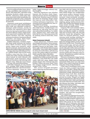 54 BERITAINDONESIA, 16 Juni - 20 Juli 2009BERITA TOKOHANTRI MINYAK TANAH: Rakyat mengantri untuk dapat minyak tanahSaat ini neoliberal bukan hanya ekonomi saja, pendidikan juga termasuk neoliberal. Jadi sudah jalan. Jadi kalau orangketakutan Boediono adalah orang neoliberalis, sebenarnya sudah jalan sekarang, pemerintah sudah menjalankan itu.Pengusaha-pengusaha asing, pengusahabesar menguasai perusahaan-perusahaandi Indonesia.Seharusnya pusat-pusat perbelanjaanseperti Carrefour tidak diperbolehkan,kalau tidak mau dikatakan neoliberal.Kalaupun sudah terlanjur, mereka itu(Carrefour dan sejenisnya) harus dapatmenerima barang-barang bikinan rakyatdan harus dibayar kontan, jangan konsinyasi yang berarti modalnya dari rakyat.Seperti misalnya, beli cabe, sekarangumumnya konsinyasi. Konsinyasi dibayarkemudian, satu bulan. Kalau begini,rakyat yang memodali Carrefour.Padahal seharusnya, Carrefour memodali rakyat untuk menanam dan hasilnyaharus dibeli Carrefour dengan hargapantas. Begitu pula Indofood, rakyatdisuruh menanam, ada kentang dan cabe,dibiayai dan hasilnya dijual sama Indofood.Air juga sekarang sudah dikuasai Prancis. Padahal dengan Aqua itu bisa menghasilkan uang yang luar biasa. Jadisumber daya alam yang bisa menghidupirakyat banyak itu mesti dikuasai olehpemerintah untuk keperluan rakyatsebanyak-banyaknya, tapi sekarang sudahdikuasai asing. Tidak lagi sesuai denganUUD 1945, dan tekad kemerdekaan.Jadi kalau Indonesia ini mau bersatuterus, menjaga NKRI (Negara KesatuanRepublik Indonesia), ekonomi kerakyatan harus dijalankan. Tanpa itu, suatuketika, tinggal menunggu waktunya saja,bisa bangkrut.Sekarang bagaimana mau jalankankoperasi, ada Carrefour, Giant, Hypermart dan macam-macam. Persaingannyaterlalu berat. Mestinya seperti Carrefourdan Giant itu kerjasama dengan petanidan koperasi mesti diharuskan. Nah,undang-undangnya bagaimana. Jadisemuanya harus melakukan itu, baru orang miskin itu tertolong.Kalau seperti sekarang, kemiskinanakan tidak teratasi. Apalagi dengan carakasih BLT itu, jadi manja. BLT itu samasaja melestarikan kemiskinan. Ya, miskinterus. Ngapain kerja, nanti terima tiapbulan Rp 100.000. Dan uang seratus ribuitu memang untuk di desa-desa, besarsekali.Hutan Tanamanan IndustriTetapi sebenarnya, Indonesia kalaumau bangkit ekonominya, harus memanfaatkan tanah-tanah yang sudah tidakproduktif, luasnya 60 juta hektar. Dulu,tahun 1998, waktu Menteri KehutanannyaJamaluddin, yang sudah tidak produktifitu sebanyak 57 juta hektar, jadi sekarangitu kira-kira paling sedikit 60 juta hektar.Itulah yang bisa segera dikerjakan.Untuk membangun hutan yang rusakmenjadi kebun kelapa sawit atau karet dansebagainya, uang senilai BLT saja sudahcukup, lebih dari cukup. Bahkan kalaupinjam dengan dana komersil juga bisakembali. Pinjam saja sama China. Chinakan uangnya sangat banyak, sekaranguangnya US$1.7 triliun.Nah, caranya mengolah datangkantraktor. Sekarang mau beli traktor 10.000juga tidak sulit dari Jepang, dari Korea.Hutan yang rusak dan tidak produktifkalau diolah dengan cara menggunakanmesin-mesin modern, biayanya rendah.Nah, supaya biayanya rendah, tenagakerjanya, selain penduduk setempat,diambil dari TNI untuk menjalankantraktor mengolah tanah ditanami padi,singkong, jagung, hasilnya banyak, kelebihan. Nah, hasilnya bisa diekspor denganharga murah, bersaing. Sebab denganharga murah pun sudah untung.Langsung TNI suruh jalankan traktor,itu dwi fungsi. Jadi orang tidak iri lagi,kalau mau jalankan traktor ya silahkan.Dulu kan iri karena (TNI) ada yang jadigubernur, bupati dan sebagainya. Tapiwaktu itu menjadi gubernur, bupatimemang untuk menjaga stabilitas keamanan dan kenyataannya bisa tertib.Sekarang jalankan traktor saja. Nantikalau hari minggu latihan perang di situ,bikin barak-barak di situ. Tentaranya jaditentara modern juga, ada hasil, jadi bisabeli pesawat terbang, bisa beli macammacam. Bisa jadi contoh, dunia nanti akanbisa melihat Indonesia itu luar biasa (danbersatu dengan rakyat). Nanti dari pemanasan global akan terkagum sama Indonesia. Kesejahteraan prajurit naik dannegara mendapat devisa.Indonesia mempunyai tenaga banyak,orang-orang yang kerja ke Malaysia bisakembali semua. Tidak seperti sekarang ini,pemerintah tidak punya rasa malu samasekali. Punya rakyat yang kerja di negaraasing dan sering-sering menderita.Untuk segera membangun hutan yangrusak dan tidak produktif diperlukansekitar 10.000 traktor. Dibagi-bagi untukKalimantan Barat, Kalimantan Timur,Kalimantan Tengah, Kalimantan Selatan,Sumatera Utara, Aceh, Riau, Jambi danlain-lain. Jadi dibagi-bagi, tiap-tiapprovinsi itu seribu. Dengan cara begitumaka pengelolahannya akan lancar sekali.Dan tanahnya subur, tidak usah dipupuksaja tanah Indonesia ini sudah subur. Apasaja ditanam bisa hidup. Jadi kalau maubekerja betul-betul pasti bisa.Sekarang ini dunia sangat kekuranganbahan baku kertas. Padahal, Indonesiasangat kaya bahan bakunya, apalagi bilahutan tanaman industri (HTI) dikembangkan. Jadi pasti bisa menghasilkandevisa yang banyak.Tapi, malah saya dipenjara karena HTI.Sebenarnya saya tidak salah, cuma karenaorang yang tidak mengerti makanya sayadipenjara. Jadi sebenarnya, HTI penghasilbahan baku kertas itu luar biasa masadepannya. HTI di Indonesia, lima tahunsudah bisa ditebang, sudah menghasilkan.Sementara kalau di China paling tidakditanam 40 tahun baru bisa ditebang.Eropa malah 80 tahun. Demikian Probosutejo. BI-BHSfoto: ist