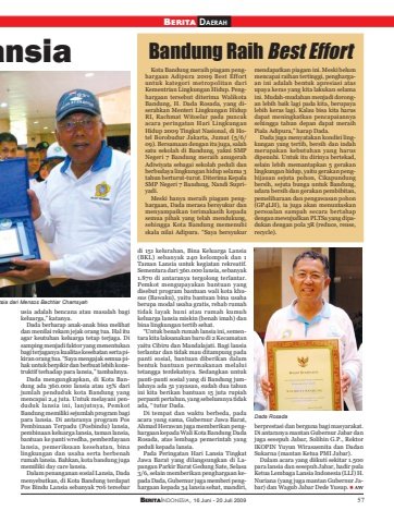 BERITAINDONESIA, 16 Juni - 20 Juli 2009 57ansiaBERITA DAERAHusia adalah bencana atau masalah bagikeluarga,” katanya.Dada berharap anak-anak bisa melihatdan menilai rekam jejak orang tua. Hal ituagar keutuhan keluarga tetap terjaga. Disamping menjadi faktor yang menentukanbagi terjaganya kualitas kesehatan serta pikiran orang tua. “Saya mengajak semua pihak untuk berpikir dan berbuat lebih konstruktif terhadap para lansia,” tambahnya.Dada mengungkapkan, di Kota Bandung ada 360.000 lansia atau 15% darijumlah penduduk kota Bandung yangmencapai 2,4 juta. Untuk melayani penduduk lansia ini, lanjutnya, PemkotBandung memiliki sejumlah program bagipara lansia. Di antaranya program PosPembinaan Terpadu (Posbindu) lansia,pembinaan keluarga lansia, taman lansia,bantuan ke panti wredha, pemberdayaanlansia, pemeriksaan kesehatan, binalingkungan dan usaha serta berbenahrumah lansia. Bahkan, kota bandung jugamemiliki day care lansia.Dalam penanganan sosial Lansia, Dadamenyebutkan, di Kota Bandung terdapatPos Bindu Lansia sebanyak 706 tersebardi 151 kelurahan, Bina Keluarga Lansia(BKL) sebanyak 240 kelompok dan 1Taman Lansia untuk kegiatan rekreatif.Sementara dari 360.000 lansia, sebanyak1.870 di antaranya tergolong terlantar.Pemkot mengupayakan bantuan yangdisebut program bantuan wali kota khusus (Bawaku), yaitu bantuan bina usahaberupa modal usaha gratis, rehab rumahtidak layak huni atau rumah kumuhkeluarga lansia miskin (benah imah) danbina lingkungan tertib sehat.“Untuk benah rumah lansia ini, sementara kita laksanakan baru di 2 Kecamatanyaitu Cibiru dan Mandalajati. Bagi lansiaterlantar dan tidak mau ditampung padapanti sosial, bantuan diberikan dalambentuk bantuan permakanan melaluitetangga terdekatnya. Sedangkan untukpanti-panti sosial yang di Bandung jumlahnya ada 51 yayasan, sudah dua tahunini kita berikan bantuan 15 juta rupiahperpanti pertahun, yang sebelumnya tidakada, “ tutur Dada.Di tempat dan waktu berbeda, padaacara yang sama, Gubernur Jawa Barat,Ahmad Herawan juga memberikan penghargaan kepada Wali Kota Bandung DadaRosada, atas lembaga pemerintah yangpeduli kepada lansia.Pada Peringatan Hari Lansia TingkatJawa Barat yang dilangsungkan di Lapangan Parkir Barat Gedung Sate, Selasa3/6, selain memberikan penghargaan kepada Dada, Gubernur juga memberi penghargaan kepada 34 lansia sehat, mandiri,berprestasi dan berguna bagi masyarakat.Di antaranya mantan Gubernur Jabar danjuga sesepuh Jabar, Solihin G.P., RektorIKOPIN Yuyun Wirasasmita dan DadanSukarna (mantan Ketua PMI Jabar).Dalam acara yang diikuti sekitar 1.500para lansia dan sesepuh Jabar, hadir pulaKetua Lembaga Lansia Indonesia (LLI) H.Nuriana (yang juga mantan Gubernur Jabar) dan Wagub Jabar Dede Yusup. AWBandung Raih Best EffortKota Bandung meraih piagam penghargaan Adipura 2009 Best Effortuntuk kategori metropolitan dariKementrian Lingkungan Hidup. Penghargaan tersebut diterima WalikotaBandung, H. Dada Rosada, yang diserahkan Menteri Lingkungan HidupRI, Rachmat Witoelar pada puncakacara peringatan Hari LingkunganHidup 2009 Tingkat Nasional, di Hotel Borobudur Jakarta, Jumat (5/6/09). Bersamaan dengan itu juga, salahsatu sekolah di Bandung, yakni SMPNegeri 7 Bandung meraih anugerahAdiwiyata sebagai sekolah peduli danberbudaya lingkungan hidup selama 3tahun berturut-turut. Diterima KepalaSMP Negeri 7 Bandung, Nandi Supriyadi.Meski hanya meraih piagam penghargaan, Dada merasa bersyukur danmenyampaikan terimakasih kepadasemua pihak yang telah mendukung,sehingga Kota Bandung memenuhiskala nilai Adipura. “Saya bersyukurmendapatkan piagam ini. Meski belummencapai raihan tertinggi, penghargaan ini adalah bentuk apresiasi atasupaya keras yang kita lakukan selamaini. Mudah-mudahan menjadi dorongan lebih baik lagi pada kita, berupayalebih keras lagi. Kalau bisa kita harusdapat meningkatkan pencapaiannyasehingga tahun depan dapat meraihPiala Adipura,” harap Dada.Dada juga menyatakan kondisi lingkungan yang tertib, bersih dan indahmerupakan kebutuhan yang harusdipenuhi. Untuk itu dirinya bertekad,selain lebih memantapkan 5 gerakanlingkungan hidup, yaitu gerakan penghijauan sejuta pohon, Cikapundungbersih, sejuta bunga untuk Bandung,udara bersih dan gerakan pembibitan,pemeliharaan dan pengawasan pohon(GP4LH), ia juga akan menuntaskanpersoalan sampah secara bertahapdengan mewujudkan PLTSa yang dipadukan dengan pola 3R (reduce, reuse,recycle).nsia dari Mensos Bachtiar ChamsyahDada Rosada
