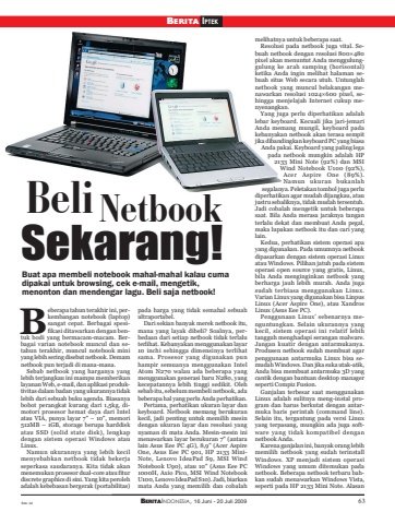 BERITAINDONESIA, 16 Juni - 20 Juli 2009 63BERITA IPTEKfoto: istBeli NetbookSekarang!Buat apa membeli notebook mahal-mahal kalau cumadipakai untuk browsing, cek e-mail, mengetik,menonton dan mendengar lagu. Beli saja netbook!eberapa tahun terakhir ini, perkembangan notebook (laptop)sangat cepat. Berbagai spesifikasi ditawarkan dengan bentuk bodi yang bermacam-macam. Berbagai varian notebook muncul dan setahun terakhir, muncul notebook miniyang lebih sering disebut netbook. Demamnetbook pun terjadi di mana-mana.Sebab netbook yang harganya yanglebih terjangkau ini mampu memberikanlayanan Web, e-mail, dan aplikasi produktivitas dalam badan yang ukurannya tidaklebih dari sebuah buku agenda. Biasanyabobot perangkat kurang dari 1,5kg, dimotori prosesor hemat daya dari Intelatau VIA, punya layar 7\512MB – 1GB, storage berupa harddiskatau SSD (solid state disk), lengkapdengan sistem operasi Windows atauLinux.Namun ukurannya yang lebih kecilmenyebabkan netbook tidak bekerjaseperkasa saudaranya. Kita tidak akanmenemukan prosesor dual-core atau fiturdiscrete graphics di sini. Yang kita perolehadalah kebebasan bergerak (portabilitas)pada harga yang tidak semahal sebuahultraportabel.Dari sekian banyak merek netbook itu,mana yang layak dibeli? Soalnya, perbedaan dari setiap netbook tidak terlaluterlihat. Kebanyakan menggunakan layar10 inchi sehingga dimensinya terlihatsama. Prosesor yang digunakan punhampir semuanya menggunakan IntelAtom N270 walau ada beberapa yangmenggunakan generasi baru N280, yangkecepatannya lebih tinggi sedikit. Olehsebab itu, sebelum membeli netbook, adabeberapa hal yang perlu Anda perhatikan.Pertama, perhatikan ukuran layar dankeyboard. Netbook memang berukurankecil, jadi penting untuk memilih mesindengan ukuran layar dan resolusi yangnyaman di mata Anda. Mesin-mesin inimenawarkan layar berukuran 7\lain Asus Eee PC 4G), 8,9\One, Asus Eee PC 901, HP 2133 MiniNote, Lenovo IdeaPad S9, MSI WindNotebook U90), atau 10\1000H, Axio Pico, MSI Wind NotebookU100, Lenovo IdeaPad S10). Jadi, biarkanmata Anda yang memilih dan cobalahmelihatnya untuk beberapa saat.Resolusi pada netbook juga vital. Sebuah netbook dengan resolusi 800×480pixel akan menuntut Anda menggulunggulung ke arah samping (horisontal)ketika Anda ingin melihat halaman sebuah situs Web secara utuh. Untunglahnetbook yang muncul belakangan menawarkan resolusi 1024×600 pixel, sehingga menjelajah Internet cukup menyenangkan.Yang juga perlu diperhatikan adalahlebar keyboard. Kecuali jika jari-jemariAnda memang mungil, keyboard padakebanyakan netbook akan terasa sempitjika dibandingkan keyboard PC yang biasaAnda pakai. Keyboard yang paling legapada netbook mungkin adalah HP2133 Mini Note (92%) dan MSIWind Notebook U100 (92%),Acer Aspire One (89%).Namun ukuran bukanlahsegalanya. Peletakan tombol juga perludiperhatikan agar mudah dijangkau, ataujustru sebaliknya, tidak mudah tersentuh.Jadi cobalah mengetik untuk beberapasaat. Bila Anda merasa jaraknya tanganterlalu dekat dan membuat Anda pegal,maka lupakan netbook itu dan cari yanglain.Kedua, perhatikan sistem operasi apayang digunakan. Pada umumnya netbookdipasarkan dengan sistem operasi Linuxatau Windows. Pilihan jatuh pada sistemoperasi open source yang gratis, Linux,bila Anda menginginkan netbook yangberharga jauh lebih murah. Anda jugasudah terbiasa menggunakan Linux.Varian Linux yang digunakan bisa LinpusLinux (Acer Aspire One), atau XandrosLinux (Asus Eee PC).Penggunaan Linux’ sebenarnya menguntungkan. Selain ukurannya yangkecil, sistem operasi ini relatif lebihtangguh menghadapi serangan malware.Jangan kuatir dengan antarmukanya.Produsen netbook sudah membuat agarpenggunaan antarmuka Linux bisa semudah Windows. Dan jika suka utak-atik,Anda bisa membuat antarmuka 3D yangcantik dengan bantuan desktop managerseperti Compiz Fusion.Ganjalan terbesar saat menggunakanLinux adalah sulitnya meng-instal program dan harus berkutat dengan antarmuka baris perintah (command line).Selain itu, tergantung pada versi Linuxyang terpasang, mungkin ada juga software yang tidak kompatibel dengannetbook Anda.Karena ganjalan ini, banyak orang lebihmemilih netbook yang sudah terinstallWindows. XP menjadi sistem operasiWindows yang umum ditemukan padanetbook. Beberapa netbook terbaru bahkan sudah menawarkan Windows Vista,seperti pada HP 2133 Mini Note. AlasanB