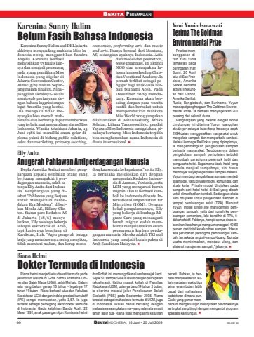 66 BERITAINDONESIA, 16 Juni - 20 Juli 2009BERITA PEREMPUANKarenina Sunny HalimBelum Fasih Bahasa IndonesiaYuni Yunia IsmawatiTerima The GoldmanEnvironmental PrizePrestasi membanggakan diraih Yuni YuniaIsmawati padaperingatan HariBumi, 20 Aprillalu, di San Fransisco, AmerikaSerikat. Bersamaaktivis lingkungan dari Gabon,Amerika Serikat,Rusia, Bangladesh, dan Suriname, Yuyunmendapat penghargaan The Goldman Environmental Prize. Ia berhasil menyingkirkan 200pesaing dari seluruh dunia.Penghargaan yang dikenal dengan NobelLingkungan ini diterima Yuyun -panggilanakrabnya- sebagai buah kerja kerasnya sejak1994 dalam menggerakkan masyarakat untukmengelola sampah dan memperbaiki sanitasi.Melalui lembaga BaliFokus yang dipimpinnya,ia mengembangkan pengelolaan sampahberbasis masyarakat. Terobosannya dalampengelolaan sampah perhotelan terbuktimengubah paradigma peternak babi danpengusaha hotel. Bagaimana tidak, hotel yangsemula menjual sampahnya, kini harusmembayar biaya pengelolaan sampah mereka.Yuyun membagi pengelolaaan sampah menjaditiga model, yaitu private model, komunitas, danskala kota. Private model ditujukan padasampah dari hotel-hotel di Bali yang diolahuntuk dimanfaatkan kembali. Sedangkan skalakota ditujukan untuk pengelolaan sampah ditempat pembuangan akhit (TPA). MenurutYuyun, model single line management pembuangan sampah, yaitu dari rumah ke pembuangan sementara, lalu berakhir di TPA, tidaklah efektif. Faktanya, hampir semua dinas kebersihan kota hanya mampu menangani 40-60persen dari total keseluruhan sampah. “Harusada perubahan paradigma pembuangan sampah, tak sekadar angkut-kumpul-buang. Tapi adausaha meminimalkan, mendaur ulang, danefisiensi manajemen sampah,” jelasnya. Elly AnitaAnugerah Pahlawan Antiperdagangan ManusiaRiana HelmiDokter Termuda di IndonesiaRiana Helmi menjadi wisudawati termuda padapelantikan wisuda di Grha Sabha Pramana Universitas Gajah Mada (UGM), akhir Mei lalu. Dalamusia yang belum genap 18 tahun - tepatnya 17tahun 11 bulan - Riana berhasil lulus dari FakultasKedokteran UGM dengan indeks prestasi kumulatif(IPK) sangat memuaskan, yaitu 3,67. Ia jugatercatat sebagai pemegang rekor dokter termudadi Indonesia. Gadis kelahiran Banda Aceh, 22Maret 1991, anak pasangan Ajun Komisaris Helmidan Rofiah ini, memang dikenal cerdas sejak kecil.Sejak SD sampai SMA ia lewati dengan percepatan(akselerasi). Ketika masuk kuliah di FakultasKedokteran UGM, usianya baru 14 tahun 3 bulan,ia diterima melalui jalur Penelusuran BakatSkolastik (PBS) pada September 2005. Rianatercatat sebagai mahasiswa termuda di UGM, jugadi Indonesia. Walau harus bersaing denganmahasiswa seangkatannya –yang rata-rata empattahun lebih tua- Riana tidak mengalami kesulitanberarti. Bahkan, ia berhasil menyelesaikan kuliahnya dalam waktu tigatahun enam bulan, lebihcepat dari mahasiswakedokteran di mana pun.Gadis yang gemar membaca ini mengaku ingin melanjutkan pendidikannyake tingkat yang tinggi dengan mengambil programspesialis kandungan. Karenina Sunny Halim asal DKI Jakartaakhirnya menyandang mahkota Miss Indonesia 2009, menggantikan SandraAngelia. Karenina berhasilmenyisihkan 33 finalis lainnya dan menjadi pemenangpada ajang pemilihan MissIndonesia yang digelar diJakarta Convention Center,Jumat (5/6) malam. Sepanjang malam final itu, Nina -panggilan akrabnya- selalumenjawab pertanyaan dengan bahasa Inggris denganlogat Amerika yang kental.Dia mengaku tidak menyangka bisa meraih mahkota ini dan berharap dapat memberikanyang terbaik saat menyandang status MissIndonesia. Wanita kelahiran Jakarta, 13Juni 1986 ini memiliki enam gelar diploma yakni di bidang public relations,sales dan marketing, primary teaching,economics, performing arts dan musicand arts. Ibunya berasal dari Montana,AS, sedangkan ayahnya Indonesia. Adikdari model dan pesinetron,Steve Imannuel, ini aktif diNGO dan merupakan lulusan homeschooling Christian Vocational Academy. Iapernah terlibat sebagai pengajar bagi anak-anak korban tsunami Aceh. PadaDesember 2009 mendatang, Karenina akan bersaing dengan para wanitacantik dan berbakat untukmemperebutkan mahkotaMiss World 2009 yang akandilaksanakan di Johannesburg, AfrikaSelatan. Liliana Tanoesoedibjo, pendiriYayasan Miss Indonesia mengatakan, pihaknya berharap Miss Indonesia terpilihbisa mengharumkan nama Indonesia didunia internasional. Deplu Amerika Serikat memberi penghargaan kepada sembilan orang yangberjuang mengakhiri perdagangan manusia, salah satunya Elly Anita dari Indonesia. Penghargaan yang disebut “Pahlawan yang Berjasauntuk Mengakhiri Perbudakan Era Modern”, diberikan Menlu AS, Hillary Clinton. Siaran pers Kedubes ASdi Jakarta (18/6) menyebutkan, Elly awalnya bekerjasebagai sekretaris di Arab,tapi kariernya berujung diKurdistan, Irak. “Agen pengerah tenagakerja yang membawanya sering menyiksa,tidak memberi makan, dan kerap menodongkan senjata ke kepalanya,” cerita Elly.Ia berusaha meloloskan diri denganmengontak Kedubes Indonesia di Amman, Yordania, sertaLSM yang mengurusi buruhmigran. Dan ia berhasil kembali ke Indonesia dibantu International Organization forMigration (IOM). Denganbekal pengalamannya, Ellyyang bekerja di lembaga Migrant Care yang menanganiburuh migran sudah membantu menyelamatkan enamperempuan korban perdagangan manusia. Mereka adalah TKI asalIndonesia yang menjadi buruh paksa diArab Saudi dan Malaysia. foto-foto: ist