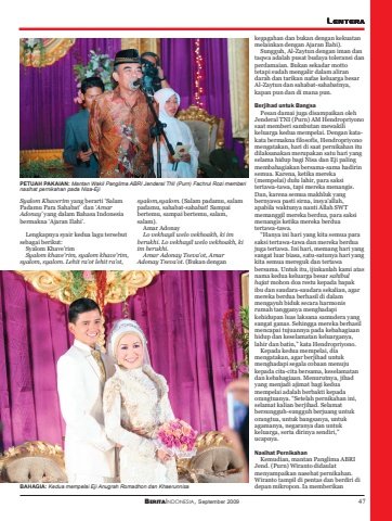 BERITAINDONESIA, September 2009 47LENTERASyalom Khaverim yang berarti ‘SalamPadamu Para Sahabat’ dan ‘AmarAdonay’ yang dalam Bahasa Indonesiabermakna ‘Ajaran Ilahi’.Lengkapnya syair kedua lagu tersebutsebagai berikut:Syalom Khave’rimSyalom khave’rim, syalom khave’rim,syalom, syalom. Lehit ra’ot lehit ra’ot,syalom,syalom. (Salam padamu, salampadamu, sahabat-sahabat! Sampaibertemu, sampai bertemu, salam,salam).Amar AdonayLo vekhayil welo vekhoakh, ki imberukhi. Lo vekhayil welo vekhoakh, kiim berukhi.Amar Adonay Tseva’ot, AmarAdonay Tseva’ot. (Bukan dengankegagahan dan bukan dengan kekuatanmelainkan dengan Ajaran Ilahi).Sungguh, Al-Zaytun dengan iman dantaqwa adalah pusat budaya toleransi danperdamaian. Bukan sekadar mottotetapi sudah mengalir dalam alirandarah dan tarikan nafas keluarga besarAl-Zaytun dan sahabat-sahabatnya,kapan pun dan di mana pun.Berjihad untuk BangsaPesan damai juga disampaikan olehJenderal TNI (Purn) AM Hendropriyonosaat memberi sambutan mewakilikeluarga kedua mempelai. Dengan katakata bermakna filosofis, Hendropriyonomengatakan, hari di saat pernikahan itudilaksanakan merupakan satu hari yangselama hidup bagi Nisa dan Eji palingmembahagiakan bersama-sama hadirinsemua. Karena, ketika mereka(mempelai) dulu lahir, para saksitertawa-tawa, tapi mereka menangis.Dan, karena semua makhluk yangbernyawa pasti sirna, insya’allah,apabila waktunya nanti Allah SWTmemanggil mereka berdua, para saksimenangis ketika mereka berduatertawa-tawa.“Hanya ini hari yang kita semua parasaksi tertawa-tawa dan mereka berduajuga tertawa. Ini hari, memang hari yangsangat luar biasa, satu-satunya hari yangkita semua mereguk dan tertawabersama. Untuk itu, ijinkanlah kami atasnama kedua keluarga besar sahibulhajat mohon doa restu kepada bapakibu dan saudara-saudara sekalian, agarmereka berdua berhasil di dalammengayuh biduk secara harmonisrumah tangganya menghadapikehidupan luas laksana samudera yangsangat ganas. Sehingga mereka berhasilmencapai tujuannya pada kebahagiaanhidup dan keselamatan keluarganya,lahir dan batin,” kata Hendropriyono.Kepada kedua mempelai, diamengatakan, agar berjihad untukmenghadapi segala cobaan menujukepada cita-cita bersama, keselamatandan kebahagiaan. Menurutnya, jihadyang menjadi ajimat bagi keduamempelai adalah berbakti kepadaorangtuanya. “Setelah pernikahan ini,selamat kalian berjihad. Selamatbersungguh-sungguh berjuang untukorangtua, untuk bangsanya, untukagamanya, negaranya dan untukkeluarga, serta dirinya sendiri,”ucapnya.Nasihat PernikahanKemudian, mantan Panglima ABRIJend. (Purn) Wiranto didaulatmenyampaikan nasehat pernikahan.Wiranto tampil di pentas dan berdiri didepan mikropon. Ia memberikanPETUAH PAKAIAN: Mantan Wakil Panglima ABRI Jenderal TNI (Purn) Fachrul Rozi memberinasihat pernikahan pada Nisa-EjiBAHAGIA: Kedua mempelai Eji Anugrah Romadhon dan Khaerunnisa