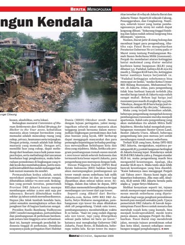 BERITAINDONESIA, September 2009 53ngun Kendalakauan, aksebilitas, serta lokasi.Sedangkan menurut Commision of Human Settlements dan Global Strategy forShelter to the Year 2000, kebutuhanmanusia akan tempat bermukim yangmemadai adalah mencakup ruang yangcukup, privacy, keamanan serta terjangkau.Dengan prinsip, rumah adalah hak hidupmanusia yang memadai. Dengan arti,memiliki luas yang cukup, dapat melindungi dari keadaan cuaca baik panas maupun hujan, serta melindungi dari ancamankesehatan bagi penghuninya, maka keberadaan pemukiman di lingkungan yang tidak layak dan membahayakan, justru menjadi kontradiktif dan malah melanggar hakhak nurani manusia itu sendiri.Permasalahan kedua adalah, untukmerelokasi penghuni bantaran sungai,dibutuhkan sekitar 70.000 unit. Sedangkan yang pernah tercetus, pemerintahProvinsi DKI Jakarta hanya mampumembangun sekitar 2.000 unit saja pertahunnya. Berarti dibutuhkan waktusekitar 35 tahun untuk merealisasikannya.Itupun jika tidak tumbuh kendala baru,yakni semakin meningkatnya urban danpenghuni liar di bagian bantaran sungai.Presiden Susilo Bambang Yudhoyono(SBY ) sendiri mengatakan, pertumbuhandan pembangunan di perkotaan berdampak antara lain tingginya arus urbanisasi.Saat ini, hampir setengah penduduk Indonesia tinggal di perkotaan. Demikianucapannya pada peringatan Hari HabitatDunia (HHD) Oktober 2008. Sesuaidengan tujuan peringatan, yakni mengingatkan seluruh umat manusia akantanggung jawab bersama dalam mewujudkan lingkungan permukiman dan hakatas hunian yang layak, SBY berharapdapat menggugah masyarakat dan parapemangku kepentingan terhadap pentingnya mewujudkan kehidupan kota dandesa yang sejahtera. Maka, ketika ada program pembangunan rumah susun murah1.000 tower untuk seluruh Indonesia dantermasuk kota besar seperti Jakarta, parapengembang pun merespon dengan baik.Dewan Pengurus Daerah (DPD) RealEstate Indonesia (REI) bahkan berjanjiakan merampungkan pembangunan 90tower rumah susun sederhana hak milik(Rusunami) tahun ini dan 30 tower lagidipastikan akan selesai tahun 2010. Sehingga, dalam dua tahun ke depan, DPDREI akan memenuhi kewajibannya denganmembangun 120 tower dari 250 tower.Seperti yang dikutif dari BeritaJakarta.com, Ketua DPD REI DKI Jakarta, Setyo Maharso mengatakan, pembangunan 250 tower itu akan dilakukanoleh 28 pengembang. Untuk satu tower,pembangunannya membutuhkan waktu8-12 bulan. “Saat ini yang sudah digarapada 120 tower, tapi yang ditargetkanselesai pada tahun ini baru 90 tower,”katanya usai menghadap Gubernur DKIJakarta, Fauzi Bowo, di Balaikota, beberapa waktu lalu. Ke-90 tower itu mayoritas tersebar di wilayah Jakarta Barat danJakarta Timur. Seperti di wilayah Cakung,Pesanggarahan, dan Cengkareng. Nantinya, seluruh tower yang tuntas pembangunannya pada 2009 ini sudah dapatlangsung dihuni. “Sekarang tinggal finishing dan kalau sudah selesai langsung bisaditempati,” ujarnya.Namun, ibarat petir di siang bolong danmembuat kaget para pengembang, tibatiba saja Fauzi Bowo mengeluarkanPeraturan Gubernur No 27/2009 pada 17Maret 2009 tentang Pembangunan Rumah Susun Sederhana Milik (rusunami).Pergub itu membatasi aturan ketinggianlantai maksimal yang diatur melaluikoefisien lantai bangunan (KLB) yangdibatasi 3,5. Padahal, tadinya KLB-nya itumasih 5. Dengan KLB baru itu, ketinggianlantai nantinya hanya berjumlah 12.“Padahal ketinggian sebelumnya bisamencapai 20 lantai,” tandas Ketua UmumREI Bidang Rusunami, Muhammad Nawir, di Jakarta. Jelas, para pengembangtidak bisa berbuat banyak terlebih jikamenilai harga tanah di Jakarta saja sudahsangat mahal. Belum lagi harga jualrusunami pun masih di angka Rp 144 juta.“Idealnya, dengan KLB baru harga jual rusunami itu sekitar Rp 180 juta,” tukasnya.Maka yang terjadi kemudian adalah,beberapa pengembang mengubah konseppembangunan rusunami mereka menjadiapartemen. Salah satu pengembang yangakan melakukan itu adalah Mitra SafirSejahtera. Mereka bakal mengubah pembangunan rusunami Sunter Green Land,Sunter Jakarta Utara. Alhasil, beberapapengembang lain pun merasa jeri untukmembangun rumah susun sederhana.Terkait KLB yang baru, Ketua DPD REIDKI Jakarta, mengatakan, sejatinya penetapan KLB 3,5 untuk bangunan bertingkatdi Jakarta kurang tepat. Standarnya untukKLB di DKI Jakarta yaitu 4. Dengan standarKLB ini, maka pengembang masih bisamengambil keuntungan. Apalagi, jikastandar KLB-nya 6. Maka tentu akan lebihbanyak keuntungan yang bisa diambil.“Kami bukannya mau menggugat Pergub136 Tahun 2007. Hanya kami ingin adakepastian hukumnya. Jika mau adil, idealnya, KLB untuk DKI Jakarta berada padaangka 4,” papar Setyo Maharso.Melihat kenyataan seperti ini, tujuanuntuk mempercepat membangun rumahsusun murah sederhana yang diprioritaskan bagi warga penghuni pemukimankumuh pun menjadi semakin jauh. Upayapemerintah DKI Jakarta di bawah kepemimpinan Fauzi Bowo untuk menata danmerubah wajah kota yang kumuh, bisamenjadi kontraproduktif, meski tentupunya alasan, mengapa Pergub itu dikeluarkan. Fauzi ibarat siap mendobrakjalan, menuju tujuan pemukiman sehatdan kota ideal, namun sekaligus membangun tanggul penghalangnya. DENBERITA METROPOLITANungai Ciliwung