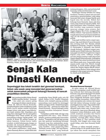 54 BERITAINDONESIA, September 2009Senja KalaDinasti KennedySepeninggal dua tokoh terakhir dari generasi keempat,belum ada sosok yang menonjol dari generasi kelimauntuk meneruskan pengaruh keluarga Kennedy di kancahperpolitikan Amerika.igur penting terakhir dalam dinastipolitik Amerika Serikat – Kennedy- dan salah satu senator palingberpengaruh dalam sejarah perpolitikan AS, Edward Moore Kennedy,menghembuskan nafas terakhirnya padaSelasa (25/8) malam setelah bertarungdengan tumor otak ganas yang dideritanya sejak setahun lalu. Kepergian priayang biasa dipanggil Ted ini merupakankehilangan besar dunia politik AS yangmenyebutnya sebagai “bapak politik”. Tedberada di Senat AS selama hampir 50tahun lamanya. Dalam kurun waktutersebut, ia telah bekerjasama dengan 10presiden AS, termasuk adiknya sendiri,Presiden John Fitzgerald Kennedy.Dua pekan sebelumnya, sang kakak,Eunice Kennedy Shriver, sudah lebih dulumenghadap Sang Khalik pada usia 88tahun, Selasa (11/8). Pendiri OlmpiadeKhusus serta menjadi pejuang pembelapenyandang cacat mental itu meninggalakibat serangan stroke. Setelah kepergianEunice dan Ted – generasi ke empat daridinasti Kennedy - banyak kalangan mulaimempertanyakan kelanjutan DinastiKennedy.“Tampaknya sudah tidak ada lagi yangmengambil-alih obor,” kata ThomasWhalen, profesor politik pada UniversitasBoston. “Tampaknya tak ada lagi seorangpun dari generasi mendatang keluargaKennedy yang bisa melanjutkan mengambil peran. Ted Kennedy mungkin garisyang terakhir,” kata pengarang buku“Kennedy versus Lodge: The 1952 Massachusetts Senate Race” yang berkisahtentang abangnya, John, saat pertama kaliberjuang untuk merebut kursi senat.Pandangan Thomas Whalen itu cukupberalasan. Pasalnya, belum satu pun daripenerusnya, generasi kelima, yang cukupmenonjol dan setara dengan kiprah parabapak atau ibu mereka. Malah darikeluarga besar Kennedy, hanya ada limanama yang terjun ke kancah politik. Darigaris keturunan John F Kennedy, hanyaada Caroline yang namanya sempatmencuat sebagai calon senator dariNegara Bagian New York, menggantikanHillary Clinton. Tapi upayanya kandas ditengah jalan karena perempuan kelahiran1957 itu tak berpengalaman di kancahpolitik.Yang agak berkibar justru empat sepupunya: tiga anak Robert Francis Kennedydan seorang anak Ted. Mereka adalahKathleen H. Kennedy, Joseph P. KennedyII, Christopher G. Kennedy, dan PatrickJoseph Kennedy. Kathleen sempat menduduki posisi Wakil Gubernur Maryland,tapi gagal merebut kursi gubernur negarabagian yang sama. Adiknya Joseph,tercatat sebagai mantan wakil rakyat dariNegara Bagian Massachusetts. SedangkanChristopher baru akan berebut kursi senatdari Illinois pada 2010. Yang sudah cukupmapan justru anak Ted, Patrick JosephKennedy. Ia masih duduk sebagai wakilrakyat dari Negara Bagian Rhode Island.Joseph sering disebut-sebut sebagai calonpengganti yang sangat potensial. Namun,itu masih perlu dibuktikan.Menutup Generasi KeempatDi mata rakyat AS, Edward MooreKennedy merupakan sosok terakhir paling terkenal dari keluarga Kennedy.Kennedy yang akrab dipanggil Ted adalahputra terakhir Joseph P Kennedy danRose Fitzgerald Kennedy serta bungsudari sembilan bersaudara. Edward Kennedy merupakan satu-satunya dari empatlaki-laki dalam keluarga tersebut yangmeninggal secara wajar. Tiga saudara lakilakinya, Presiden John F. Kennedy,dibunuh pada tahun 1963. Senator Robert Kennedy, juga tewas ditembak dalamkampanye yang dilakukan pada 1968untuk nominasi presiden dari PartaiDemokrat. Lelaki yang paling sulung, JoeKennedy, seorang pilot, tewas semasaPerang Dunia II. Dari sembilan anakKennedy, kini tinggal satu orang yangmasih hidup, yaitu Jean Kennedy Smith(81).Selama 47 tahun menjadi senator -terlama ketiga di AS setelah Robert Byrd(50 tahun dan masih menjabat) danFBERITA MANCANEGARADINASTI: Joseph P. Kennedy dan isterinya Rosemary Kennedy berfoto bersama sembilananaknya (1938). (Ki-ka) Duduk: Eunice, Jean, Edward (dipangku), Patricia, dan Kathleen. Berdiri:Rosemary, Robert, John dan istri, dan Josephfoto-foto: daylife.com