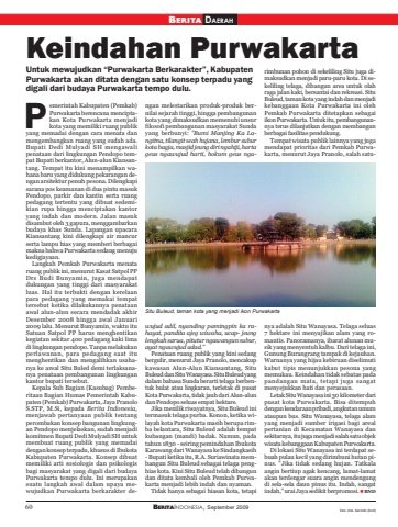 60 BERITAINDONESIA, September 2009BERITA DAERAHKeindahan PurwakartaUntuk mewujudkan “Purwakarta Berkarakter”, KabupatenPurwakarta akan ditata dengan satu konsep terpadu yangdigali dari budaya Purwakarta tempo dulu.emerintah Kabupaten (Pemkab)Purwakarta berencana menciptakan Kota Purwakarta menjadikota yang memiliki ruang publikyang memadai dengan cara menata danmengembangkan ruang yang sudah ada.Bupati Dedi Mulyadi SH mengawalipenataan dari lingkungan Pendopo tempat Bupati berkantor, Alun-alun Kiansantang. Tempat itu kini menampilkan wahana baru yang didukung pekarangan dengan arsitektur penuh pesona. Dilengkapisarana pos keamanan di dua pintu masukPendopo, parkir dan kantin serta ruangpedagang tertentu yang dibuat sedemikian rupa hingga menciptakan kantoryang indah dan modern. Jalan masukdisambut oleh 3 gapura, menggambarkanbudaya khas Sunda. Lapangan upacaraKiansantang kini dilengkapi air mancurserta lampu hias yang memberi berbagaimakna bahwa Purwakarta sedang menujukedigjayaan.Langkah Pemkab Purwakarta menataruang publik ini, menurut Kasat Satpol PPDrs Budi Bunyamin, juga mendapatdukungan yang tinggi dari masyarakatluas. Hal itu terbukti dengan kerelaanpara pedagang yang memakai tempattersebut ketika dilakukannya penataanawal alun-alun secara mendadak akhirDesember 2008 hingga awal Januari2009 lalu. Menurut Bunyamin, waktu ituSatuan Satpol PP harus menghentikankegiatan sekitar 400 pedagang kaki limadi lingkungan pendopo. Tanpa melakukanperlawanan, para pedagang saat itumenghentikan dan mengalihkan usahanya ke areal Situ Buled demi terlaksananya penataan pembangunan lingkungankantor bupati tersebut.Kepala Sub Bagian (Kasubag) Pemberitaan Bagian Humas Pemerintah Kabupaten (Pemkab) Purwakarta, Jaya PranoloS.STP, M.Si, kepada Berita Indonesia,menjawab pertanyaan publik tentangperombakan konsep bangunan lingkungan Pendopo menjelaskan, sudah menjadikomitmen Bupati Dedi Mulyadi SH untukmembuat ruang publik yang memadaidengan konsep terpadu, khusus di IbukotaKabupaten Purwakarta. Konsep dibuatmemiliki arti sosiologis dan psikologisbagi masyarakat yang digali dari budayaPurwakarta tempo dulu. Ini merupakansuatu langkah awal dalam upaya mewujudkan Purwakarta berkarakter dengan melestarikan produk-produk bernilai sejarah tinggi, hingga pembangunankota yang dimaksudkan memenuhi unsurfilosofi pembangunan masyarakat Sundayang berbunyi: ’’Bumi Manjing Ka Langitna, tilangit seah hujana, lembur suburkota bagja, masjid jeung diri ngahiji, hartageus ngawujud harti, hokum geus ngarimbunan pohon di sekeliling Situ juga dimaksudkan menjadi paru-paru kota. Di sekeliling telaga, dibangun area untuk olahraga jalan kaki, bersantai dan rekreasi. SituBuleud, taman kota yang indah dan menjadikebanggaan Kota Purwakarta ini olehPemkab Purwakarta ditetapkan sebagaiikon Purwakarta. Untuk itu, pembangunannya terus dilanjutkan dengan membangunberbagai fasilitas pendukung.Tempat wisata publik lainnya yang jugamendapat prioritas dari Pemkab Purwakarta, menurut Jaya Pranolo, salah satuwujud adil, nyanding pamingpin ka rahayat, pandita ajeg wiwaha, ucap- jeunglengkah sarua, pitutur ngawangun subur,ayat ngawujud adad.’’Penataan ruang publik yang kini sedangbergulir, menurut Jaya Pranolo, mencakupkawasan Alun-Alun Kiansantang, SituBuleud dan Situ Wanayasa. Situ Buleud yangdalam bahasa Sunda berarti telaga berbentuk bulat atau lingkaran, terletak di pusatKota Purwakarta, tidak jauh dari Alun-alundan Pendopo seluas empat hektare.Jika menilik riwayatnya, Situ Buleud initermasuk telaga purba. Konon, ketika wilayah kota Purwakarta masih berupa rimba belantara, Situ Buleud adalah tempatkubangan (mandi) badak. Namun, padatahun 1830 - seiring pemindahan IbukotaKarawang dari Wanayasa ke Sindangkasih- Bupati ketika itu, R.A. Suriawinata membangun Situ Buleud sebagai telaga penghias kota. Kini Situ Buleud telah dibangundan ditata kembali oleh Pemkab Purwakarta menjadi lebih indah dan nyaman.Tidak hanya sebagai hiasan kota, tetapinya adalah Situ Wanayasa. Telaga seluas7 hektare ini menyajikan alam yang romantis. Panoramanya, ibarat alunan musik yang menyentuh kalbu. Dari telaga ini,Gunung Burangrang tampak di kejauhan.Warnanya yang hijau kebiruan diselimutikabut tipis menunjukkan pesona yangmemukau. Keindahan tidak sebatas padapandangan mata, tetapi juga sangatmenyejukkan hati dan perasaan.Letak Situ Wanayasa ini 30 kilometer daripusat kota Purwakarta. Bisa ditempuhdengan kendaraan pribadi, angkutan umumataupun bus. Situ Wanayasa, telaga alamyang menjadi sumber irigasi bagi arealpertanian di Kecamatan Wanayasa dansekitarnya, itu juga menjadi salah satu objekwisata kebanggaan Kabupaten Purwakarta.Di lokasi Situ Wanayasa ini terdapat sebuah pulau kecil yang dirimbuni hutan pinus. “Jika tidak sedang hujan. Tatkalaangin bertiup agak kencang, lamat-lamatakan terdengar suara angin mendengungdi sela-sela daun pinus itu. Indah, sangatindah,” urai Jaya sedikit berpromosi. BNDPSitu Buleud, taman kota yang menjadi ikon Purwakartafoto: dok. berindo (bnd)