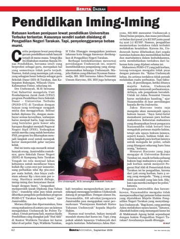 62 BERITAINDONESIA, September 2009BERITA DAERAHPendidikan Iming-ImingRatusan korban penipuan lewat pendidikan UniversitasTerbuka terlantar. Kasusnya sendiri sudah disidang diPengadilan Negeri Tarakan. Tapi, penyelenggaranya bebasmurni.erita penipuan lewat penyelenggaraan pendidikan sudah banyakterjadi di mana-mana. Tetapi jikaitu dilakukan mantan Kepala Dinas Pendidikan, bersama isteri yangberprofesi sebagai guru, merupakan halyang semestinya tidak perlu terjadi.Namun, itulah yang menimpa 326 orang,yang sebagian besar bekerja sebagai guruSekolah Dasar (SD) di Tarakan, dan Kabupaten Bulungan, Wilayah UtaraKalimantan Timur, sekarang ini.Drs Undunsyah, M.Si bersamaUmi Suhartini mengelola UnitPembelajaran Jarak Jauh (UPJJ)program Pendidikan Guru SekolahDasar - Universitas Terbuka(PGSD-UT) di Tarakan dengantujuan yang terdengar sungguhmulia dan menggiurkan. Selesaikuliah diploma D2, dengan membayar semua kewajiban, walaupunharus menjual harta, bagi merekayang berstatus guru honor adaharapan diangkat menjadi PegawaiNegeri Sipil (PNS). Sedangkanuntuk mereka yang sudah berstatusPNS, program itu diharapkan menjadi langkah awal untuk menapakkarier memperoleh gelar sarjanakelak.Hal ini tentu saja menarik minatbanyak orang. Jamiruddin contohnya, guru Sekolah Dasar Negeri(SDN) di Kampung Satu TarakanTengah ini rela menjual lahankebunnya untuk membayar biayakuliah Rp 1.050.000 per semester,uang perbaikan nilai Rp 362.000per mata kuliah, dan biaya yudisium sebesar Rp 1.600.000 per orang. Hasilnya mudah diduga,iming-iming dan kenyataan ibaratlangit dengan bumi. “Jangankanmemperoleh ijazah Diploma Dua Tahun(D2) - transkrip nilai pun tidak pernahdiberikan pengelola perkuliahan programPGSD-UT Tarakan kepada kami,” ujarJamiruddin.Merasa ditipu dan dipermainkan, limaorang mahasiswa di antara 32o-an lainnyamengadukan Undunsyah ke Polres Tarakan. Untuk pertama kali, mantan KadisPendidikan yang diangkat jadi “Staf Ahli”di Kantor Walikota Tarakan ini harustidur di sel polisi. Tapi, Walikota Tarakan,kali terpaksa mengundurkan jam persidangan menunggu terdakwa Undunsyahdatang di pengadilan. Dengan alasan itu,Nazamuddin, SH advokat/pengacaraJamiruddin pun mengajukan surat permohonan “Peninjauan Kembali StatusTahanan Undunsyah” kepada MajelisHakim.Namun soal tersebut, bukan menjadimasalah utama dari kasus ini. Tapi, yangpokok adalah lepasnya Undunsyah darisegala tuntutan. Sebelumnya Jaksa Haryono, SH.MH menuntut Undunsyah 5(lima) bulan penjara, dan masa percobaan10 bulan dari pasal 372 KUHP junto pasal64 ayat (1) KUHP. Namun, pengadilanmemutuskan terdakwa tidak terbuktimelakukan kesalahan. Karena itu, Undunsyah harus dibebaskan dari segalatuntutan hukum dan memulihkan harkatdan martabatnya dalam kedudukannya,serta membebaskan terdakwa dari tahanan kota yang dijalani selama ini.Mahasiswa PGSD-UT yang jadi korban,terang-terangan mengaku tidak puasdengan putusan itu. “Kalau Undunsyahbebas, itu artinya terdakwa tidak pernahmelakukan suatu perbuatan. Tapi faktanya, di persidangan, ketika ditanyamajelis hakim, Undunsyahmengaku menyesali perbuatannya.Artinya, ada pengakuan bersalah.Untuk ini Jaksa Penuntut Umumharus melakukan banding,” ujarNazamuddin di luar persidangankepada Berita Indonesia.Jaksa Haryono tentu sajamengaku akan menempuh upayahukum kasasi. “Saya betul-betulmemahami perasaan para korbanmahasiswa. Keberatan mahasiswayang disampaikan lewat pengacaraNazamuddin tidak berarti bisamengubah putusan majelis hakim,tetapi ada upaya hukum lainnya,seperti kasasi, bahkan tidak menutup langkah para korban lainnyauntuk mengadu ke polisi, sebabyang ditangani sekarang baru limaorang,” katanya.Menurut Haryono yang jugamengajar di Universitas BorneoTarakan ini, masih terbuka peluanghukum bagi mahasiswa yang menjadi korban untuk menyeret Pegawai Staf Ahli di Pemerintah KotaTarakan ini ke pengadilan, karenadari 326 orang korban, baru 5 orang yang mengadu. “Yang 5 orangtidak mewakili yang lain kok. Silakan saja mereka melapor ke polisi,”katanya.Pengacara Jamiruddin dan kawankawan, Nazamuddin mengaku tidakmempersoalkan lagi putusan bebas murniyang dijatuhkan Majelis Hakim Pengadilan Negeri Tarakan yang menyidangkan Undunsyah. “Bagi kami, yang pentingJaksa melakukan upaya kasasi,” katanya.Akankah hakim yang menangani kasus inidi Mahkamah Agung kelak sependapatdengan hakim Pengadilan Negeri Tarakan? Jawabannya masih ditunggu. SLPH Udin Hianggio mengajukan jaminantahanan kota hingga kasusnya disidangkan di Pengadilan Negeri Tarakan.Berbagai ketidaklaziman mewarnaipersidangan Undunsyah ini, sepertimembludaknya pengunjung yang mengatasnamakan keluarga Undunsyah. Majelis Hakim yang diketuai Nyoman Sumanedja, SH. MH bersama Jaksa PenuntutUmum Haryono, SH. MH juga beberapaCDrs Undunsyah, M.Si tersangkut masalah hukumfoto: dok. berindo (slp)