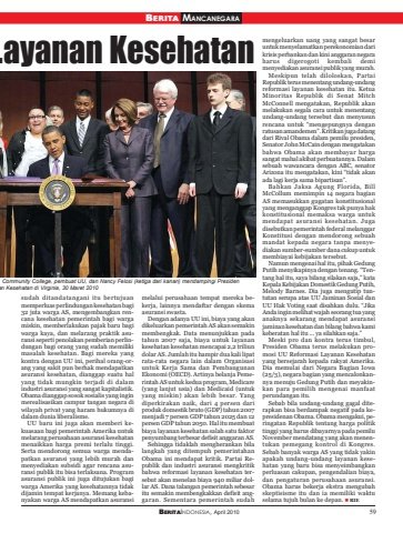 BERITAINDONESIA, April 2010 59BERITA MANCANEGARALayanan Kesehatansudah ditandatangani itu bertujuanmemperluas perlindungan kesehatan bagi32 juta warga AS, mengembangkan rencana kesehatan pemerintah bagi wargamiskin, memberlakukan pajak baru bagiwarga kaya, dan melarang praktik asuransi seperti penolakan pemberian perlindungan bagi orang yang sudah memilikimasalah kesehatan. Bagi mereka yangkontra dengan UU ini, perihal orang-orang yang sakit pun berhak mendapatkanasuransi kesehatan, dianggap suatu halyang tidak mungkin terjadi di dalamindustri asuransi yang sangat kapitalistik.Obama dianggap sosok sosialis yang inginmerealisasikan campur tangan negara diwilayah privat yang haram hukumnya didalam dunia liberalisme.UU baru ini juga akan memberi kekuasaan bagi pemerintah Amerika untukmelarang perusahaan asuransi kesehatanmenaikkan harga premi terlalu tinggi.Serta mendorong semua warga mendapatkan asuransi yang lebih murah danmenyediakan subsidi agar rencana asuransi publik itu bisa terlaksana. Programasuransi publik ini juga ditujukan bagiwarga Amerika yang kesehatannya tidakdijamin tempat kerjanya. Memang kebanyakan warga AS mendapatkan asuransimelalui perusahaan tempat mereka bekerja, lainnya mendaftar dengan skemaasuransi swasta.Dengan adanya UU ini, biaya yang akandikeluarkan pemerintah AS akan semakinmembengkak. Data menunjukkan padatahun 2007 saja, biaya untuk layanankesehatan kesehatan mencapai 2,2 triliundolar AS. Jumlah itu hampir dua kali lipatrata-rata negara lain dalam Organisasiuntuk Kerja Sama dan PembangunanEkonomi (OECD). Artinya belanja Pemerintah AS untuk kedua program, Medicare(yang lanjut usia) dan Medicaid (untukyang miskin) akan lebih besar. Yangdiperkirakan naik, dari 4 persen dariproduk domestik bruto (GDP) tahun 2007menjadi 7 persen GDP tahun 2025 dan 12persen GDP tahun 2050. Hal itu membuatbiaya layanan kesehatan salah satu faktorpenyumbang terbesar defisit anggaran AS.Sehingga tidaklah mengherankan bilalangkah yang ditempuh pemerintahanObama ini mendapat kritik. Partai Republik dan industri asuransi mengkritikbahwa reformasi layanan kesehatan tersebut akan menelan biaya 940 miliar dollar AS. Dana talangan pemerintah sebesaritu semakin membengkakkan defisit anggaran. Sementara pemerintah sudahmengeluarkan uang yang sangat besaruntuk menyelamatkan perekonomian darikrisis perbankan dan kini anggaran negaraharus digerogoti kembali demimenyediakan asuransi publik yang murah.Meskipun telah diloloskan, PartaiRepublik terus menentang undang-undangreformasi layanan kesehatan itu. KetuaMinoritas Republik di Senat MitchMcConnell mengatakan, Republik akanmelakukan segala cara untuk menentangundang-undang tersebut dan menyusunrencana untuk “mengepungnya denganratusan amandemen”. Kritikan juga datangdari Rival Obama dalam pemilu presiden,Senator John McCain dengan mengatakanbahwa Obama akan membayar hargasangat mahal akibat perbuatannya. Dalamsebuah wawancara dengan ABC, senatorArizona itu mengatakan, kini “tidak akanada lagi kerja sama bipartisan”.Bahkan Jaksa Agung Florida, BillMcCollum memimpin 14 negara bagianAS memasukkan gugatan konstitusionalyang menganggap Kongres tak punya hakkonstitusional memaksa warga untukmendapat asuransi kesehatan. Jugadisebutkan pemerintah federal melanggarKonstitusi dengan mendorong sebuahmandat kepada negara tanpa menyediakan sumber-sumber dana cukup untukmembiayai kebijakan tersebut.Namun mengenai hal itu, pihak GedungPutih menyikapinya dengan tenang. “Tentang hal itu, saya bilang silakan saja,” kataKepala Kebijakan Domestik Gedung Putih,Melody Barnes. Dia juga mengutip tuntutan serupa atas UU Jaminan Sosial danUU Hak Voting saat disahkan dulu. “JikaAnda ingin melihat wajah seorang tua yanganaknya sekarang mendapat asuransijaminan kesehatan dan bilang bahwa kamikeberatan hal itu ... ya silahkan saja.”Meski pro dan kontra terus timbul,Presiden Obama terus melakukan promosi UU Reformasi Layanan Kesehatanyang bersejarah kepada rakyat Amerika.Dia memulai dari Negara Bagian Iowa(25/3), negara bagian yang mencalonkannya menuju Gedung Putih dan meyakinkan para pemilih mengenai manfaatperundangan itu.Sebab bila undang-undang gagal diterapkan bisa berdampak negatif pada kepresidenan Obama. Obama mengakui, peringatan Republik tentang harga politiktinggi yang harus dibayarnya pada pemiluNovember mendatang yang akan menentukan pemegang kontrol di Kongres.Sebab banyak warga AS yang tidak yakinapakah undang-undang layanan kesehatan yang baru bisa menyeimbangkanperluasan cakupan, pengendalian biaya,dan pengaturan perusahaan asuransi.Obama harus bekerja ekstra mengubahskeptisisme itu dan ia memiliki waktuselama tujuh bulan ke depan. RIEa Community College, pembuat UU, dan Nancy Felosi (ketiga dari kanan) mendampingi Presidenan Kesehatan di Virginia, 30 Maret 2010