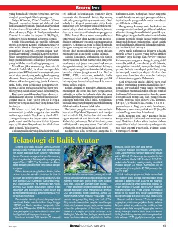 BERITAINDONESIA, April 2010 61BERITA IPTEKTeknologi di Balik AvatarSinema layar lebar besutan James Cameronberjudul Avatar menjadi buah bibir para penikmatfilm dalam beberapa bulan terakhir. KehandalanJames Cameron sebagai sutradara film memangtidak diragukan lagi. Beberapa film yang ia garapseperti Titanic (1997), The Terminator dan Aliens,sarat dengan special effect yang dibuat dengankomputer.Dalam karyanya yang terbaru, Avatar, keberadaan komputer semakin dominan. Ini bisa dibuktikan dari isi film Avatar yang sekitar 90% diisioleh animasi CGI (Computer-Generated Imagery). Meski dalam film The Terminator dan Aliens,animasi CGI sudah digunakan, namun tidaksecanggih yang diterapkan di Avatar. Belum lagipemanfaatan teknologi 3 dimensi membuat Avatar semakin istimewa.Pemanfaatan teknologi komputer yang intensifmembuat Avatar membutuhkan biaya hinggaUS$300 juta. Meski demikian, hanya satu bulansejak dirilis 17 Desember 2009, film ini sudah mencatat pendapatan kotor lebih dari US$1 miliar, lebihdari tiga kali lipat biaya pembuatannya.Membuat animasi CGI berefek 3D menjaditerlihat realistis memerlukan perangkat lunaktingkat lanjut (advanced) dengan banyak fitur danmampu menangani grafis-grafis rumit seperti3DS Max, Maya dan Blender (open source).Peran perangkat keras berspesifikasi tinggi jelassangat diperlukan untuk menghasilkan animasiCGI yang realistis. Itulah sebabnya, James Cameron memilih rumah produksi Weta Digital – yangpernah menggarap King Kong dan Lord of TheRings – untuk mewujudkan tampilan visual bangsaNa’vi, robot, pesawat tempur, serta pesona lanskaphutan dan pulau-pulau di Pandora. Di markasmereka di wilayah suburban Miramar, kotaWellington, Selandia Baru, terdapat peranti-perantikeras berukuran raksasa, meliputi studio, fasilitasproduksi, server farm, dan data center.Menurut majalah Information Management,Weta Digital memiliki ruangan data center seluassekira 929 m2. Di dalamnya terdapat lebih dari4.000 server blade HP Proliant BL2x220cberkekuatan34 racks, masing-masing memiliki 4chassis dengan 32 mesin. Komputasi inti inimengandung kurang lebih 40.000 prosesor dan104 TB RAM.Untuk media penyimpanan, Weta memanfaatkan network area storage berkecepatan tinggisebesar 3 petabytes dari BlueArc dan NetApp.Untuk penghubung antar perangkat, dipakai jaringan ethernet 10 Gigabit dari Foundry. Tidaklahmengherankan bila Weta Digital mendudukiposisi ke-197 dalam 500 besar superkomputerpaling bertenaga di dunia versi situs Top500.org.Rumah produksi berusia 17 tahun ini mengungkapkan, untuk mengerjakan Avatar, selama24 jam sehari superkomputer miliknya bisamengerjakan data sampai 8 gigabytes memorisetiap detiknya. Ketika versi final film Avatardirilis, jika dihitung mereka telah menyelesaikandata sebesar 17,28 gigabyte memori per menit.yang berada di tempat tersebut. Reviewsingkat pun dapat ditulis pengguna.Satya Witoelar, Chief Creative OfficerKoprol, mengakui inspirasi didapat darikebiasaan berpindah-pindah masyarakatkita terutama di kota-kota besar. Bersamadua rekannya, Fajar A. Budiprasetyo danDaniel Armanto, ia terjun di SkyEight,software house tempat lahirnya Koprol.Sejak diluncurkan ke publik Februari2009, pengguna Koprol telah mencapai 35ribu lebih. Mereka merupakan sasaran parapengiklan di Koprol. Dengan slogan “Targeted Advertising”, pemilik Koprol menjanjikan cara promosi yang lebih tepat sasaranbagi pemilik bisnis sekaligus penawaranyang lebih bermanfaat bagi pengguna.Misalkan, jika seseorang check-in diPondok Indah Mal, ia akan memperolehpesan atau SMS otomatis mengenai promosi atau event yang sedang berlangsungdi sana. Pesan yang dikirimkan pun bisadisesuaikan tergantung jenis kelamin,usia, hobi, atau kebiasaan pengguna tertentu. Hal ini terlaksana berkat user profiling yang sudah dikerjakan sebelumnya.Bagi para pemilik usaha, Koprol menyediakan akun khusus berlabel business account mulai dari yang gratis hinggaberbayar dengan fasilitas yang bervariasitentunya.Di tahun 2010 ini, Koprol berencanamenambah jumlah anggota dan merilisnative apps untuk Blackberry dan J2ME.“Pengembangan ke depan akan terfokuspada versi mobile karena itulah tujuannya, 40% akses Koprol saat ini dilakukandari ponsel,” jelas Satya.Tantangan klasik yang dihadapi tim kecilini adalah kekurangan sumber dayamanusia dan finansial. Selain tiga oranginti, ada 3 orang sifatnya membantu. Olehsebab itu, Koprol membuka pintu kerjasama bagi web developer lokal untuk samasama belajar dari sisi model bisnis, teknis,dan cara memahami keinginan pengguna.Bila LewatMana.com menyediakaninformasi jalan dan Koprol.com menyediakan informasi tentang si penggunanyasendiri, Urbanesia.com sedikit berbedadengan mengutamakan fungsi direktoribisnis dan memudahkan orang dalammencari toko atau jenis usaha lainnya.Meski demikian, Urbanesia tak hanyamenyediakan daftar nama toko dan jenisusahanya tapi juga menyandingkannyadengan teknologi berbasis lokasi. Artinya,kita dapat mengetahui toko terdekat yangberada dalam jangkauan kita. DaftarSPBU, ATM, restoran, sekolah, haltebusway, rumah sakit, dan tempat publiklainnya juga tersedia layaknya kita membuka Yellow Pages.Selina Limman, co-founder Urbanesia.com,mendapat ide situs ini dari pengalamanpribadinya ketika berbelanja. Ada toko yangmemiliki produk yang bagus tapi sulit diaksessehingga terkesan tidak laku. Sebaliknya,banyak orang yang bingung membeli barangdi lokasi sekitar karena tidak tahu.Berbekal pengalamannya memanfaatkan situs Yelp! dan Citysearch saat menjalani studi di AS, Selina berniat membangun situs direktori bisnis di Indonesia.Kebetulan, rekannya Natali Ardianto, memiliki pemikiran yang sama. Dan lahirlahUrbanesia.com pada bulan Mei 2009.Sedikitnya ada seribuan anggota diUrbanesia.com. Sebagian besar anggotamasih berstatus sebagai pengguna biasa,tapi ada pula yang sudah mulai membuatprofil bisnis miliknya.Mengusung konsep web berkekuatanuser-generated content, profil usaha dalamsitus ini diungguh sendiri oleh pemiliknya.Dilengkapi dengan fasilitas testimonial t