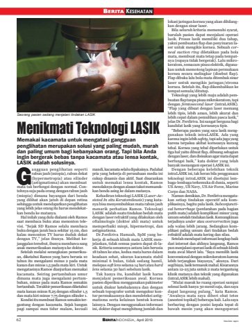 62 BERITAINDONESIA, April 2010 foto-foto: reproMenikmati Teknologi LASIKBERITA KESEHATANMemakai kacamata untuk mengatasi gangguanpenglihatan merupakan solusi yang paling mudah, murahdan paling umum bagi kebanyakan orang. Tapi bila Andaingin bergerak bebas tanpa kacamata atau lensa kontak,LASIK adalah solusinya.angguan penglihatan sepertirabun jauh (miopia), rabun dekat(hypermetropia) atau silinder(astigmatisma) akan membuatmata tak berfungsi dengan normal. Contohnya saja pada orang dengan rabun jauh(miopia) dimana bayangan dari bendayang dilihat akan jatuh di depan retinasehingga untuk mendapatkan penglihatanyang lebih jelas orang itu harus mendekatkan benda ke matanya.Hal inilah yang dulu dialami oleh Ramossaat membaca buku atau menonton televisi. “Sejak SD Ramos selalu membacabuku dengan jarak baca sekitar 15 cm, dankalau menonton TV harus duduk dekatdengan TV,” jelas ibunya. Melihat kejanggalan tersebut, ibunya membawa sanganak memeriksakan matanya ke dokter.Setelah melalui serangkaian pemeriksaan, diketahui Ramos yang baru berusia 10tahun itu mengalami minus 2 pada matakanan dan minus 1,5 pada mata kiri. Untukmengatasinya Ramos dianjurkan memakaikacamata. Seiring pertambahan umurdimana mata juga mengalami pertumbuhan, minus pada mata Ramos semakinbertambah. Terakhir pemeriksaan diketahuimata kanan minus 8,25 dengan silinder 1,5dan mata kiri minus 7,75 dengan silinder 1.Kondisi itu membuat Ramos semakin tergantung dengan kacamata. Sejak bangunpagi sampai mau tidur malam, kecualimandi, kacamata selalu dipakainya. Padahalpria yang bekerja di perusahaan media inicukup dinamis dan aktif. Saat disarankanuntuk memakai lensa kontak, Ramosmenolaknya dengan alasan takut memasukkan benda asing ke dalam matanya.Kehadiran teknologi LASIK (Laser-Assisted In situ Keratomileusis) yang katanya bisa menyembuhkan mata rabun jauhmenarik perhatian Ramos. TeknologiLASIK adalah suatu tindakan bedah matadengan laser refraktif yang dilakukan olehoftalmologis (dokter ahli mata) untukmemperbaiki miopi, hipermetropi, danastigmatisma.Dr.Ferdiriva Hamzah, SpM yang bekerja di sebuah klinik mata LASIK menjelaskan, tidak semua pasien dapat di-lasik. Kriteria umumnya antara lain berusia18 tahun ke atas, kedua mata harus dalamkeadaan sehat, ukuran kacamata stabilminimal 6 bulan, tidak sedang hamil,melepas soft lens selama 14 hari atau hardlens selama 30 hari sebelum lasik.Tak hanya itu, kandidat lasik harusmenjalani pemeriksaan awal. Korneapasien diperiksa menggunakan pakimeteruntuk diukur ketebalannya dan dengansebuah topografer untuk mengukur kontur permukaannya dan mendeteksi astigmatisma serta kelainan bentuk kornealainnya. Dengan menggunakan informasiini, dokter dapat menghitung jumlah danlokasi jaringan kornea yang akan dihilangkan dengan sinar laser.Bila seluruh kriteria memenuhi syarat,barulah pasien dapat menjalani operasilasik. Proses lasik memiliki dua tahap,yakni pembuatan flap dan penyinaran laser untuk mengikis kornea. Sebuah corneal suction ring diletakkan pada bolamata, membuat mata tetap pada tempatnya (supaya tidak bergerak). Lalu mikrokeratom, semacam pisau elektrik, digunakan untuk memotong lapisan permukaankornea secara melingkar (disebut flap).Flap dibuka lalu bola mata ditembak sinarlaser untuk mengikis jaringan/stromakornea. Setelah itu, flap dikembalikan ketempat semula/ditutup.Teknologi yang lebih maju adalah pembuatan flap tanpa pisau mikrokeratom, tapidengan femtosecond laser (intraLASIK).“Flap yang dibuat dengan laser memanglebih tipis, lebih aman, lebih akurat danlebih cepat dalam pemulihan pasca lasik,”jelas Dr. Ferdiriva. Ini sangat berguna bagikandidat lasik yang korneanya tipis.“Beberapa pasien yang saya lasik menggunakan teknik intraLASIK. Ada yangkarena ingin lebih safety, tapi ada juga yangkarena terpaksa akibat korneanya kurangtebal. Kornea yang tebal diperlukan untuktiga hal yaitu dibuat flap, dibuang sebagiandengan laser, dan disisakan agar mata dapatberfungsi baik,” kata dokter yang telahbanyak menangani operasi LASIK ini.Dengan beberapa kelebihan teknikintraLASIK ini, tak heran bila penggunaanteknologi intraLASIK ini disetujui lembaga-lembaga terkemuka di dunia, sepertiUS Army, US Navy, US Air Force, MarineCorps dan NASA.Namun demikian, Dr. Ferdiriva mengatakan setiap tindakan operatif ada komplikasinya, begitu pula lasik. Subconjunctival hemorrhage (perdarahan pada bagianputih mata) adalah komplikasi minor yangumum setelah tindakan lasik. Kemungkinanterjadinya under atau overcorrection jugaada walau lebih jarang. Sedangkan komplikasi paling umum dari tindakan bedahrefraktif adalah mata kering dan silau.Setelah mendapat informasi lengkap baikdari internet dan ahlinya langsung, Ramospun menjalani operasi lasik di sebuah klinikmata awal Maret lalu. “Saya memilih lasikkonvensional dengan mikrokeratom karenalebih terjangkau biayanya,” akunya. Darisegi biaya, lasik termasuk mahal. Kisarannyaantara 12-25 juta untuk 2 mata tergantungklinik matanya dan teknik yang digunakan(intraLASIK lebih mahal).“Mulai masuk ke ruang operasi sampaiselesai lasik hanya 30 menit saja, dan sayadapat langsung pulang,” kata Ramos.“Awalnya mata saya diberi obat tetes(anestesi topikal) beberapa kali. Lalu sayaberbaring dengan posisi kepala tepat dibawah mesin yang akan mengoperasiGSeorang pasien sedang menjalani tindakan LASIK