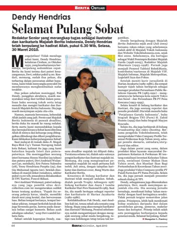 64 BERITAINDONESIA, April 2010BERITA OBITUARIDendy HendriasSelamat Pulang SobatRedaktur Senior yang merangkap tugas sebagai ilustratordan karikaturis Majalah Berita Indonesia, Dendy Hendriastelah berpulang ke hadirat Allah, pukul 6.30 Wib, Selasa,30 Maret 2010.engejutkan! Tidak mendugasobat kami, Dendy Hendrias,kelahiran Cirebon, 21 Oktober1950, yang kesehariannya bersahaja, berpulang sedemikian cepat.Berita itu kami terima dari puteri kesayangannya, Devi, sekitar pukul 9.00. Kendati, memang, sudah dua pekan, diaterbaring dalam perawatan akibat hepatoma, kami tidak menyangka penyakit itumembawanya menghembuskan nafasterakhir.Dua pekan sebelum meninggal, PakDendy, panggilan akrabnya, masih menyatakan tetap ikut terlibat dalam penulisan buku seorang tokoh serta tetapmenulis dan mengisi karikatur dan ilustrasi di Majalah Berita Indonesia. Dia jugamasih menyimpan sejuta cita-cita.Namun, manusia berencana, kehendakAllah jualah yang jadi. Persis saat MajalahBerita Indonesia di puncak deadline,berita duka itu masuk ke ruang redaksi.Serta merta kami menundukkan kepaladan bersujud kiranya Sobat kami diterimaAllah di sisinya dan keluarga yang ditinggalkan dilindungi dan diberi penghiburan.Kami ikhlaskan keberpulanganmu Sobat!Saat melayat di rumah duka Jl. MegahRaya Blok C4/1 Taman Narogong Indahkota Bekasi, kalimat itu juga yang kamihaturkan kepada Isteri dan puteraputerinya. Dia meninggalkan seorangisteri bernama Henny Nurdini (55 tahun)dan putera-puteri, Devi Andriani Wulansari (30, menikah), Eric Putera Nalendra(28), Yessy Hendriana Puspita (25), danGia Muhamad Agusta (20). Setelah disolatkan di masjid dekat rumahnya, sekitarpukul 13.00 wib, jenazahnya dimakamkandi TPU Kartini, Poncol-Bekasi.Devi Andriani Wulansari, puteri sulungnya yang juga pemilik situs devicollection.com ini mengutarakan sedikitkesan tentang ayahnya. “Papah itu seorang pekerja keras, idealis, memilikidarah seni yang kental, dan berwawasanluas. Beliau tempat bertanya, tempat bertukar pikiran, tempat berkeluh kesah danjuga bersenda gurau, karena pada dasarnya beliau sangat humoris. Beliau ayahsekaligus sahabat,” ucap Devi sambil terbata-bata.Sehari setelah kepergian Dendy, suasana deadline majalah ini diliputi duka.Terutama selama ini, dialah satu-satunyapengisi karikatur dan ilustrasi majalah ini.Memang, dia yang menginspirasi penampilan majalah ini sejak pertama kaliterbit, Juli 2005, dengan tampilan karikatur dan ilustrasi cover, Bung Warto danKarikatur Berita.Kreasinya di bidang karikatur danilustrasi telah menjadi andalan. Sebab,dialah peraih Trophy Adinegoro 1987bidang karikatur dan Juara I LombaKarikatur Hari Pers Nasional th 1985. Saatitu, dia masih bertugas sebagai reporterdan karikaturis di Harian Jayakarta(1982-1986).Ketidakhadiran Pak Dendy, saat deadline kali ini, terasa sekali ada sesuatu yanghilang. Siapa yang akan mengisi karikaturdan ilustrasi? Memang, Pemred sebelumnya sudah mengantisipasi dengan mengajak seorang sobat muda bergabung, tetapi rasa kehilangan tetap terasa tak tergantikan.Dendy bergabung dengan MajalahBerita Indonesia sejak awal (Juli 2005)bersama rekan-rekan yang sebelumnyasudah aktif di Majalah Tokoh Indonesiadan Website TokohIndonesia.com, sejakMei 2002. Sebelumnya, dia bertugassebagai Wakil Pemimpin Redaksi MajalahGarda (1998-2005), Redaktur MajalahDharmais (1995-1998). Pernah jugamenjadi Pemred Tabloid BebekMania,kontributor/wartawan di Majalah VIP,Majalah Infomas, Majalah Metropolitan,Legislatif Jaya dan Fokus.Setelah meniti karir jurnalistik diHarian Jayakarta (1982-1986), dia sempathampir tujuh tahun berkiprah sebagaimanager produksi Perusahaan Public Relations Ganesia PR (1985-1991) - mengantarnya ke beberapa kota seperti Tokyodan Seoul - dan Perusahaan PR PT PenaKencana (1993-1995).Selain kreatif di bidang karikatur danilustrasi, dia juga seorang reporter danpenulis produktif. Dia telah menulis buku“Perjalanan Garuda Indonesia”, bukubiografi Brigjen TNI (Purn) H. ZahidHusein (1995) dan buku biografi MayjenRyacudu.Selain itu, dia juga berkiprah di bidangbroadcasting dan video shooting. Bersama pengelola TokohIndonesia, telahmemproduksi Video Company Profile Terminal Petikemas Koja Tahun 2005, sebagai penulis skenario, sutradara/storyboard dan editor.Juga dalam posisi yang sama, dalamproduksi iklan layanan masyarakat Departemen Kelautan & Perikanan RI tentang sosialisasi Investasi Kelautan Tahun2005, sosialisasi Gemar Makan IkanTahun 2006, dan Manfaat Ikan BagiPertumbuhan & Kecerdasan Tahun 2007.Juga produksi Video Company profile PTPundi Farm dan PT Pama Persada. Selainitu, dia juga pernah menjadi presentersebuah dialog di TPI.Dendy, sebagaimana juga dikemukakanputerinya, Devi, masih menyimpan sejumlah cita-cita. Dia seorang jurnalisbersahaja, menikmati hidup ’tahan menderita’ dengan hasil keringatnya sendiri.Tidak pernah tergiur menerobos jalanpintas. Prinsipnya, lebih baik menikmatihidup seadanya daripada ikut dalamgerombolan garong, pemeras, makelarkasus dan koruptor. Prinsip inilah salahsatu peninggalan berharganya kepadagenerasi muda. Selamat berpulang, Sobat! Mangatur L. PaniroyMfoto: dok.berindo