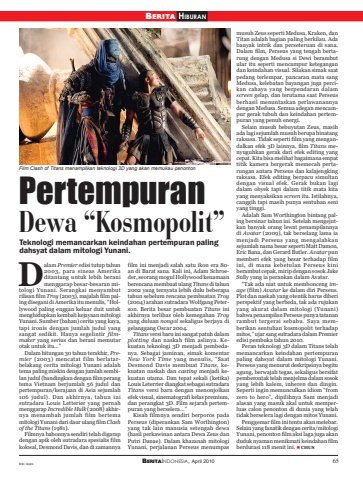 BERITAINDONESIA, April 2010 65BERITA HIBURANPertempuranDewa “Kosmopolit”Teknologi memancarkan keindahan pertempuran palingdahsyat dalam mitologi Yunani.alam Premier edisi tutup tahun2003, para sineas Amerikaditantang untuk lebih beranimenggarap besar-besaran mitologi Yunani. Serangkai menyambutrilisan film Troy (2003), majalah film paling disegani di Amerika itu menulis, “Hollywood paling enggan keluar duit untukmenghidupkan kembali kejayaan mitologiYunani. Sumber (bahan) cerita yang kaya,tapi ironis dengan jumlah judul yangsangat sedikit. Hanya segelintir filmmaker yang serius dan berani memutarotak untuk itu…”Dalam hitungan 30 tahun terakhir, Premier (2003) mencatat film berlatarbelakang cerita mitologi Yunani adalahtema paling miskin dengan jumlah sembilan judul (bandingkan dengan film perangtema Vietnam berjumlah 56 judul danpertempuran/kerajaan di Asia sejumlah106 judul). Dan akhirnya, tahun inisutradara Louis Letterier yang pernahmenggarap Incredible Hulk (2008) akhirnya menambah jumlah film bertemamitologi Yunani dari daur ulang film Clashof the Titans (1981).Filmnya babonnya sendiri telah digarapdengan apik oleh sutradara spesialis filmkolosal, Desmond Davis, dan di zamannyafilm ini menjadi salah satu ikon era 80-an di Barat sana. Kali ini, Adam Schroeder, seorang mogul Hollywood kenamaanberencana membuat ulang Titans di tahun2002 yang ternyata lebih dulu beberapatahun sebelum rencana pembuatan Troy(2004) arahan sutradara Wolfgang Peterson. Berita besar pembuatan Titans iniakhirnya terlibas oleh kemegahan Troyyang duluan nongol sekaligus berjaya digelanggang Oscar 2004.Titans versi baru ini sangat patuh dalamplotting dan naskah film aslinya. Kekuatan teknologi 3D menjadi pembedanya. Sebagai jaminan, simak komentarNew York Time yang menulis, “SaatDesmond Davis membuat Titans, kekuatan naskah dan casting menjadi kekuatan utama. Dan tepat sekali (ketika)Louis Leterrier diangkat sebagai sutradaraTitans versi baru dengan menonjolkanefek visual, sinematografi kelas premium,dan perangkat 3D. Film sejarah pertempuran yang berselera…”Kisah filmnya sendiri berporos padaPerseus (diperankan Sam Worthington)yang tak lain manusia setengah dewa(hasil perkawinan antara Dewa Zeus danPutri Danae). Dalam khazanah mitologiYunani, perjalanan Perseus menumpasmusuh Zeus seperti Medusa, Kraken, danTitan adalah bagian paling berkilau. Adabanyak intrik dan perseteruan di sana.Dalam film, Perseus yang tengah bertarung dengan Medusa si Dewi berambutular itu seperti mencampur ketegangandan keindahan visual. Silakan simak saatpedang terlempar, pancaran mata sangMedusa, kelebatan bayangan juga percikan cahaya yang berpendaran dalamscreen gelap, dan terutama saat Perseusberhasil menuntaskan perlawanannyadengan Medusa. Semua adegan mencampur gerak tubuh dan keindahan pertempuran yang penuh energi.Selain musuh bebuyutan Zeus, masihada lagi sejumlah musuh berupa binatangraksasa. Tidak seperti film yang mengandalkan efek 3D lainnya, film Titans menyuguhkan gerak dari efek editing yangcepat. Kita bisa melihat bagaimana empattitik kamera bergerak memecah pertarungan antara Perseus dan kalajengkingraksasa. Efek editing berpacu simultandengan visual efek. Gerak bukan lagidalam obyek tapi dalam titik mata kitayang menyaksikan screen itu. Istilahnya,canggih tapi masih punya sentuhan seniyang tinggi.Adalah Sam Worthington bintang paling bersinar tahun ini. Setelah mengejutkan banyak orang lewat penampilannyadi Avatar (2009), tak berselang lama iamenjadi Perseus yang mengalahkansejumlah nama besar seperti Matt Damon,Eric Bana, dan Gerard Butler. Avatar punmemberi efek yang besar terhadap filmini, di mana kebetulan Perseus kiniberambut cepak, mirip dengan sosok JakeSully yang ia perankan dalam Avatar.“Tak ada niat untuk membonceng image (film) Avatar ke dalam diri Perseus.Plot dan naskah yang otentik harus diberiperspektif yang berbeda, tak ada rujukanyang akurat dalam mitologi (Yunani)bahwa penampilan Perseus punya tatananrambut tergerai sebahu. Saya memberikan sentuhan kosmopolit terhadapmitos,” ujar sang sutradara dalam Premieredisi pembuka tahun 2010.Peran teknologi 3D dalam Titans telahmemancarkan keindahan pertempuranpaling dahsyat dalam mitologi Yunani.Perseus yang menurut deskripsinya begituagung, berwajah tegas, sekaligus bersifatpemberontak telah menjelma dalam sosokyang lebih kalem, inheren dan dingin.Seperti ingin memunculkan idiom “fromzero to hero”, dipilihnya Sam menjadialasan yang masuk akal untuk memperluas calon penonton di dunia yang telahtidak berselera lagi dengan mitos Yunani.Penggemar film ini tentu akan melebar.Selain yang fanatik dengan cerita/mitologiYunani, penonton film aksi laga juga akanduduk nyaman menikmati keindahan filmberdurasi 118 menit ini. CHUSDfoto: reproFilm Clash of Titans menampilkan teknologi 3D yang akan memukau penonton