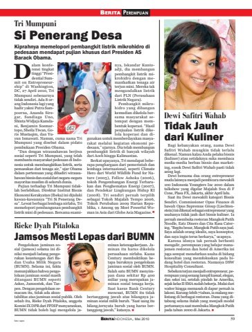 BERITAINDONESIA, Mei 2010 59BERITA PEREMPUANTri MumpuniSi Penerang DesaDewi Safitri WahabTidak Jauhdari KulinerBagi kebanyakan orang, nama DewiSafitri Wahab mungkin tidak terlaludikenal. Namun kalau Anda pelaku bisnis(kuliner) atau setidaknya suka membacamedia-media berbau bisnis dan marketing, sosok Dewi Safitri Wahab pasti tidakasing lagi.Dewi bersama dua orang entrepreneurmuda lainnya menjadi pembicara mewakili100 Indonesia Youngters Inc 2010 dalamtalkshow yang digelar Majalah Swa di FCone, Plasa FX, Jakarta, akhir April lalu.Saat itu Dewi mewakili kategori BisnisSendiri. Commissioner Opus Finance dibawah Opus Supremus Group (Liechtenstein) ini dikenal sebagai entrepreneur yangusahanya tidak jauh dari bisnis kuliner. Iapernah membuka restoran Mangkok PutihNoodle, Eatz Diners dan Cita Rasa Catering. “Begitu besar, Mangkok Putih saya jual.Saya adalah orang idealis, saya konseptor,dan saya ingin terus berkarya,” ucapnya.Karena idenya tak pernah berhentimengalir, perempuan yang belajar manajemen restoran dan hotel di Amerika inijuga sempat menelurkan usaha di bidangkonsultan yang memfokuskan pada bidang hotel dan restoran. Namanya DSWHospitality Consultant.Sebelum terjun menjadi entrepreneur, perempuan yang senang tampil kasual, elegan,dan seksi ini, setelah pindah ke Amerika,sejak kelas II SMA sudah bekerja. Mulai dariwaiter hingga memasak di dapur pernah ialakoni. Kurang-lebih 7 tahun, ia malang melintang di berbagai restoran. Dana yang ditabung selama itulah yang menjadi modalpertamanya saat membuka Mangkok Putihpada tahun 2000 di Jakarta. Rieke Dyah PitalokaJamsos Mesti Lepas dari BUMNPengelolaan jaminan sosial (jamsos) selama ini dinilai menjadi ladang pengerukan keuntungan dari Badan Usaha Milik Negara(BUMN). Selama ini, faktamenunjukkan bahwa pengelolaan jaminan sosial masihditangani BUMN sepertiAskes, Jamsostek, dan Taspen. Dengan pengelolaan semacam itu, tidak ada akuntabilitas atas jaminan sosial publik. Olehsebab itu, Rieke Dyah Pitaloka, anggotaKomisi IX DPR dari FPDIP menyarankan,BUMN tidak boleh lagi mengelola jaminan ketenagakerjaan. Jaminan itu harus dikelolaperusahaan nirlaba. KasusCentury membuktikan betapa buruknya pengelolaanjaminan sosial oleh BUMN.Salah satu BUMN menyimpan dana sekitar Rp 400miliar yang merupakan jaminan sosial tenaga kerja.Saat kasus Bank Centurymencuat, BUMN itu tidakbertanggung jawab atas hilangnya jaminan sosial milik buruh. “Saat uang ituhilang,ternyata buruh yang harus bertanggung jawab,” katanya. Kiprahnya memelopori pembangkit listrik mikrohidro dipedesaan mendapat pujian khusus dari Presiden ASBarack Obama.alam konferensi tingkattinggi “Presidential Summit on Entrepreneurship” di Washington,DC, 27 April 2010, TriMumpuni sebenarnyatidak sendiri. Ada 8 orang Indonesia lagi yanghadir yakni Putra Sampoerna, Ananda Siregar, Sandiaga Uno,Shinta Widjaja Kamdani, Benjamin Soemartopo, Sheila Tiwan, Goris Mustaqim, dan Yuyun Ismawati. Namun, cuma nama TriMumpuni yang disebut dalam pidatopembukaan Presiden Obama.“Dan dengan wirausahawan berjiwasosial seperti Tri Mumpuni, yang telahmembantu masyarakat pedesaan di Indonesia untuk membangkitkan listrik, sertapemasukan dari tenaga air,” ujar Obamadalam pertemuan yang dihadiri wirausahawan bisnis dan sosial dari negara-negaramayoritas muslim di seluruh dunia.Pujian terhadap Tri Mumpuni tidaklah berlebihan. Direktur Institut BisnisEkonomi Kerakyatan (Ibeka) ini dijulukikawan-kawannya “Tri Si Penerang Desa”. Lewat berbagai lembaga nirlaba, Trimemelopori pembangunan pembangkitlistrik mini di pedesaan. Bersama suaminya, Iskandar Kuntoadji, dia membangunpembangkit listrik mikrohidro dengan memanfaatkan tenaga airterjun mini. Mereka takmengandalkan listrikdari PLN (PerusahaanListrik Negara).Pembangkit mikrohidro yang dibangunkemudian dikelola bersama masyarakat setempat dengan membentuk koperasi. “Hasilpenjualan listrik dikelola koperasi dan digunakan untuk memberdayakan masyarakat melalui kegiatan ekonomi pedesaan,” ujarnya. Dia telah membangunpembangkit listrik di banyak wilayahdari Aceh hingga Kalimantan.Berkat upayanya, Tri mendapat beberapa penghargaan dari pemerintah danlembaga internasional, seperti ClimateHero dari World Wildlife Fund for Nature (2005), Fellow Ashoka (2006),tokoh Pengembangan Energi Terbarukan dan Penghematan Energi (2007),dan Pendekar Lingkungan Hidup RI(2008). Tri sendiri pernah terpilihsebagai Tokoh Majalah Tempo 2006,Tokoh Perubahan 2009 Harian Republika, 1 Among 99 Most Powerful Woman in Asia dari Globe Asia Magazine. Dfoto: repro