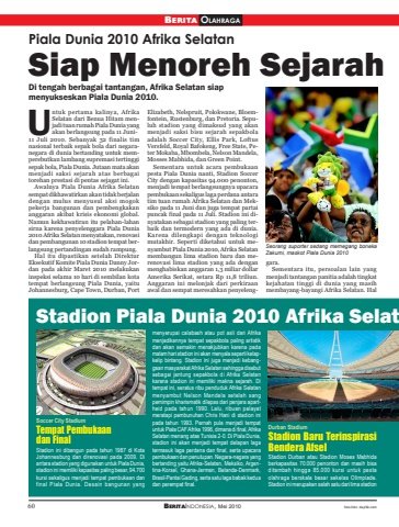 60 BERITAINDONESIA, Mei 2010BERITA OLAHRAGAfoto-foto: daylife.comPiala Dunia 2010 Afrika SelatanSiap Menoreh SejarahStadion Piala Dunia 2010 Afrika SelatSoccer City StadiumTempat Pembukaandan FinalStadion ini dibangun pada tahun 1987 di KotaJohannesburg dan direnovasi pada 2009. Diantara stadion yang digunakan untuk Piala Dunia,stadion ini memiliki kapasitas paling besar, 94.700kursi sekaligus menjadi tempat pembukaan danfinal Piala Dunia. Desain bangunan yangmenyerupai calabash atau pot asli dari Afrikamenjadikannya tempat sepakbola paling artistikdan akan semakin menakjubkan karena padamalam hari stadion ini akan menyala seperti kelapkelip bintang. Stadion ini juga menjadi kebanggaan masyarakat Afrika Selatan sehingga disebutsebagai jantung sepakbola di Afrika Selatankarena stadion ini memiliki makna sejarah. Ditempat ini, seratus ribu penduduk Afrika Selatanmenyambut Nelson Mandela setelah sangpemimpin kharismatik dilepas dari penjara apartheid pada tahun 1990. Lalu, ribuan pelayatmeratapi pembunuhan Chris Hani di stadion inipada tahun 1993. Pernah pula menjadi tempatuntuk Piala CAF Afrika 1996, dimana di final, AfrikaSelatan menang atas Tunisia 2-0. Di Piala Dunia,stadion ini akan menjadi tempat delapan lagatermasuk laga perdana dan final, serta upacarapembukaan dan penutupan. Negara-negara yangbertanding yaitu Afrika-Selatan, Meksiko, Argentina-Korsel, Ghana-Jerman, Belanda-Denmark,Brasil-Pantai Gading, serta satu laga babak keduadan perempat final.Durban StadiumStadion Baru TerinspirasiBendera AfselStadion Durban atau Stadion Moses Mabhidaberkapasitas 70.000 penonton dan masih bisaditambah hingga 85.000 kursi untuk pestaolahraga berskala besar sekelas Olimpiade.Stadion ini merupakan salah satu dari lima stadionDi tengah berbagai tantangan, Afrika Selatan siapmenyukseskan Piala Dunia 2010.ntuk pertama kalinya, AfrikaSelatan dari Benua Hitam menjadi tuan rumah Piala Dunia yangakan berlangsung pada 11 Juni11 Juli 2010. Sebanyak 32 finalis timnasional terbaik sepak bola dari negaranegara di dunia bertanding untuk memperebutkan lambang supremasi tertinggisepak bola, Piala Dunia. Jutaan mata akanmenjadi saksi sejarah atas berbagaitorehan prestasi di pentas sejagat ini.Awalnya Piala Dunia Afrika Selatansempat dikhawatirkan akan tidak berjalandengan mulus menyusul aksi mogokpekerja bangunan dan pembengkakananggaran akibat krisis ekonomi global.Namun kekhawatiran itu pelahan-lahansirna karena penyelenggara Piala Dunia2010 Afrika Selatan menyatakan, renovasidan pembangunan 10 stadion tempat berlangsung pertandingan sudah rampung.Hal itu dipastikan setelah DirekturEksekutif Komite Piala Dunia Danny Jordan pada akhir Maret 2010 melakukaninspeksi selama 10 hari di sembilan kotatempat berlangsung Piala Dunia, yaituJohannesburg, Cape Town, Durban, PortElizabeth, Nelspruit, Polokwane, Bloemfontein, Rustenburg, dan Pretoria. Sepuluh stadion yang dimaksud yang akanmenjadi saksi bisu sejarah sepakbolaadalah Soccer City, Ellis Park, LoftusVersfeld, Royal Bafokeng, Free State, Peter Mokaba, Mbombela, Nelson Mandela,Mosses Mabhida, dan Green Point.Sementara untuk acara pembukaanpesta Piala Dunia nanti, Stadion SoccerCity dengan kapasitas 94.000 penonton,menjadi tempat berlangsungnya upacarapembukaan sekaligus laga perdana antaratim tuan rumah Afrika Selatan dan Meksiko pada 11 Juni dan juga tempat partaipuncak final pada 11 Juli. Stadion ini dinyatakan sebagai stadion yang paling terbaik dan termodern yang ada di dunia.Karena dilengkapi dengan teknologimutakhir. Seperti diketahui untuk menyambut Piala Dunia 2010, Afrika Selatanmembangun lima stadion baru dan merenovasi lima stadion yang ada denganmenghabiskan anggaran 1,3 miliar dollarAmerika Serikat, setara Rp 11,8 triliun.Anggaran ini melonjak dari perkiraanawal dan sempat meresahkan penyelenggara.Sementara itu, persoalan lain yangmenjadi tantangan panitia adalah tingkatkejahatan tinggi di dunia yang masihmembayang-bayangi Afrika Selatan. HalUSeorang suporter sedang memegang bonekaZakumi, maskot Piala Dunia 2010