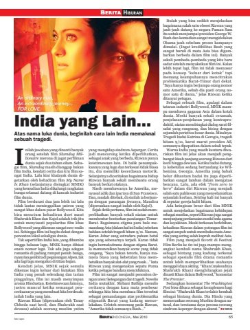 BERITAINDONESIA, Mei 2010 65BERITA HIBURANfoto: reproIndia yang Lain…Atas nama luka dunia, beginilah cara lain India memaknaisebuah tragedi.nilah jawaban yang dinanti banyakorang setelah film Slumdog Millionaire merona di jagat perfilmandunia sejak dua tahun silam. Sebagai film, Slumdog masih dianggap bukanfilm India, kendati cerita dan kru film sangat India. Lalu kini khalayak dunia digetarkan oleh kehadiran film My NameIs Khan (selanjutnya disingkat MNIK)yang kemudian India dikalungi rangkaianbunga selamat datang di kancah industrifilm dunia.Film berdurasi dua jam lebih ini lalutidak lantas meninggalkan patron yangsangat khas dalam pasar Bollywood. Kitabisa mencium kehadiran duet mautShahrukh Khan dan Kajol adalah trik jituuntuk menyiasati popularitas film khasBollywood yang dikemas sangat neo-realisini. Sehingga film ini begitu dekat denganpenonton lokal sekaligus dunia.Tak seperti film India lain, yang dibumbuhingga belasan lagu, MNIK hanya dihiasienam nomor lagu. Tak ada juga adeganromantis di padang rumput penuh bunga,nyanyian gembira di pegunungan Alpen, takada lagi lagu mengalun di titian hujan.Kendati jelas, MNIK sejak semuladikemas ingin keluar dari kutukan filmIndia yang penuh selendang dan tarianpinggulnya, film ini masih menyimpanaroma Hindustan. Keistimewaan lainnya,justru muncul ketika semangat penceritaannya yang membuat kita berdecak:inilah India yang lain.Rizwan Khan (diperankan oleh TanayChheda saat kecil, dan Shahrukh saatdewasa) adalah seorang muslim yatimyang mengidap sindrom Asperger. Ceritajadi mencorong ketika diperlihatkan,sebagai anak yang berbeda, Rizwan punyakeistimewaan lain. Di balik penampakkannya yang lugu dan terkesan tidak biasaitu, dia memiliki kecerdasan motorik.Selanjutnya diceritakan bagaimana hidupRizwan banyak sekali membantu orangbanyak berkat otaknya.Nasib membawanya ke Amerika, menyusul adik dan iparnya di San Fransisco.Dan, mudah ditebak, di sinilah ia berjumpa dengan pasangan jiwanya, Mandira(diperankan sangat indah oleh Kajol).Sejak detik pertama, film ini sudah memperlihatkan banyak sekali niatan untukmembentur-benturkan pandangan TimurBarat. Bagaimana stigma para bule memandang Asia (dalam hal ini India) sebelumbahkan setelah tragedi hitam 9/11. Namun,Karan Johar sang sutradara paham betulapa yang sebenarnya terjadi. Karan tidakingin bermelodrama dengan stigma Barat.Ia memunculkan banyak scene yang tidakcengeng, “Saya bukan teroris, hanya manusia biasa yang kebetulan bisa membetulkan banyak alat-alat yang rusak…” kataRizwan yang mengenakan sepatu Pumaketika petugas bandara menciduknya.Film ini sangat menjauhi penonton dengan unsur ketegangan dan tragedi. NovelisIndia mutakhir, Shibani Bathija menulisceritanya dengan kaca mata pembesarsehingga kita bisa membaca film tersebutsebagai pemandangan atas problematikastigmatik Barat yang kadang mencelakakan. Celoteh seseorang pada Rizwan,“Amerika tidak semuanya Bush…”Itulah yang bisa sedikit menjelaskanbagaimana salah satu obsesi Rizwan yangjauh-jauh datang ke negara Paman Samitu untuk menjumpai presiden George W.Bush dan kemudian sangat mengidolakanObama jauh sebelum proses kampanyedimulai. (Ingat kredibilitas Bush yangsangat buruk di mata Asia bisa digambarkan berbeda dalam film ini). Banyaksekali pembeda-pembeda yang kita barusadar setelah menyaksikan film ini. Kalaulebih tepat lagi, film ini tidak menyasarpada konsep “keluar dari kotak” tapimemang keampuhannya mencitrakanproblematika Barat-Timur dari dekat.“Saya hanya ingin berjumpa orang nomorsatu Amerika, sebab dia pasti orang nomor satu di dunia,” jelas Rizwan ketikaditanyai petugas.Sebagai sebuah film, apalagi dalamtataran industri Bollywood, MNIK mampu membawa gagasan Asia dalam kotakdunia. Meski banyak sekali ceramah,penjelasan-penjelasan yang kontraproduktif, niatan membingkai dialog sarat filsafat yang sungsang, dan bising dengansejumlah peristiwa besar dunia. Misalnya:Tragedi badai Katrina di Gerogia, tragedihitam 9/11, karut marut presiden AS,semuanya dipepatkan dalam sekali tepuk.Warna India yang masih kentara diwariskan film ini jelas akan menjadi penghangat kisah panjang seorang Rizwan darikecil hingga dewasa. Ketika badai datang,ia kebetulan sedang bertandang ke Wilhemina, Georgia. Amerika yang babakbelur dihantam badai itu juga diperlihatkan sangat lamban dalam mengatasibencana. Lalu, ada efek “from zero tohero” dalam diri Rizwan yang menjadisalah satu pahlawan yang menyelamatkansejumlah korban. Setting kali ini banyakdi seputar gereja kulit hitam.Ada keinginan besar dari film MNIKuntuk menjelaskan bagaimana kehidupansebagai muslim, seperti Rizwan juga sangatmenjunjung perdamaian meski beda agamadan keyakinan. Meski terkesan berlebihan,kehadiran Rizwan dalam potongan film inisangat ampuh untuk membuka mata Amerika yang sering salah kaprah melihat Asia.Film yang menjadi favorit di FestivalFilm Berlin ke 60 ini juga mampu mengangkat kembali nama Shahrukh Khan,sebagai bintang yang kadung terkenalsebagai spesialis film drama romantisuntuk lebih memperlihatkan usahanyamenggali daya akting. “Khan (maksudnyaShahrukh Khan) menghilangkan jejakdinasti Khan dalam Bollywood,” komentarThe Premier.Sedangkan komentar The WashingtonPost bisa dibaca sebagai komplemen bagifilm ini: “Shahrukh Khan terlahir kembalisebagai bintang dunia. Dia Hindu yangmemerankan seorang Muslim dengan natural, dan terutama daya pesona seorangsindrom Asperger dengan akurat.” CHUSI