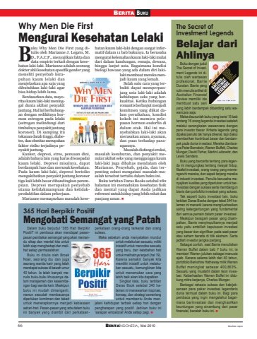 66 BERITAINDONESIA, Mei 2010BERITA BUKUfoto-foto: reproThe Secret ofInvestment LegendsBelajar dariAhlinyaBuku dengan judulThe Secret of Investment Legends ini ditulis oleh wartawanprofesional, BarrieDunstan. Barrie yangrutin menulis artikel diAustralian FinancialReview memiliki idemembuat satu seriyang lebih berdampak dibanding satu wawancara saja.Maka disusunlah buku yang berisi 15 babtentang 16 orang legenda investasi setelahmelalui serangkaian wawancara denganpara investor besar. Kriteria legenda yangdipakai penulis tak hanya dikenal, tapi diakuimemberikan kontribusi besar dan berdampak pada dunia investasi. Mereka diantaranya Peter Bernstein, Warren Buffett, CharlesMunger, David Fisher, Martin Leibowitz, danLewis Sanders.Buku yang bercerita tentang para legenda ini mengungkap tentang riwayat hidup,filsafat investasi, orang-orang yang memengaruhi mereka, dan sepak terjang merekadi industri investasi. Penulis berusaha menyajikan kualitas yang diperlukan untuk berinvestasi dengan sukses serta membangunbisnis dan portofolio investasi yang sukses.Tak seperti buku investasi lain, bukuterbitan Daras Books dengan tebal 344 halaman ini menarik karena mengilustrasikansaling ketergantungan yang fundamentaldari semua pemain dalam pasar investasi.Meskipun beragam pesan yang disampaikan, Barrie menyimpulkannya menjadisatu yaitu ambillah keputusan investasiyang besar dan signifikan pada saat pasaratau saham berada di titik ekstrem. Sertajadilah investor jangka panjang.Sebagai contoh, saat Barrie menuliskanWarren Buffet dalam bab 7 buku ini, iamemberi Warren julukan sebagai manusiaajaib. Karena selama lebih dari 40 tahun,portofolio Berkshire Hathaway milik WarrenBuffet meningkat sebesar 400,863%.Sesuatu yang mustahil dalam teori investasi. Keberhasilan Warren Buffet ini didukung mitra kerjanya, Charles Munger.Berbagai rahasia sukses dan kebijaksanaan para pakar investasi legendarisdunia termuat dalam buku ini. Bagi parapembaca yang ingin mengetahui bagaimana berinvestasi dan menghasilkankeuntungan yang sinambung dari pasarfinansial, bacalah buku ini. 365 Hari Berpikir PositifMengobati Semangat yang PatahWhy Men Die FirstMengurai Kesehatan Lelakiuku Why Men Die First yang ditulis oleh Marianne J. Legato, M.D., F.A.C.P., menyajikan fakta dandata empiris terkait dengan kesehatan laki-laki. Marianne adalah seorangdokter ahli kesehatan spesifik gender yangmeneliti penyebab kerapuhan kaum lelaki danmenjelaskan apa saja yangdibutuhkan laki-laki agarbisa hidup lebih lama.Berdasarkan data, mayoritas kaum laki-laki meninggal dunia akibat penyakitjantung. Hal ini berhubungan dengan sedikitnya hormon estrogen pada lelaki(estrogen melindungi daritimbulnya penyakit jantungkoroner). Di samping itutekanan darah tinggi, diabetes, dan obesitas merupakanfaktor risiko terjadinya penyakit jantung.Kanker, depresi, stres, penuaan dini,adalah bahaya lain yang harus diwaspadaikaum lelaki. Depresi misalnya, dapatberdampak luas dan merusak kesehatan.Pada kaum laki-laki, depresi berisikomengakibatkan penyakit jantung koronertiga kali lebih besar dibandingkan perempuan. Depresi merupakan penyebabutama ketidakmampuan dan ketidakproduktifan dalam pekerjaan.Marianne memaparkan masalah kesehatan kaum laki-laki dengan sangat informatif dalam 11 bab bukunya. Ia berusahamengurai kelemahan kaum laki-laki mulaidari dalam kandungan, remaja, dewasa,hingga lanjut usia. Bagaimana kondisibiologi bawaan yang ada dalam diri lakilaki membuat mereka menjadi kaum yang lemah.Salah satu cara yang terbukti dapat memperpanjang usia laki-laki adalahkehidupan seks yang berkualitas. Ketika hubunganromantis berlanjut menjadikomitmen yang diikat dalam pernikahan, kondisikokoh ini memicu pelepasan hormon endorfin didalam otak. Hal ini menyebabkan laki-laki akanmerasakan aman, nyaman,dan puas terhadap pasangannya.Masalah disfungsi ereksi,masalah kesuburan, dan penyakit menular akibat seks yang mengganggu kaumlaki-laki juga dibahas mendalam olehMarianne. Penyebab, gejala, dan terpenting solusi mengatasi masalah-masalah tersebut tertulis dalam buku ini.Buku terbitan Daras Books setebal 282halaman ini memadukan kesehatan fisikdan mental yang dapat Anda jadikanreferensi untuk hidup yang lebih sehat danpanjang umur. Dalam buku berjudul “365 Hari BerpikirPositif” ini pembaca akan mendapat pesanpesan pembakar semangat yang akan memandu sikap dan mental kita untuklebih siap menghadapi dan melihat setiap permasalahan.Buku ini ditulis oleh BroekNoel, seorang ibu dan jugaseorang wanita karir yang telahmendapat sukses di bawah umur40 tahun. Ia telah banyak menulis buku-buku khususnya dalam manajemen dan keseimbangan bagi wanita karir. Meskipunbuku ini mudah dimengerti,namun sesudah membacanyadiperlukan komitmen dan tekaduntuk menerapkannya menjadi kebiasaansehari-hari. Pesan-pesan yang ada dalam bukuini banyak yang diambil dari perkataanperkataan orang-orang terkenal dan orangsukses.Maka sebelum anda menyatakan munduruntuk melakukan sesuatu, milikiinisiatif untuk mencoba sesuatuyang baru, dan ketabahan hatiuntuk melihatnya terjadi (hal 19).Karena semakin banyak kitamemiliki inisiatif untuk melakukan sesuatu, kemungkinan kitauntuk menemukan cara yanglebih baik akan kita dapatkan.Singkat kata, buku terbitanDaras Book setebal 340 halaman ini menawarkan inspirasi,konsep, dan strategi cemerlanguntuk membantu Anda menjalani kehidupan terbaik setiap hari denganpengharapan yang positif. Jadikan buku ini‘sarapan emosional’ Anda setiap pagi. B
