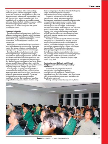 BERITAINDONESIA, 15 Juli - 15 Agustus 2010 37LENTERAberpandangan jauh dan berpikiran terbuka yangdapat mendukung aspirasi ke arahinternasionalisme maupun globalisme.Persatuan Indonesia seperti ini, akanmenghantar rakyat Indonesia memilikikebanggaan yang tulus tentang identitas merekasebagai warga negara maupun warga dunia.Pandangan dan sikap seperti ini tidak akanmelenyapkan ciri-ciri unggul suatu bangsa,malahan akan dapat memantapkan ciri-ciri uniksebuah masyarakat bangsa, yakni masyarakatbangsa yang sadar terhadap tanggung jawabglobal, bersatu dalam mewujudkan persatuanuniversal, masing-masing menyumbangkankeistimewaannya.Persatuan Indonesia seperti ini akan mampumenyingkirkan permusuhan internal bangsa,sebab pencapaiannya tidak melalui kekuatanmiliter, melainkan melalui tuntutan ilmu, danperadaban yang membudaya dalam kehidupanmasyarakat. Persatuan Indonesia yangberpegang pada prinsip bahwa kemajuankebudayaan dapat menyamai nilai-nilai universal, sehingga dapat menjadi kekuatan yang dapatmengangkat harkat martabat rakyat untukmenjadi warga negara dan seterusnya wargadunia yang baik.Kerakyatan yang Dipimpin oleh HikmatKebijaksanaan dalam Permusyawaratan/PerwakilanSuatu landasan yang harus mampumenghantar kepada prinsip-prinsiprepublikanisme, populisme, rasionalisme,demokratisme, dan reformisme yang diperteguholeh semangat keterbukaan, dan usaha ke arahkerakyatan universal.Prinsip-prinsip kerakyatan seperti ini, harusyang adil dan beradab, tidak terbatas bagipemeluk agama tertentu siapa pun denganagama apa pun dapat melakukannya. Semakinteguh seseorang menempuh kemanusiaan yangadil dan beradab, semakin rendah hati, dansemakin teguh keyakinannya semakin murahhati pula. Dalam hal ini, misi tulen agama adalahuntuk memupuk pembentukan sifat danmenggalakkan usaha menguasai diri, yaknitoleran dan damai.Persatuan IndonesiaPersatuan adalah gabungan yang terdiri atasbeberapa bagian yang telah bersatu. PersatuanIndonesia adalah suatu landasan hidup bangsaatau sistem, yang selalu mementingkansilaturahim, kesetiakawanan, kesetiaan, dankeberanian.Kehadiran Indonesia dan bangsanya di mukabumi ini bukan untuk bersengketa. Indonesiawujud dan hidup untuk mewujudkan kasihsayang sesama bangsa maupun antarbangsa.Persatuan Indonesia, bukan sebuah sikapmaupun pandangan dogmatik dan sempit,namun harus menjadi upaya untuk melihat dirisendiri secara lebih objektif dengan dunia luar.Suatu upaya untuk mengimbangi kepentingandiri dengan kepentingan bangsa lain, atau dalamtataran yang lebih mendalam antara individubangsa dan alam sejagad, yang merupakan suatuciri yang diinginkan sebagai warga dunia.Dalam jangka panjang, prinsip persatuanIndonesia harus menjadi asas ruhaniah suatuperaturan-peraturan dan struktur membangunsatu orde antarbangsa yang adil. PersatuanIndonesia harus mampu menanamkanpemikiran terbuka dan pandangan jauh bagibangsa Indonesia, sebab hanya mereka yang