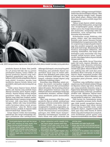 BERITAINDONESIA, 15 Juli - 15 Agustus 2010 57BERITA KESEHATANpenderita depresi di dunia. Dari jumlahitu 5,8 persen laki-laki dan 9,5 persenperempuan Namun, hanya sekitar 30persen penderita depresi yang mendapatkan pengobatan yang cukup, sekalipun telah tersedia pengobatan depresiyang efektif. Ironisnya, mereka yangmenderita depresi berada dalam usiaproduktif, yakni pada usia kurang dari 45tahun.“Tidak semua depresi harus diobatikarena ada depresi yang sembuh tanpaditerapi terutama kasus depresi ringan.Artinya, depresi hilang seiring denganperjalanan waktu. Tetapi untuk kasusdepresi yang tidak bisa sembuh sendiri,diperlukan terapi. Lamanya terapi sangatbervariasi. Ada yang hanya hitunganminggu, bahkan ada yang memerlukanwaktu bertahun-tahun untuk prosespenyembuhan,” jelas Dr. Metta yangsehari-harinya praktek di Rumah SakitIslam Pondok Kopi, Jakarta Timur.Terapi depresi terdiri dari konseling,psikoterapi dan terapi farmakologi (dengan pemakaian obat antidepresan),dukungan kelompok, serta terapi kognitif.Terkadang, para penderita depresi memerlukan rawat inap di rumah sakit.Rawat inap dilakukan pada pasien yangkurang mendapat dukungan dari lingkungan, walaupun derajat depresi yangdialaminya tergolong ringan.Konseling yang dilakukan antara psikiater dan pasien merupakan langkahawal untuk mencari akar permasalahandalam diri pasien. Hal ini penting sebelumdiberi pengobatan kejiwaan yang lain.Psikiater tak hanya mendengar tetapi jugamemberikan masukan, nasehat sebagaiupaya membantu pasien memecahkanmasalah.Obat yang umumnya diberikan padapenderita depresi adalah antidepresangolongan serotonin norepinefrin reuptakeinhibitor (SNRI). Cara kerja obat inimenghambat reuptake/pengambilan serotonin dan norepinefrine. Penelitian olehWyeth Pharmaceutical menunjukkan,golongan obat SNRI dapat mempertahankan keseimbangan sejumlah zatkimia dalam otak yakni serotonin dannorepinefrin, sehingga mencegah kekambuhan dan dan berulangnya depresi. Obatini juga bekerja dengan cepat. Dengandosis sekali sehari, efeknya telah dapatdirasakan oleh pasien setelah empat haripenggunaan.Tujuan terapi depresi adalah meningkatkan kualitas hidup pasien, mengurangiatau menghilangkan gejala, mengembalikan peran dan fungsi dalam keluargadan masyarakat, mengurangi risiko kekambuhan, serta mengurangi risikokecacatan atau kematian.Keberhasilan terapi didukung olehpasien, dokter, obat, dan masyarakat.Kendala pada pasien biasanya berupaketidakpatuhan mengonsumsi obat. Dokter yang kurang mengenali gejala depresijuga bisa memberi pengaruh yang tidakbaik pada hasil terapi. Masalah pada obatbiasanya menyangkut efektivitas, efeksamping, kemudahan, dan harga obat.Sedangkan pada masyarakat atau lingkungan adalah karena mitos, kepercayaan, dan stigma bahwa depresi identikdengan sakit jiwa.Seperti yang dirilis Jurnal Neurologipada Juli 2010, depresi diketahui meningkatkan risiko dementia (alzheimerakut) hingga 50%. Penderitanya menjadimudah lupa/pikun. Menurut Robert Wilson, psikolog dan ahli saraf dari pusatkesehatan Rush University di Chicago,depresi dapat mengubah kondisi otaksecara mendasar. Seperti diketahui, otakmerupakan pusat perasaan, emosi, danpikiran.Penelitian yang melibatkan orang-orang dewasa-tua di sebelah selatan Chicagoini dipantau selama tiga tahun. Hasilnya350 orang menderita dementia, yang sebagian besar disebabkan depresi. “Depresimengasosiasikan beberapa perubahanstruktur otak. Akibatnya, depresi membuat seseorang lebih rentan terkena dementia ketika ia sudah tua,” jelas Wilson.Oleh karena itu, kemampuan mengalami mengelola perasaan perlu diasahagar tidak mudah mengalami depresi.Seseorang dengan daya tahan mentaltinggi kurang memiliki risiko untukmenderita depresi. Jagalah kondisi fisikAnda agar tetap sehat karena di dalamtubuh yang sehat terdapat jiwa yang kuat,serta mendalami ajaran agama yangberperan menimbulkan rasa damai. DGRKenali gejala depresi sejak awal dan berusahalah untuk menolong diri Anda sendiri. Andadapat mencoba langkah-langkah berikut :1. Bersikap realistis, jangan terlalu idealis.2. Bila tugas atau pekerjaan yang menggunung,bagilah tugas-tugas itu dan buat prioritas.Lakukan tugas yang memang bisa Andakerjakan.3. Jangan memendam sendiri masalah Andaatau hanyut dengan perasaan sedih Anda.4. Cobalah curhat pada orang yang Andapercayai. Hal ini akan membuat perasaanlebih nyaman dan ringan.5. Ambil bagian dalam kegiatan-kegiatan yangbisa membuat hati Anda senang, misalberolahraga, nonton film, atau ikut dalamaktivitas sosial.6. Berusahalah untuk selalu berpikir positif.7. Jangan ragu dan malu untuk meminta bantuanpada keluarga atau teman-teman saat merasacemas, stres.8. Periksakan diri ke psikiater untuk mendapatterapi lebih lanjut agar tidak jatuh ke dalamjurang depresi.ental. WHO memperkirakan depresi akan menjadi penyebab utama masalah kematian dunia pada tahunfoto: worldlifecentre.com