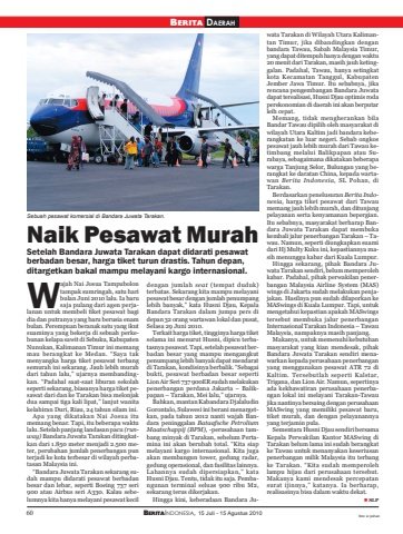 60 BERITAINDONESIA, 15 Juli - 15 Agustus 2010 foto: sl pohanNaik Pesawat MurahSetelah Bandara Juwata Tarakan dapat didarati pesawatberbadan besar, harga tiket turun drastis. Tahun depan,ditargetkan bakal mampu melayani kargo internasional.ajah Nai Josua Tampubolontampak sumringah, satu haribulan Juni 2010 lalu. Ia barusaja pulang dari agen perjalanan untuk membeli tiket pesawat bagidia dan putranya yang baru berusia enambulan. Perempuan beranak satu yang ikutsuaminya yang bekerja di sebuah perkebunan kelapa sawit di Sebuku, KabupatenNunukan, Kalimanan Timur ini memangmau berangkat ke Medan. “Saya takmenyangka harga tiket pesawat terbangsemurah ini sekarang. Jauh lebih murahdari tahun lalu,” ujarnya membandingkan. “Padahal saat-saat liburan sekolahseperti sekarang, biasanya harga tiket pesawat dari dan ke Tarakan bisa melonjakdua sampai tiga kali lipat,” lanjut wanitakelahiran Duri, Riau, 24 tahun silam ini.Apa yang dikatakan Nai Josua itumemang benar. Tapi, itu beberapa waktulalu. Setelah panjang landasan pacu (runway) Bandara Juwata Tarakan ditingkatkan dari 1.850 meter menjadi 2.500 meter, perubahan jumlah penerbangan punterjadi ke kota terbesar di wilayah perbatasan Malaysia ini.“Bandara Juwata Tarakan sekarang sudah mampu didarati pesawat berbadanbesar dan lebar, seperti Boeing 737 seri900 atau Airbus seri A330. Kalau sebelumnya kita hanya melayani pesawat kecildengan jumlah seat (tempat duduk)terbatas. Sekarang kita mampu melayanipesawat besar dengan jumlah penumpanglebih banyak,” kata Husni Djau, KepalaBandara Tarakan dalam jumpa pers didepan 32 orang wartawan lokal dan pusat,Selasa 29 Juni 2010.Terkait harga tiket, tingginya harga tiketselama ini menurut Husni, dipicu terbatasnya pesawat. Tapi, setelah pesawat berbadan besar yang mampu mengangkutpenumpang lebih banyak dapat mendaratdi Tarakan, kondisinya berbalik. “Sebagaibukti, pesawat berbadan besar sepertiLion Air Seri 737 900ER sudah melakukanpenerbangan perdana Jakarta – Balikpapan – Tarakan, Mei lalu,” ujarnya.Bahkan, mantan Kabandara DjalaludinGorontalo, Sulawesi ini berani menargetkan, pada tahun 2012 nanti wajah Bandara peninggalan Bataafsche PetroliumMaatschappij (BPM), -perusahaan tambang minyak di Tarakan, sebelum Pertamina ini akan berubah total. “Kita siapmelayani kargo internasional. Kita jugaakan membangun tower, gedung radar,gedung operasional, dan fasilitas lainnya.Lahannya sudah dipersiapkan,” kataHusni Djau. Tentu, tidak itu saja. Pembangunan terminal seluas 900 ribu M2,sekarang terus dikerjakan.Hingga kini, keberadaan Bandara Juwata Tarakan di Wilayah Utara Kalimantan Timur, jika dibandingkan denganbandara Tawau, Sabah Malaysia Timur,yang dapat ditempuh hanya dengan waktu20 menit dari Tarakan, masih jauh ketinggalan. Padahal, Tawau, hanya setingkatkota Kecamatan Tanggul, KabupatenJember Jawa Timur. Itu sebabnya, jikarencana pengembangan Bandara Juwatadapat terealisasi, Husni Djau optimis rodaperekonomian di daerah ini akan berputarleih cepat.Memang, tidak mengherankan bilaBandar Tawau dipilih oleh masyarakat diwilayah Utara Kaltim jadi bandara keberangkatan ke luar negeri. Sebab ongkospesawat jauh lebih murah dari Tawau ketimbang melalui Balikpapan atau Surabaya, sebagaimana dikatakan beberapawarga Tanjung Selor, Bulungan yang berangkat ke daratan China, kepada wartawan Berita Indonesia, SL Pohan, diTarakan.Berdasarkan penelusuran Berita Indonesia, harga tiket pesawat dari Tawaumemang jauh lebih murah, dan ditunjangpelayanan serta kenyamanan bepergian.Itu sebabnya, masyarakat berharap Bandara Juwata Tarakan dapat membukakembali jalur penerbangan Tarakan – Tawau. Namun, seperti diungkapkan suamidari Hj Multy Kuku ini, kepastiannya masih menunggu kabar dari Kuala Lumpur.Hingga sekarang, pihak Bandara Juwata Tarakan sendiri, belum memperolehkabar. Padahal, pihak perwakilan penerbangan Malaysia Airline System (MAS)wings di Jakarta sudah melakukan penjajakan. Hasilnya pun sudah dilaporkan keMASwings di Kuala Lumpur. Tapi, untukmengetahui kepastian apakah MASwingstersebut membuka jalur penerbanganInternasional Tarakan Indonesia – TawauMalaysia, nampaknya masih panjang.Makanya, untuk memenuhi kebutuhanmasyarakat yang kian mendesak, pihakBandara Juwata Tarakan sendiri menawarkan kepada perusahaan penerbanganyang menggunakan pesawat ATR 72 diKaltim. Tersebutlah seperti Kalstar,Trigana, dan Lion Air. Namun, sepertinyaada kekhawatiran perusahaan penerbangan lokal ini melayani Tarakan-Tawaujika nantinya bersaing dengan perusahaanMASwing yang memiliki pesawat baru,tiket murah, dan dengan pelayanannyayang terjamin pula.Sementara Husni Djau sendiri bersamaKepala Perwakilan Kantor MASwing diTarakan belum lama ini sudah berangkatke Tawau untuk menanyakan keseriusanpenerbangan milik Malaysia itu terbangke Tarakan. “Kita sudah memperolehlampu hijau dari perusahaan tersebut.Makanya kami mendesak percepatansurat ijinnya,” katanya. Ia berharap,realisasinya bisa dalam waktu dekat. SLPWSebuah pesawat komersial di Bandara Juwata Tarakan.BERITA DAERAH