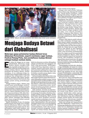 foto: jakarta.go.id BERITAINDONESIA, 15 Juli - 15 Agustus 2010 63BERITA BUDAYAMenjaga Budaya Betawidari GlobalisasiBeberapa upaya pelestarian budaya Betawi terusdilakukan Pemerintah, seperti membuka cagar budaya,Festival Palang Pintu, dan pendaftaran budaya Betawisebagai budaya warisan dunia.ra tahun 80 hingga 90-an wargaJabodetabek, khususnya wargaIbukota Jakarta, mungkin tidakada yang tidak mengetahui seni budaya ondel-ondel dan lenong sebagai senibudaya leluhur Betawi, suku bangsapenduduk asli Ibukota Jakarta. Namunsebaliknya, di era millenium ketiga ini,mungkin hanya tinggal sedikit orang yangmengenal dan mengetahui soal senitersebut. Demikian juga halnya denganbudaya Betawi lainnya, kini banyak yanghampir punah seiring perkembanganzaman.Sebagai ibukota negara, Jakarta yangmenjadi pusat perkembangan modernisasi, pusat pembauran sekaligus menjadipusat perubahan, memang mendapat tantangan ekstra besar dalam pelestarian budaya ini. Seperti dikatakan Ketua III Badan Musyawarah Betawi DKI, Beky Mardani, pelestarian kebudayaan Betawi merupakan permasalahan yang cukup kompleks. Karena, tantangan yang dihadapibukan hanya pengaruh budaya nasionaltapi juga internasional.Seperti disebutkan di atas, di sampingsudah bergeser dari fungsi awal, semakinbanyak kebudayaan Betawi yang tidakdapat dinikmati masyarakat saat ini. Senipertunjukan ondel-ondel misalnya, senidengan boneka besar setinggi dua meterlebih ini sebenarnya awalnya difungsikansebagai penolak bala atau gangguan rohhalus yang gentayangan. Belakangan,ondel-ondel biasa digunakan untuk menambah semarak pesta-pesta rakyat seperti peresmian gedung baru atau untukpenyambutan tamu terhormat. Kini, seniini bahkan semakin jarang digelar walaupada pesta rakyat sekalipun.Seni pertunjukan khas Betawi lain yangdulu sangat terkenal namun kini hanya sesekali ditampilkan adalah Lenong. Lenongmerupakan teater tradisional Betawi yangdiiringi musik gambang kromong, musikkhas Betawi. Lakon atau skenario lenongumumnya mengandung pesan moral,seperti menolong yang lemah, membencikerakusan dan perbuatan tercela.Pada mulanya, kesenian ini dipertunjukkan dengan mengamen dari kampungke kampung. Pertunjukan diadakan di lapangan terbuka tanpa panggung. Ketikapertunjukan berlangsung, salah seorangaktor atau aktris mengitari penontonsambil meminta sumbangan secara sukarela. Dalam perkembangannya, lenongmulai dipertunjukkan atas permintaanpelanggan dalam acara-acara di panggunghajatan seperti resepsi pernikahan. Diawal kemerdekaan, teater rakyat ini punmenjadi tontonan panggung. Namunseperti seni budaya lainnya, lenong kinisudah semakin jarang digelar.Sebagai suku yang terbuka, beberapabudaya Betawi juga dipengaruhi budayaluar. Musik Betawi misalnya, sudahdipengaruhi budaya Tionghoa. Hal tersebut dapat ditemukan pada penggunaanalat musik khas Tionghoa seperti tehyan,kongahyang, dan sukong.Tidak hanya seni budaya musik dan tariyang terancam tergerus akibat arusglobalisasi. Tapi juga budaya lain sepertipertanian, arsitektur, serta tata carapernikahan yang disebut Palang Pintu.Kawasan Condet misalnya, daerah yangdahulu dikenal sebagai penghasil salakdan duku, serta wilayah pemeliharaterakhir bangunan khas Betawi, kinikondisinya terabaikan. Budaya PalangPintu juga sedikit banyak telah mengalamipenggerusan.Pemprov DKI Jakarta sendiri sebenarnya telah melakukan berbagai upaya.Salah satunya adalah menetapkan Festival Palang Pintu sebagai festival tahunanyang dilaksanakan di Jalan Kemang Raya.Selain itu, belum lama ini cagar budayaBetawi juga dibuka di Setu Babakan,Jagakarsa, Jakarta Selatan. Di objekwisata yang bersetting perkampunganBetawi itu, segala macam hal yang identikdengan kebudayaan Betawi, mulai dariseni pertunjukkan seperti tari topeng danLenong, adat pernikahan, beragam panganan khas seperti kerak telor, bir pletokserta Roti Buaya yang sering dijadikanhantaran dalam upacara pernikahan, jugadapat ditemui di sini.Tak ketinggalan seni bela diri, silat Betawi juga ditampilkan di tempat ini. Dalamrangka memperkenalkan kesenian Betawipada generasi muda, kursus tari tradisionalBetawi juga diadakan di sana. Dan untukprogram berkelanjutan, pemerintah DKIjuga akan memasukkan seni budaya Betawike dalam kurikulum sekolah.Baru-baru ini, upaya melestarikan senibudaya Betawi juga dilakukan PemerintahDKI Jakarta dengan usaha mematenkanseni budaya Betawi sebagai warisanbudaya negara Indonesia, khususnya kotaJakarta. Sebagai langkah awal, PemprovDKI telah mendaftarkan seni tari LenongBetawi kepada Kementerian Kebudayaandan Pariwisata sebagai salah satu warisantak benda yang diakui secara internasional. Setelah lulus seleksi nasional,kemudian akan diajukan menjadi salahsatu kebudayaan yang akan didaftarkansebagai warisan budaya tak benda padaUnited Nations Educational, Scientificand Cultural Organization (UNESCO).Selain tari Lenong, tari topeng Betawijuga ikut didaftarkan. Tetapi karena taritopeng juga didaftarkan oleh provinsi lain,maka tari itu didaftarkan menjadi taritopeng nasional, bergabung dengan taritopeng dari daerah lainnya. MRAEPALANG PINTU: Sebuah tata cara pernikahan adat Betawi yang hampir punah dihidupkankembali.