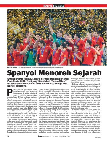 64 BERITAINDONESIA, 15 Juli - 15 Agustus 2010BERITA OLAHRAGASpanyol Menoreh SejarahUntuk pertama kalinya, Spanyol berhasil mengangkat TropiPiala Dunia 2010. Tropi yang diperoleh di “Benua Hitam”itu sekaligus mematahkan mitos bahwa Eropa hanya bisajuara di benuanya.artai puncak perhelatan pestasepakbola Piala Dunia 2010 yangberlangsung di Afrika Selatan 11Juni-12 Juli lalu, mencatatkansejarah baru. Untuk pertama kalinya,Spanyol berhasil tampil sebagai juarasetelah mengalahkan Belanda 1-0 di finalyang dilangsungkan di stadion Soccer CityStadium, Johannesburg. Spanyol mencatatkan diri sebagai negara kedelapan yangpernah menjadi juara sejak Piala Duniadiselenggarakan pada tahun 1930. Tujuhnegara sebelumnya yang bergantianmengangkat tropi piala yakni Uruguay (2),Italia (4), Jerman (3), Brasil (5), Inggris(1), Argentina (2), dan Prancis (1).Gol tunggal kemenangan Spanyol tercipta pada menit 116 atau empat menitsebelum pertandingan usai pada babakkedua pertambahan waktu, lewat tendangan Andres Iniesta. Belum lamasebelumnya, tim Belanda dipaksa bermain sepuluh pemain akibat dihukumnyaJohn Heitinga dengan kartu kuning kedua(kartu merah), yang memaksanya haruskeluar lapangan. Hukuman itu sekaligusmenjadi awal petaka bagi Giovanni vanBronckhors dan kawan-kawan, hinggatetinggal 1-0. Dan menguburkan impianBelanda untuk merengkuh sebagai juaradunia 2010 yang telah dinantikan sejak 32tahun. Tim ‘orange’ sebelumnya pernahmenjadi finalis pada tahun 1974, namunkalah dari Jerman Barat. Kemudian padatahun 1978, namun kalah dari Argentina.Spanyol yang kerap memperagakanteknik ‘taka tiki’, yang mempertontonkansepabola indah, kompak, rapi dan terorganisir dalam setiap melakukan pergerakan, membuat Belanda sulit menembus pertahanan Spanyol. Penguasaanlini tengah dengan passing dinamis dancerdas disertai terobosan kreatif, sekaligusmenjadi ciri khas negeri Matador tersebutmembuat tontonan jadi atraktif danmenarik. Belanda dalam pertandingandibuat kesulitan sehingga kerap mengandalkan passing-passing jauh, untukmencegah Spanyol melakukan operanoperan pendek. Namun itu pun bisadipatahkan Spanyol.Belanda sebenarnya sempat diunggulkan karena dalam babak penyisihan grupmeraih kemenangan sempurna dalamenam pertandingan. Namun keberuntungan sepertinya belum berpihak untuklolos menjadi juara. Saat pertandinganantara Spanyol dan Belanda berlangsung,dua peluang yang dimiliki oleh Belandatidak bisa maksimal dimanfaatkan. Yangmenurut sang pelatih, Bert van Marwijk,bisa menghasilkan gol lewat aksi ArjenRobben yang tinggal berhadap-hadapandengan kiper Iker Casillas. Namun gagaldieksekusi dengan baik.Berbeda dengan Spanyol, pada saatpartai pembukaan awal sempat jugatersandung dan kalah dari Swiss 1-0.Namun evaluasi cepat yang dilakukansang pelatih Vicente Del Bosque membuattim yang dijuluki ‘Lam Furia Roja’ segerabangkit, hingga 2 pertandingan sisadibabak fase pertama mereka memenangkan seluruhnya. Juara Eropa 2008tersebut akhirnya mendapatkan tempatutama di final, setelah mereka berhasilmengalahkan Jerman 1-0. Mereka bertemu Belanda di final, yang sebelumnyaPJUARA BARU: Tim Spanyol sedang merayakan pesta kemenangan juara piala dunia.foto: fifa.com