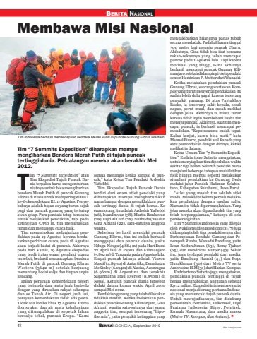 48 BERITAINDONESIA, September 2010BERITA NASIONALMembawa Misi NasionalTim “7 Summits Expedition” diharapkan mampumengibarkan Bendera Merah Putih di tujuh puncaktertinggi dunia. Petualangan mereka akan berakhir Mei2012.im “7 Summits Expedition” atauTim Ekspedisi Tujuh Puncak Dunia terpaksa harus mengendurkanniatnya untuk bisa mengibarkanbendera Merah Putih di puncak GunungElbrus di Rusia untuk memperingati HUTke-65 kemedekaan RI, 17 Agustus. Penyebabnya adalah hujan es yang turun sejakpagi dan puncak gunung yang tertutupawan gelap. Para pendaki tetap berusahauntuk melakukan pendakian, tapi padaketinggian 5.350 m, tim memutuskanturun dan menunggu cuaca baik.Tim memutuskan melanjutkan pendakian pada 19 Agustus kerena berdasarkan perkiraan cuaca, pada 18 Agustusakan terjadi badai di puncak. Akhirnyapada hari Kamis, 19 Agustus ekspedisiyang terdiri atas enam pendaki utamatersebut, berhasil menancapkan benderaMerah Putih di puncak Gunung ElbrusWestern (5642 m) setelah berjuangmenantang badai salju dan tiupan anginkencang.Inilah perayaan kemerdekaan negeriyang tertunda dan tentu jauh berbedadengan yang dirasakan rakyat sebangsadan se Tanah Air. Di negeri jauh ini,perayaan kemerdekaan tidak ada pesta.Tidak ada lomba khas 17 Agustus. Cumadoa syukur dan air mata kebahagiaanyang ditumpahkan di sepetak lahanbersalju tebal, puncak Eropa. “Kamisemua menangis ketika sampai di puncak,” kata Ketua Tim Pendaki ArdeshirYaftebbi.Tim Ekspedisi Tujuh Puncak Duniaterdiri dari enam atlet pendaki yangdiharapkan mampu mengharumkannama bangsa dengan menaklukkan puncak tertinggi dunia di tujuh benua. Keenam orang itu adalah Ardeshir Yaftebbi(26), Iwan Irawan (38), Martin Rimbawan(28), Fajri Al Lutfi (28), Nurhuda (28) danGina Afriani (22), satu-satunya anggotawanita.Sebelum berhasil mendaki puncakGunung Elbrus, tim ini sudah berhasilmenggapai dua puncak dunia, yaituNdugu-Ndugu (4.884 m) pada Hari Bumi22 April lalu di Papua dan Kilimanjaro(5.892 m) di Tanzania pada 1 Agustus lalu.Empat puncak lainnya adalah VinsonMassif (4.897m) di Antartika, Denali atauMcKinley (6.194m) di Alaska, Aconcagua(6.962m) di Argentina dan terakhirSagarmatha atau Everest (8.850m) diNepal. Ketujuh puncak dunia tersebutdidaki dalam kurun waktu April 2010sampai Mei 2012.Pendakian gunung yang telah dilakukantidaklah mudah. Ketika melakukan pendakian puncak Gunung Kilimanjaro, GinaAfriani, wanita satu-satunya dari enamanggota tim, sempat terserang “hipothermia”, yaitu penyakit ketinggian yangmengakibatkan hilangnya panas tubuhsecara mendadak. Padahal hanya tinggal300 meter lagi menuju puncak Uhuru.Akibatnya, Gina tidak bisa ikut bersamarekan-rekannya yang telah mencapaipuncak pada 1 Agustus lalu. Tapi karenamotivasi yang tinggi, Gina akhirnyaberhasil mencapai puncak Gunung Kilimanjaro setelah didampingi oleh pendakisenior Hendricus F. Mutter dari Wanadri.Ketika melakukan pendakian puncakGunung Elbrus, seorang wartawan Kompas yang turut menyertai pendakaian itusudah lebih dulu gagal karena terserangpenyakit gunung. Di atas PastukhovRocks, ia terserang sakit kepala, sesaknapas, perut mual, dan susah melihatdengan jelas. Akhirnya ia minta turunkarena tidak ingin membebani usaha timmenuju puncak. Akhirnya, saat tim mencapai puncak, ia berhasil mencapai pemondokan. “Keputusanmu sudah tepat.Kalau lanjut, kamu bisa mati,” kataManuel Pizarro, pendaki asal Kanada yangsatu pemondokan dengan dirinya, ketikamelihat ia datang.Ketua Umum Tim “7 Summits Expedition” Endriartono Sutarto mengatakan,untuk menyiapkan tim diperlukan waktusekitar tiga bulan. Seluruh pendaki harusmenjalani beberapa tahapan mulai latihanfisik hingga mental seperti melakukansimulasi pendakian ke Gunung Gedemelalui jalur Pondok Halimun-Selabintana, Kabupaten Sukabumi, Jawa Barat.“Atlet yang masuk tim adalah atletmuda. Mereka ini belum pernah melakukan pendakian dengan medan salju.Namun itu tidak dipermasalahkan. Yangjelas mereka akan dipandu oleh tim yangtelah berpengalaman,” katanya di selapemberangkatan.Tim 7 Summits Indonesia yang dilepasoleh Wakil Presiden Boediono (21/7) jugadidampingi oleh tiga pendaki senior dariPerhimpunan Pendaki Gunung dan Penempuh Rimba, Wanadri Bandung, yaituIwan Abdurahman (63), Remy Tjahari(65), dan Hendricus Mutter (49). Selainitu, juga terdapat pendaki dari media,yaitu Bambang Hamid (47) dan PopoNurakhman (30) dari Metro TV sertaAmbrosius H.M (31) dari Harian Kompas.Endriartono Sutarto juga mengatakan,pendakian puncak tertinggi di tujuhbenua menghabiskan anggaran sebesarRp 12 miliar. Ekspedisi ini membawa misinasional menjadi orang pertama Indonesia yang memuncaki tujuh puncak dunia.Untuk mewujudkannya, tim didukungpemerintah, Pertamina, Telkomsel, TuguPratama Indonesia, Eiger, Pointrek,Rumah Nusantara, dan media massa(Metro TV, Kompas, dan Antara). Tfoto: kompas.comTim Indonesia berhasil menancapkan bendera Merah Putih di puncak Gunung Elbrus Western.