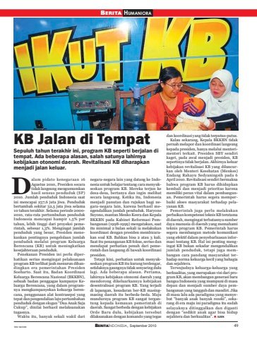 BERITAINDONESIA, September 2010 49BERITA HUMANIORAfoto: berindoKB Jalan di TempatDSepuluh tahun terakhir ini, program KB seperti berjalan ditempat. Ada beberapa alasan, salah satunya lahirnyakebijakan otonomi daerah. Revitalisasi KB diharapkanmenjadi jalan keluar.alam pidato kenegaraan 16Agustus 2010, Presiden secaratidak langsung mengumumkanhasil sensus penduduk (SP)2010. Jumlah penduduk Indonesia saatini mencapai 237,6 juta jiwa. Pendudukbertambah sekitar 32,5 juta jiwa selama10 tahun terakhir. Selama periode 2000-2010, rata-rata pertumbuhan pendudukIndonesia mencapai hampir 1,5% pertahun, lebih tinggi dari proyeksi pemerintah, sebesar 1,3%. Mengingat jumlahpenduduk yang besar, Presiden menekankan pentingnya pengelolaan jumlahpenduduk melalui program KeluargaBerencana (KB) untuk meningkatkankesejahteraan penduduk.Penekanan Presiden ini perlu diperhatikan serius mengingat pelaksanaanprogram KB terlihat jauh menurun dibandingkan era pemerintahan PresidenSoeharto. Saat itu, Badan KoordinasiKeluarga Berencana Nasional (BKKBN),sebuah badan penggagas kampanye Keluarga Berencana, yang dalam programnya mengkampanyekan keluarga berencana, penggunaan alat kontrasepsi yangtepat dan pengendalian laju pertambahanpenduduk dengan slogan “Dua Anak SajaCukup”, dinilai berhasil melaksanakantugasnya.Waktu itu, banyak sekali wakil darinegara-negara lain yang datang ke Indonesia untuk belajar tentang cara menyukseskan program KB. Mereka terjun kedesa-desa, bertanya dan ingin melihatsecara langsung. Ketika itu, Indonesiamenjadi panutan dan rujukan bagi negara-negara lain, karena berhasil mengendalikan jumlah penduduk. HaryonoSuyono, mantan Menko Kesra dan KepalaBKKBN pada Kabinet Reformasi Pembangunan (1998-1999) mengatakan, saatitu minimal 2 bulan sekali ia melakukankoordinasi dengan presiden membicarakan soal KB. Bahkan bisa 2 atau 3 kali.Saat itu penanganan KB fokus, serius danmendapat perhatian penuh dari pemerintah dan langsung di bawah koordinasipresiden.Tetapi kini, perhatian untuk menyukseskan program KB itu kurang terdengar,setidaknya gaungnya tidak senyaring dululagi. Ada beberapa alasan. Pertama,lahirnya kebijakan otonomi daerah yangmendorong dikeluarkannya kebijakandesentralisasi program KB. Yang terjadidi lapangan, kesadaran ber-KB masingmasing daerah itu berbeda-beda. Majumundurnya program KB sangat tergantung kepada kemauan pemerintah didaerah. Sangat berbeda dengan kebijakanOrde Baru dulu, kebijakan tersebutdilaksanakan dengan komando yang tegasdan koordinasi yang tidak terputus-putus.Kalau sekarang, Kepala BKKBN tidakpernah melapor dan koordinasi langsungkepada presiden, hanya melalui menterimenteri terkait. Presiden SBY sendirikaget, pada awal menjadi presiden, KBsepertinya tidak berjalan. Akhirnya keluarkebijakan revitalisasi KB yang diluncurkan oleh Menteri Kesehatan (Menkes)Endang Rahayu Sedyaningsih pada 6April 2010. Revitalisasi sendiri bermaknabahwa program KB harus dihidupkankembali dan menjadi prioritas karenamemiliki peran vital dalam pembangunan. Pemerintah harus segera memperbaiki akses masyarakat terhadap pelayanan KB.Pemerintah juga perlu melakukanperbaikan kompetensi teknis KB terutamadi daerah, mengingat terbatasnya sumberdaya manusia di daerah yang memahamiteknis program KB. Pemerintah harussegera membangun metode komunikasiyang efektif dalam penyebarluasan informasi tentang KB. Hal ini penting mengingat KB bukan sekadar mengendalikanjumlah penduduk, tetapi juga membangun cara pandang masyarakat terhadap norma keluarga kecil yang bahagiadan sejahtera.Terwujudnya keluarga-keluarga yangberkualitas, yang merupakan visi dari program KB, akan membangun generasi barubangsa Indonesia yang mumpuni di masadepan dan menjadi sumber daya pembangunan yang tangguh dan mandiri. Jikadi masa lalu ada paradigma yang menyebut “banyak anak banyak rezeki”, sekarang di era maju ini paradigma itu sudahselayaknya ditinggalkan dan digantidengan “sedikit anak agar bisa hidupsejahtera dan berkualitas”. AHS