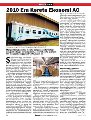 54 BERITAINDONESIA, September 2010 foto-foto: dok. samsuri2010 Era Kereta Ekonomi ACMengembangkan citra melalui penguasaan teknologidengan berbagai inovasi produk, seperti Kereta EkonomiAC, menjadi keunggulan PT. INKA saat ini.ebagai perusahaan yang bergerakdi bidang produk kereta api, namaPT INKA di dalam dan luar negeri,khususnya di Asean dan Bangladesh memiliki brand image tersendirikarena kualitas dan keandalan produknya. Di Bangladesh misalnya, keretabuatan perusahaan yang berlokasi diMadiun ini sudah akrab dengan masyarakat pengguna jasa kereta di sana.Kepercayaan konsumen luar negeri terhadap produk PT. INKA semakin baik.Apresiasi di dalam negeri juga sama.Buktinya, perhatian pemerintah kepadaINKA makin meningkat, hal itu terlihatdari pesanan berbagai jenis kereta, diantaranya Kereta Ekonomi AC. “Kita punberharap kerja sama dengan PT. KAsebagai operator kereta api di Indonesiamakin baik di masa mendatang, sepertitahun-tahun sebelumnya, dimana INKApernah mendapat kepercayaan membuatkereta Argo,” kata Gunesti Wahyu Handiko, Direktur Komersial PT. INKA.Lebih jauh Gunesti mencontohkan, diMalaysia, sejak dekade 90-an keretaekonomi dilengkapi dengan pendinginAC. Sementara di Indonesia, ketika PT.INKA membuat konsep KRL kelas ekonomi AC, yakni KRL-AC untuk kelas bisnisdan ekspres, operator kita sempat menolak. Tapi, sewaktu KRL- AC SudirmanEkspres dioperasikan, terbukti peminatnya banyak. Kini KRL Ekonomi AC sudahdioperasikan oleh Kereta Commuter Jabodetabek (KCJ). Dimana saat peresmianKRL seri 05 tanggal 19 Agustus 2010 yanglalu, sistem AC diisi dengan hidro karbonsebagai pengganti freon yang tidak ramahlingkungan.Jadi kebijakan Dirjen Perkeretaapianuntuk meningkatkan pelayanan KeretaEkonomi AC, menurut Gunesti sangattepat. Ia bahkan menyebut, tahun 2010merupakan era Kereta Ekonomi AC.Khusus mengenai armada kereta baruproduksi PT INKA untuk angkutan Lebaran tahun ini, menurut Gunesti, tidaksebanyak tahun lalu, yaitu 75 kereta penumpang. Tahun 2010, baru satu rangkaian, terdiri dari 10 kereta penumpangdan 1 kereta makan/pembangkit listrikyang seluruhnya dilengkapi AC.“Dari nilai Rp45 milyar yang didasarkanpada kontrak dari Satker KementerianPerhubungan dengan dana DIPA 2010,sebanyak 13 unit kereta ekonomi AC tipeK3 dan 3 unit kereta ekonomi makan danpembangkit listrik tipe KMP3 dengan nilaiRp12 milyar, sisanya akan diserahkanakhir tahun 2010,” tuturnya.Secara spesifik ia menjelaskan, keretaekonomi AC yang baru ini memilikitempat duduk 2-2, lebih longgar dibanding sebelumnya 2-3. Untuk tempatduduk, tiap kereta menampung 80 penumpang dari sebelumnya 106 penumpang. AC seperti yang digunakan padakereta kelas eksekutif diimpor dari Jepang. Namun, dengan adanya AC, kebutuhan listrik bertambah sehingga genset yang digunakan lebih besar yaitu 250KVA, dibanding sebelumnya 35 KVA.Desain pada jendela, sistem kabel dansebagainya juga tentu ada perubahan.Dari segi tampilan, KA baru ini beda, interior dan eksteriornya didominasi warnaputih, hijau, dan biru mendekati warnalambang Kementerian Perhubungan.Jauh lebih menarik dan keren.Meski kereta ber-AC, pada saat kondisiemergency, kipas angin dan jendela disetiap ujung bisa digunakan, disesuaikankondisi penumpang kelas ekonomi. Melalui pendingin ruangan, pengguna jasaKA ekonomi seperti dimanja layaknyanaik di kereta ekseskutif.Menurut Gunesti, KA ekonomi AC iniadalah ide Dirjen Perkeretaapian Kementerian Perhubungan, Tunjung Inderawan.Jadi, INKA mengimplementasi ide itu.Pengembangan Citra GlobalKe depan, PT. INKA katanya akan terusmengembangkan citra dan mutu produk.Baru-baru ini, PT. INKA mendapat kontrak sebanyak 12 kereta penumpang dan2 kereta pembangkit listrik senilai 4,6 jutadolar AS dari Ara Rail, pabrik kereta apiMalaysia. PT. INKA akan mengirim badankereta dan bodi untuk dirakit oleh AraRail, sedangkan kereta pembangkit diekspor utuh (Complete Built Up). Keretapenumpang pesanan pemerintah Malaysia yang dioperasikan oleh KTMB sebagaioperator KA Malaysia tersebut akan dikirim pada 2011.Pada tahun yang sama, PT. INKA jugamenyelesaikan pesanan LTA Singapuramelalui Hitachi sebanyak 20 unit gerbongdatar.Akhir tahun ini, menurut Gunesti, PT.INKA juga diharapkan oleh mitranya diBangladesh untuk mengikuti tender 100kereta penumpang. Sebelumnya, Bangladesh Railways telah mengoperasikan 50kereta buatan PT. INKA untuk jalurinternasional menuju Kalkuta. Keretapenumpang buatan PT. INKA dianggapandal dan interiornya rapi dibandingkankereta yang dioperasikan di India. RISInterior kereta ekonomi dengan pendingin ACdan kipas.Kereta penumpang kelas ekonomi dilengkapi pendingin AC tahun 2010.BERITA PUBLIK