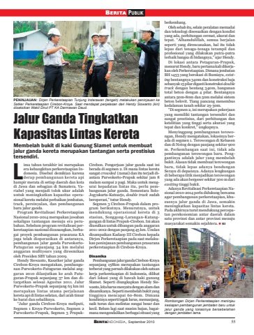 BERITAINDONESIA, September 2010 55Jalur Ganda TingkatkanKapasitas Lintas KeretaMembelah bukit di kaki Gunung Slamet untuk membuatjalur ganda kereta merupakan tantangan serta prestisiustersendiri.ima tahun terakhir ini merupakanera kebangkitan perkeretaapian Indonesia. Disebut demikian karenaderap pembangunan kereta apihampir merata di setiap daerah dan kotadi Jawa dan sebagian di Sumatera. Variabel yang menjadi tolok ukur adalahuntuk meningkatkan kapasitas operasional kereta melalui perbaikan jembatan,track, persinyalan, dan pembangunanbaru jalur ganda.Program Revitalisasi PerkeretaapianNasional 2010-2014 merupakan jawabansekaligus tantangan menuju era perubahan. Sebelum program revitalisasi perkeretaapian nasional dicanangkan, berbagai proyek pembangunan prasarana KAjuga telah dioperasikan di antaranya,pembangunan jalur ganda PurwokertoPatuguran sepanjang 34 km melaluianggaran multiyears yang diresmikanoleh Presiden SBY tahun 2009.Hendy Siswanto, Kasatker jalur gandaCirebon-Kroya mengatakan, pembangunan Purwokerto-Patuguran melalui anggaran 2010 dilanjutkan ke arah Patuguran-Prupuk sepanjang 37 km dan ditargetkan selesai Agustus 2011. JalurPurwokerto-Prupuk sepanjang 65 km inimerupakan lintas utama perjalanankereta api di lintas selatan, dari arah timurke barat dan sebaliknya.“Jalur ganda Cirebon-Kroya meliputi,Segmen 1 Kroya-Purwokerto, Segmen 2Purwokerto-Prupuk, Segmen 3 PrupukCirebon. Pengerjaan jalur ganda saat iniberada di segmen 2. Di mana lintas keretasangat crowded (ramai) dan itu terjadi diantara Purwokerto-Prupuk sekitar jam 8malam sampai 2 pagi. Maka untuk mengurai kepadatan lintas itu, perlu pembangunan jalur ganda. Sementara SoloJogyakarta-Kutoarjo, double track sudahberoperasi,” tutur Hendy.Segmen 3 Cirebon-Prupuk dalam program berikutnya. Menurutnya, untukmendukung operasional kereta di 3stasiun, Songgong-Larangan-Katanggungan di lintas Prupuk-Cirebon. Ini akandiusulkan untuk dibangun pada anggaran2011-2012 dengan panjang 45 km. Usulandisampaikan Kadaop III Cirebon kepadaDirjen Perkeretaapian pada saat melakukan peninjauan pembangunan prasaranaperkeretaapian di Cirebon-Kroya.DinamikaPembangunan jalur ganda Cirebon-Kroyasepanjang 158km merupakan tantanganterberat yang pernah dilakukan oleh satuankerja perkeretaapian di Indonesia, dilihatdari lokasi yang di bawah kaki gunungSlamet. Seperti diungkapkan Hendy Siswanto, kita harus menyatu dengan alam dandinamikanya. Seperti membelah bukit yangtingginya mencapai 60-80m. Dimanakondisinya seperti tegak lurus, memanjang,naik turun dan melintas sungai besar dankecil. Belum lagi saat musim hujan, bagaimana mengendalikan berbagai situasi yangberkembang.Oleh sebab itu, selain peralatan memadaidan teknologi disesuaikan dengan kondisiyang ada, perhitungan cermat, akurat dantepat. “Alhamdulillah, semua berjalanseperti yang direncanakan, hal itu tidaklepas dari tenaga-tenaga terampil danprofesional yang dilakukan putra-putraterbaik bangsa di bidangnya,” ujar Hendy.Di lokasi antara Petaguran-Prupuk,menurut Hendy, baru pertama kali dikerjakan oleh Perkeretaapian. Dimana jembatanBH 1453 yang berokasi di Bumiayu, existing bentangnya 340m dan konstruksi bajasebanyak 15 pilar diganti konstruksi doubletrack dengan bentang 340m, bangunantotal beton dengan 4 pilar. Bentangnyaantara 50m-80m dan 50m melalui sistembeton belovit. Tiang pancang menembuskedalaman tanah sekitar 25-30m.“Di segmen 2, ini merupakan pekerjaanyang memiliki tantangan tersendiri dansangat prestisius, dari perhitungan danketelitian yang tinggi serta akurasi yangtepat dan konkret,” ungkapnya.Menyinggung pembangunan terowongan, Hendy mengatakan, lokasinya berada di segmen 1. Terowongan di Kebasendan di Notog dengan panjang sekitar 900m. Perkembangan saat ini, tidak adapembangunan terowongan baru. Penggantinya adalah jalur yang membelahbukit. Alasan tidak membuat terowonganbaru, tidak lepas adanya bendunganSerayu di depannya. Adanya lengkungandi beberapa titik menjadikan terowonganyang ada akan bergeser sekitar 300 m dariexsiting tinggi bukit.Adanya Revitalisasi Perkeretaapian Nasional 2010-2014 perlu didukung bersamaagar pembangunan perkeretaapian, khususnya jalur ganda di Jawa, semakinmeningkatkan kapasitas lintas kereta.Pada akhirnya turut mendukung percepatan perekonomian antar daerah dalamsatu provinsi dan antar provinsi menujumasyarakat semakin sejahtera. RILPENINJAUAN: Dirjen Perkeretaapian Tunjung Inderawan (tengah) melakukan peninjauan keSatker Perkeretaapian Cirebon-Kroya. Saat mendapat penjelasan dari Hendy Siswanto (kiri)disaksikan Wakil Dirut PT KA Darmawan Daud.Rombongan Dirjen Perkeretaapian meninjaukesiapan pembangunan jembatan baru untukjalur ganda yang lokasinya bersebelahandengan jembatan lama.BERITA PUBLIK