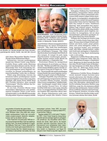 BERITAINDONESIA, September 2010 57yang berlaku di Amerika dan ajaran Islam.Dia juga pendiri lembaga Masyarakat Amerikauntuk Kemajuan Islam, yang salah satu visinyaadalah mempersatukan muslim dan nonmuslimmelalui program-program akademik, kebijakan,budaya, dan isu-isu terbaru lainnya.Imam Feisal lahir di Kuwait pada 1948 dan orang tuanya berasal dari Mesir. Ayah dan kakeknyaseorang imam. Dia pernah bersekolah di Inggrisdan Malaysia. Pada usia 17 tahun, dia pindah keAmerika untuk meraih gelar sarjana fisika dari Columbia University, New York. Setelah menjadi gurudan bekerja di perusahaan real estate, dia mulaimempelajari sufisme. Pada 1983, dia mulaimemimpin peribadatan di masjidnya dekat WTC,di permukiman TriBecca.Sepekan setelah WTC runtuh pada 11 September 2001, Imam Feisal langsung mengundangsejumlah pemuka berbagai agama ke pengajianrutin jamaahnya. Dia menyatakan bahwa Islamterbuka dan ramah. Sejak saat itu, dia menjadiperhatian sejumlah organisasi nasional daninternasional untuk menjelaskan Islam dalamberbagai pandangan. Beberapa kali dalam tigatahun terakhir ini, Departemen Luar Negeri ASmengirim Imam Feisal ke sejumlah negara untukmenjelaskan bagaimana Islam dipandang diAmerika.oleh Ketua Masyarakat Muslim CentralFlorida Imam Muhammad Musri.Sebenarnya, rencana pembangunanmasjid dan Islamic Center yang disebutCordoba House sudah mulai ditentangsejak 6 Juni silam dimana saat itu, DewanMasyarakat New York menyokong rencana pembangunan pusat kegiatan masyarakat itu dengan perbandingan 29suara berbanding 1 suara dan 10 abstain.Pihak yang menentang rencana ituberalasan bahwa pembangunan masjiddan pusat kegiatan masyarakat yang akandipimpin oleh Imam Faisal Abdul Raufdari Cordoba Initiative, akan menjadi“kemenangan” Muslim militan dan kekalahan orang Amerika.Di sisi lain, Presiden Obama tetapmenyatakan dukungannya atas pembangunan kompleks seluas 9.300 meterpersegi tersebut. Ia rela dikritik masyarakatAS yang sekitar 78 persen warganya adalahumat Kristiani. Obama menegaskan bahwadukungannya itu murni berlandaskantoleransi. “Jika Anda bisa membangunsebuah gereja di tempat tertentu, Anda punbisa membangun sinagoge. Jika Andadiperkenankan membangun kuil Hindu disatu tempat, di tempat itu pula Andadiperkenankan membangun masjid,”tandas mantan senator muda Illinois itudalam pidatonya, 11 September lalu.Pernyataan Obama itu memperkuatpernyataannya di awal bulan suci Ramadan lalu, “Muslim memiliki hak yang samauntuk mempraktikkan agama mereka sama seperti orang lain di negara ini,” katanya. “Itu termasuk hak untuk membanguntempat ibadah dan pusat kegiatan masyarakat di properti swasta di Manhattan.”Golongan Republik yang terkenal konservatif langsung mengomentari dukungan Presiden Obama tersebut. SenatorJohn Cornyn mengatakan “tidaklah bijaksana” membangun masjid dekat tempatyang disebut Ground Zero. Di lokasitersebut lebih dari 2.600 warga Amerikatewas. Ia menggambarkan Presiden Obama terputus dari mayoritas rakyat Amerika, dengan dukungannya pada pembangunan masjid dan Islamic Centerdekat Ground Zero tersebut.Sedangkan, Walikota New York MichaelBloomberg mengatakan dalam sebuahkonferensi pers bahwa pemerintah seharusnya tidak campur tangan dalam masalah agama. Ia mengatakan, menghentikanpembangunan masjid dan pusat kegiatanmasyarakat hanya karena lokasinya duablok dari tempat di mana “kebebasandiserang” akan merupakan hari menyedihkan bagi seluruh negara. WalikotaBloomberg dan pihak-pihak yang mendukung pembangunan pusat kegiatan masyarakat itu mengatakan, hal ini akanmenjembatani perbedaan pendapat antara pihak Barat dan dunia Muslim.Terlepas dari berbagai pro kontra yangmuncul, Cordoba House tetap akan dibangun. Di sana akan terdapat sebuah auditorium 500 kursi, teater, pusat pertunjukan seni, pusat kebugaran, kolam renang, lapangan basket, area penitipananak, toko buku, sekolah kuliner, studioseni, food court, peringatan 11 September,dan ruang doa yang dapat menampung1.000-2.000 orang.Bangunan Cordoba House akan menggantikan gaya bangunan Italia 1850-anyang rusak dalam serangan 11 September2001. Bangunan ini akan berada dua blokdari situs World Trade Center di Manhattan tapi bangunan ini tidak akan terlihatdari situs ini. Beberapa media beritamenyebutnya dengan “Masjid GroundZero”.Sebenarnya Cordoba House disiapkanuntuk menjadi tempat bertemu paramusuh sebenarnya dari Muslim militan,yaitu Muslim arus utama. Ia akan menjaditanda perlawanan internal terhadap tiraniyang coba diterapkan sekelompok kecilteroris terhadap komunitas Muslim yanglebih luas, yang cita-cita utamanya adalahtoleransi dan perdamaian. Nama CordobaHouse terilhami oleh kota abad pertengahan di Spanyol, Kordova, di mana orangKristen, Yahudi dan Muslim hidup sejahtera bersama selama 800 tahun. CIDBERITA MANCANEGARAwan Buddha Jun Yasuda (tengah) dan Gyoju Ishivashi,g pembangunan Islamic Center, dua blok dari GroundKONTROVERSI: Imam Muhammad Musri(kanan), dari Islamic Society of Central Florida,berbicara dalam konferensi pers bersamaPendeta Terry Jones dari Dove World OutreachCenter, di Gainesville, Florida, 9/9/2010.